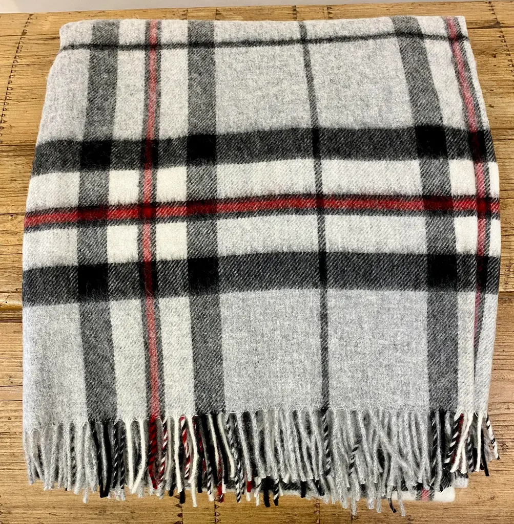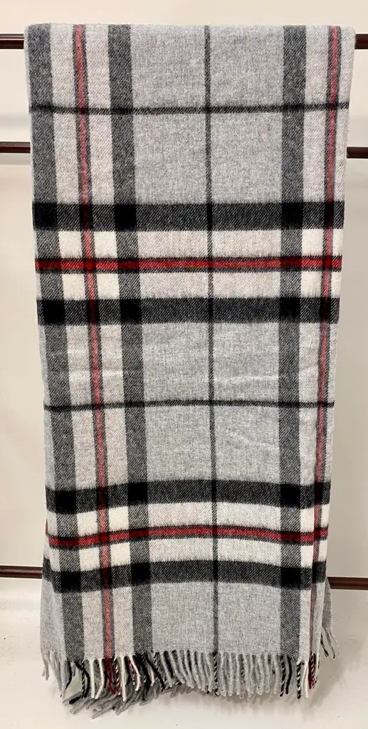 Super Soft Merino Wool Throw In A Burberry-Like Grey Plaid Pattern. Made In England