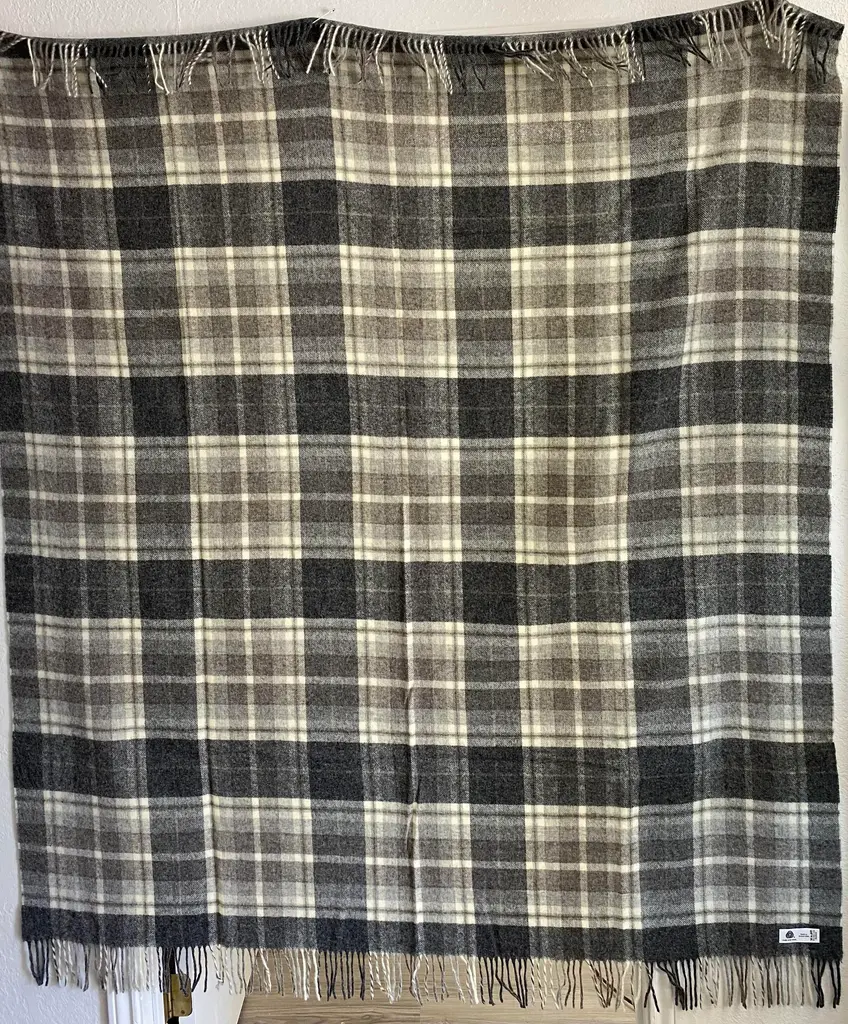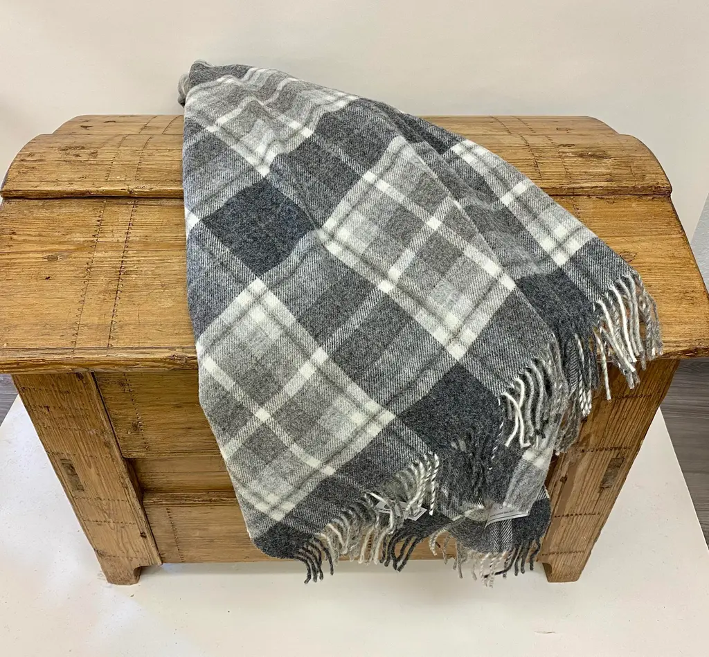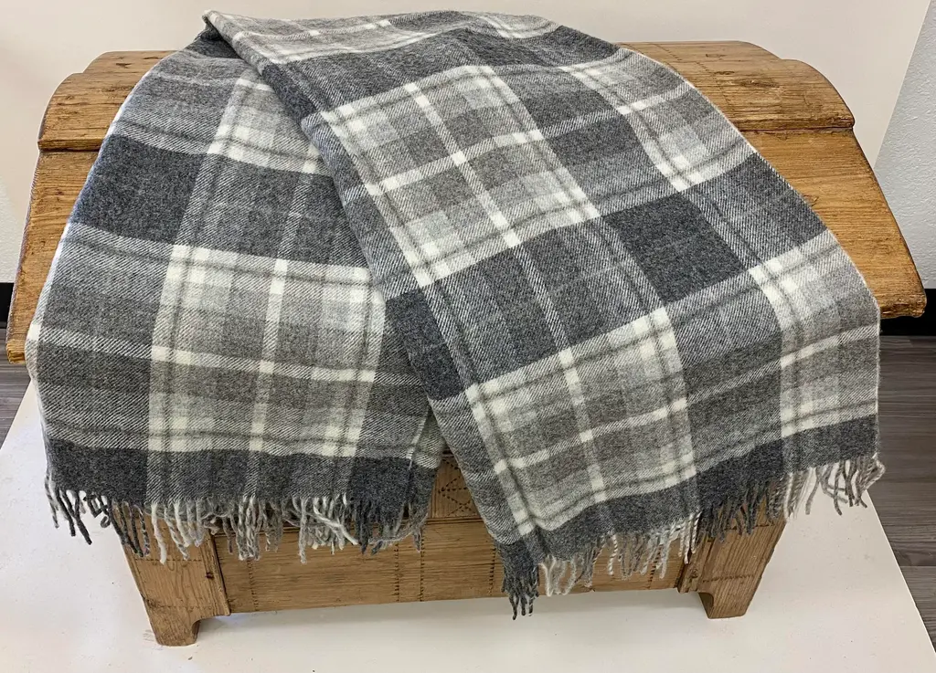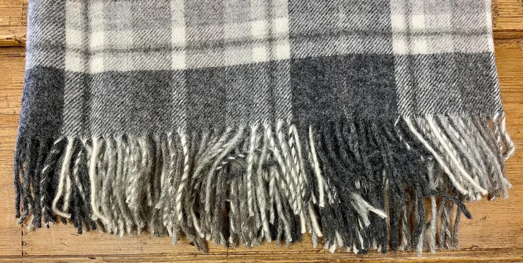 Super Soft Merino Wool Throw In a Masculine Grey on Grey Plaid Pattern. Made in England A versatile throw in a masculine plaid pattern. The colors are grey, black, white & blue. It is made in England. Established in 1837 with over 180 years of proud British manufacturing & design heritage. already to our name, The are one of Great Britain’s last remaining vertical woolen mills. The term ‘vertical’ is a throwback to the Victorian era when mills would rise several stories, with each floor containing separate parts of the manufacturing process. Today it remains a unique confirmation of our authenticity; we control every stage of production from raw wool to finished product including Dyeing, Blending, Carding, Spinning, Warping, Weaving, and Finishing. They create their products with a balance between innovative design & traditional craft, maintaining their position at the forefront of commercial trends with consistent high quality. Perfect for a wedding gift or a birthday gift. Can also be worn like a shawl. Size = Approx 66 inches x 58 inches, not including the fringe. Dry clean.