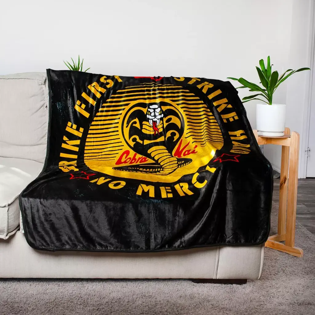 Show off your love of the hit series Cobra Kai with this warm and cozy fleece throw blanket! Officially licensed blanket is soft to the touch; made up of 100% polyester material. It's also easy to clean, machine wash with cold water is highly recommended. Fun and functional, this throw blanket makes the perfect addition to any bedroom decor!