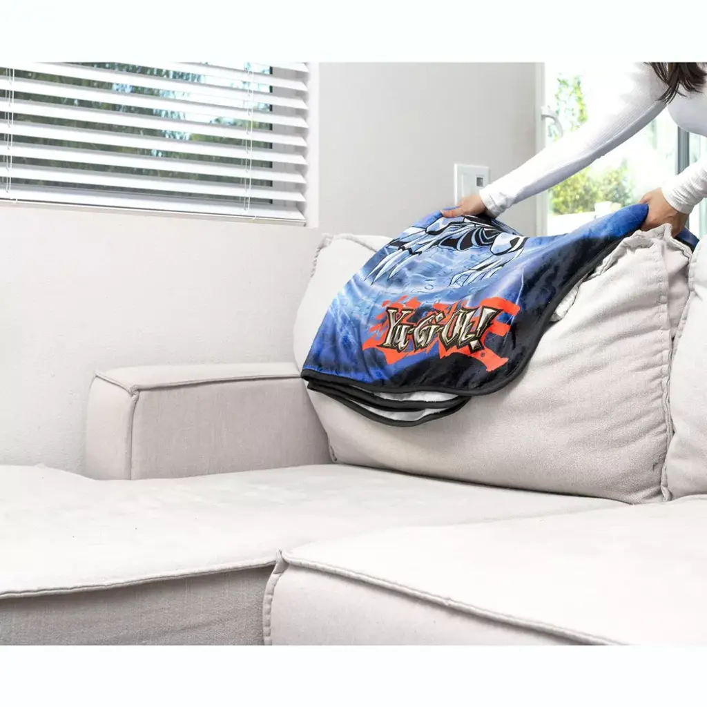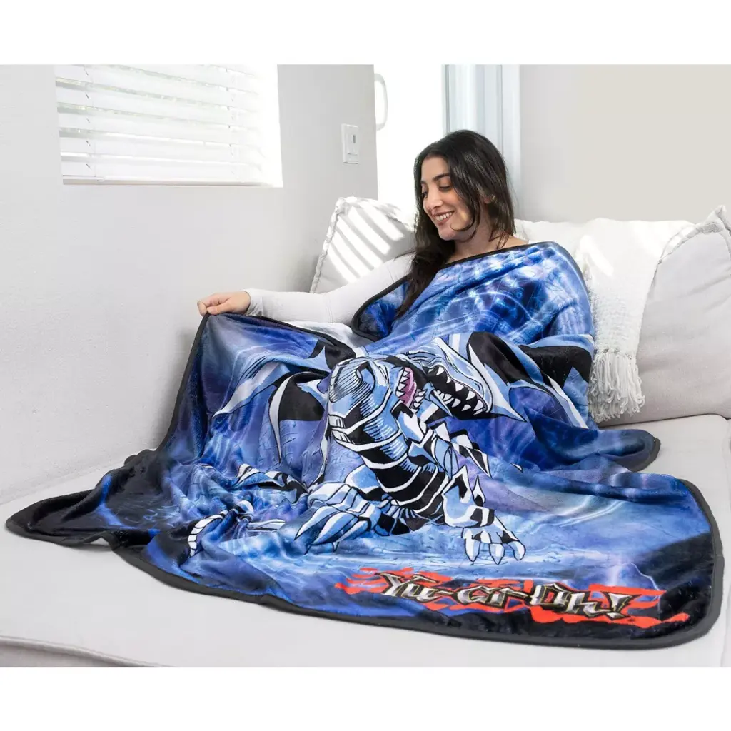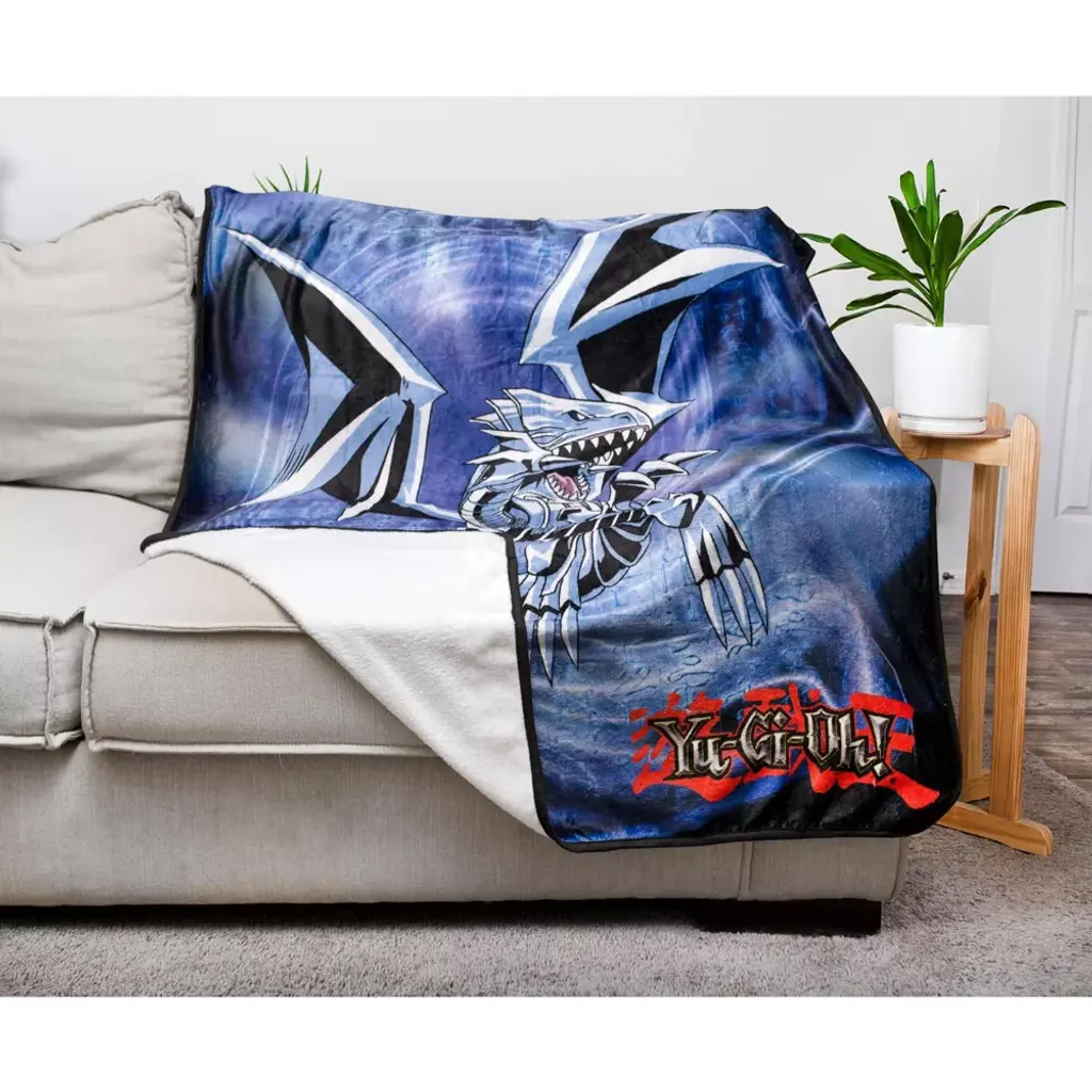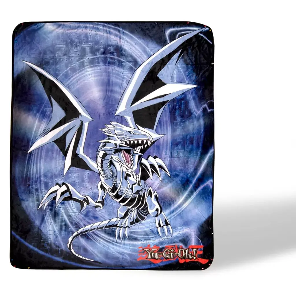 Show off your love of Yu-Gi-Oh! with this warm and cozy throw blanket! Featuring Blue-Eyes White Dragon, this fun throw blanket is soft to the touch, made up of 100% polyester material and measures a roomy 45 by 60 inches. Lastly, it's also easy to clean, machine wash with cold water is highly recommended. Officially licensed. A Toynk exclusive!