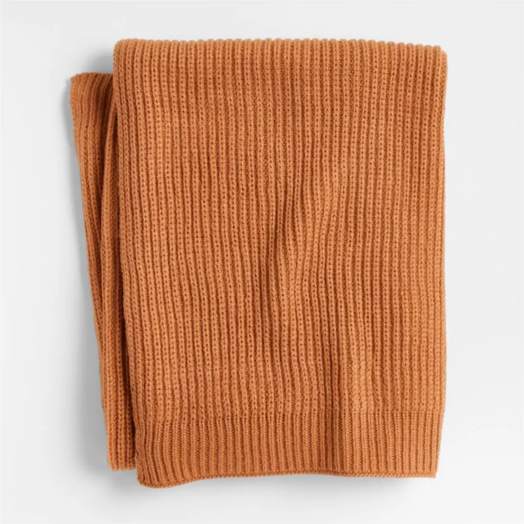 A trio of knitting stitches unite in a throw blanket with a wealth of texture and coziness. Durable acrylic yarn in warm brown lends warmth to autumn and winter decor, pairing effortlessly with a palette of neutrals, colorful patterns or bold blacks and whites. Evoking the cuffs of a favorite sweater, the wide-ribbed border finishes the throw with a graphic striped pattern. Drape our exclusive ocher sweater-knit throw blanket over the arm of a sofa or the foot of the bed so indulgent warmth and comfort is always right at hand.