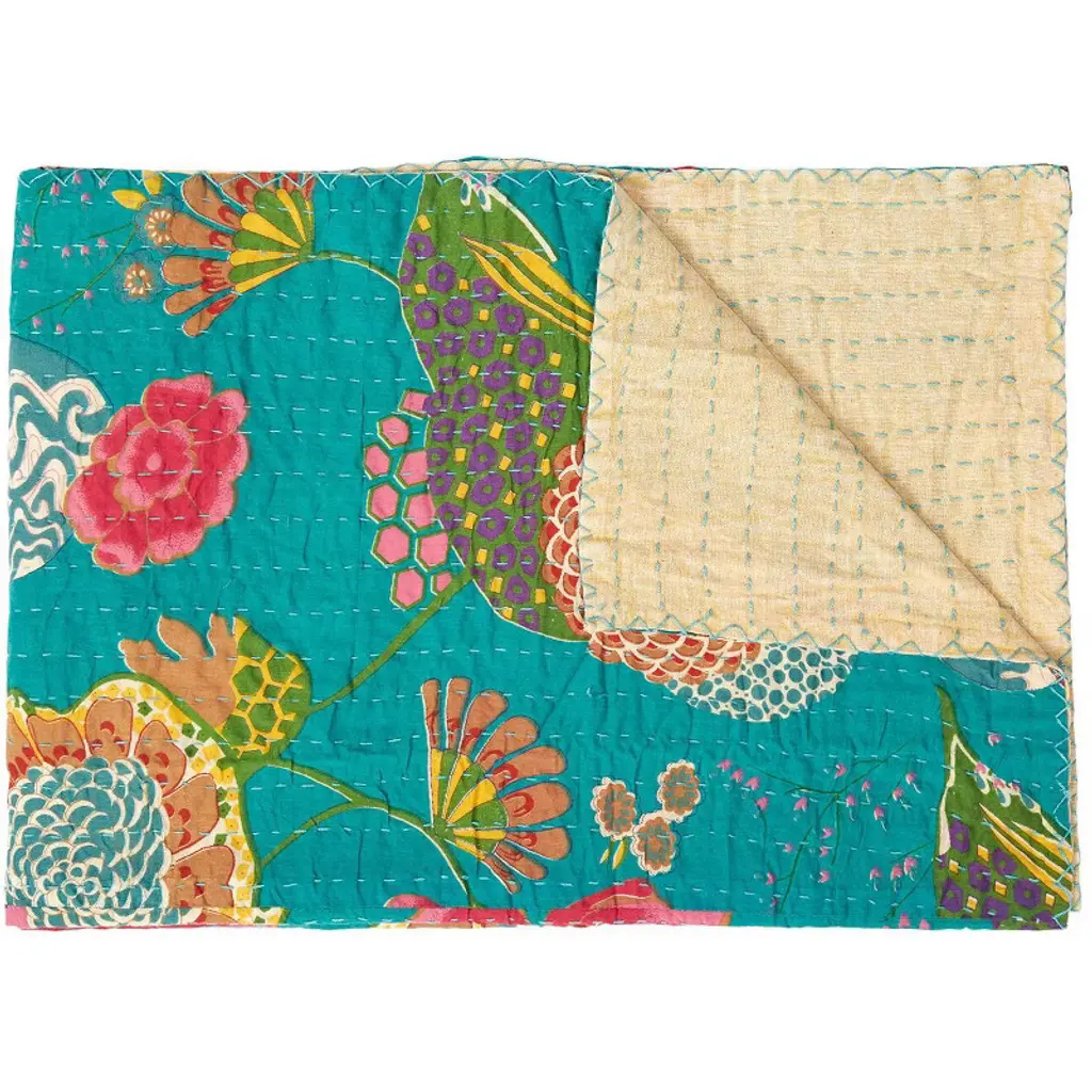 An elegant patchwork of vibrant design with an airy, lightweight feel, the Kantha series is visibly unique. Kantha embroidery is a time-honored technique practiced for centuries by skilled Indian artisans. Each piece is hand-crafted from several layers of cotton or silk held together by a running “Kantha” stitch. The luxurious materials, rich colors, vintage artistry and one-of-a-kind beauty will elevate your decor and infuse individuality to any space. Features: 100% Cotton / Hand crafted / Technique: Quilted / Size: 50x70 / Country of origin: India / Can be used in a variety of ways: as a blanket, table cover, wall hanging, tapestry, beach cover and more / Hand wash cold water / Some variance in size and color may occur due to the one-of-a-kind vintage nature of this product
