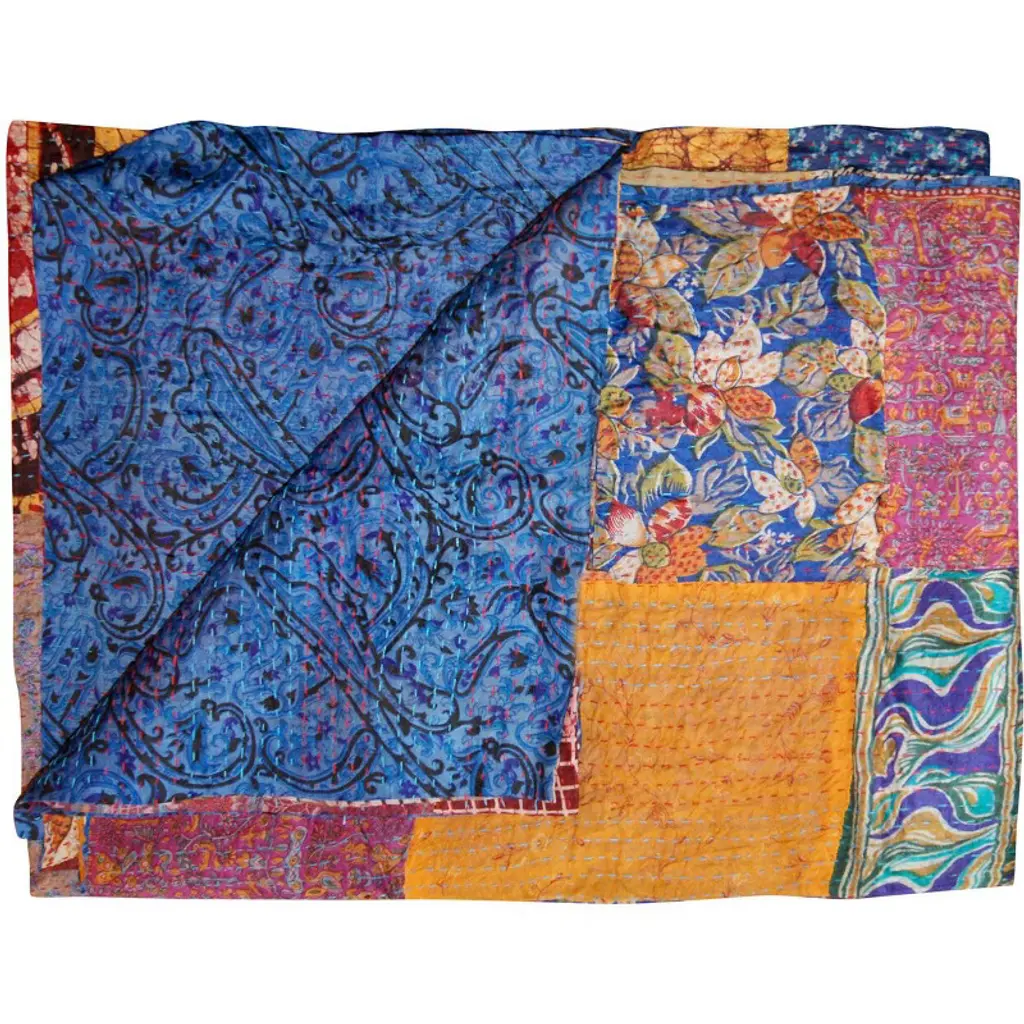 An elegant patchwork of vibrant design with an airy, lightweight feel, the Kantha series is visibly unique. Kantha embroidery is a time-honored technique practiced for centuries by skilled Indian artisans. Each piece is hand-crafted from several layers of cotton or silk held together by a running “Kantha” stitch. The luxurious materials, rich colors, vintage artistry and one-of-a-kind beauty will elevate your decor and infuse individuality to any space. Features: Silk Blend / Hand crafted / Technique: Quilted / Size: 50x60 / Country of origin: India / Can be used in a variety of ways: as a blanket, table cover, wall hanging, tapestry, beach cover and more / Hand wash cold water / Some variance in size and color may occur due to the one-of-a-kind vintage nature of this product