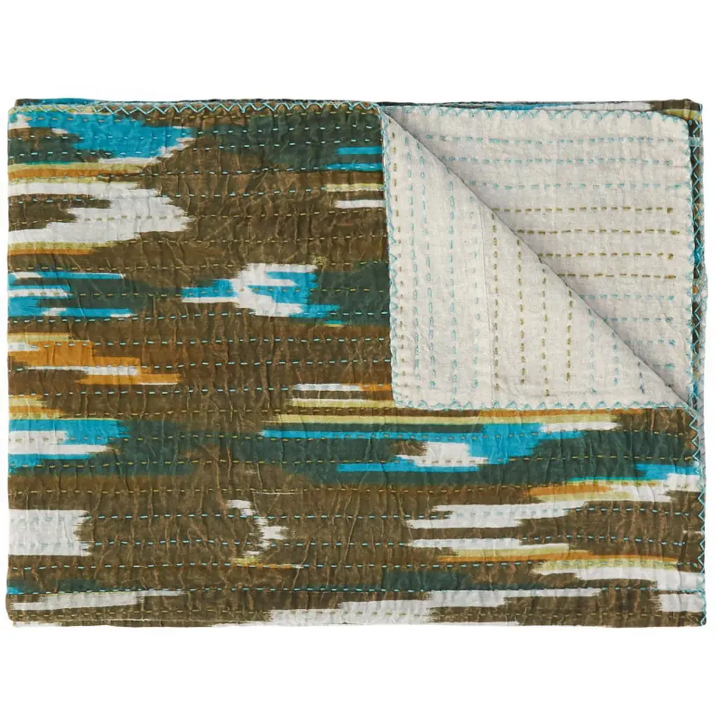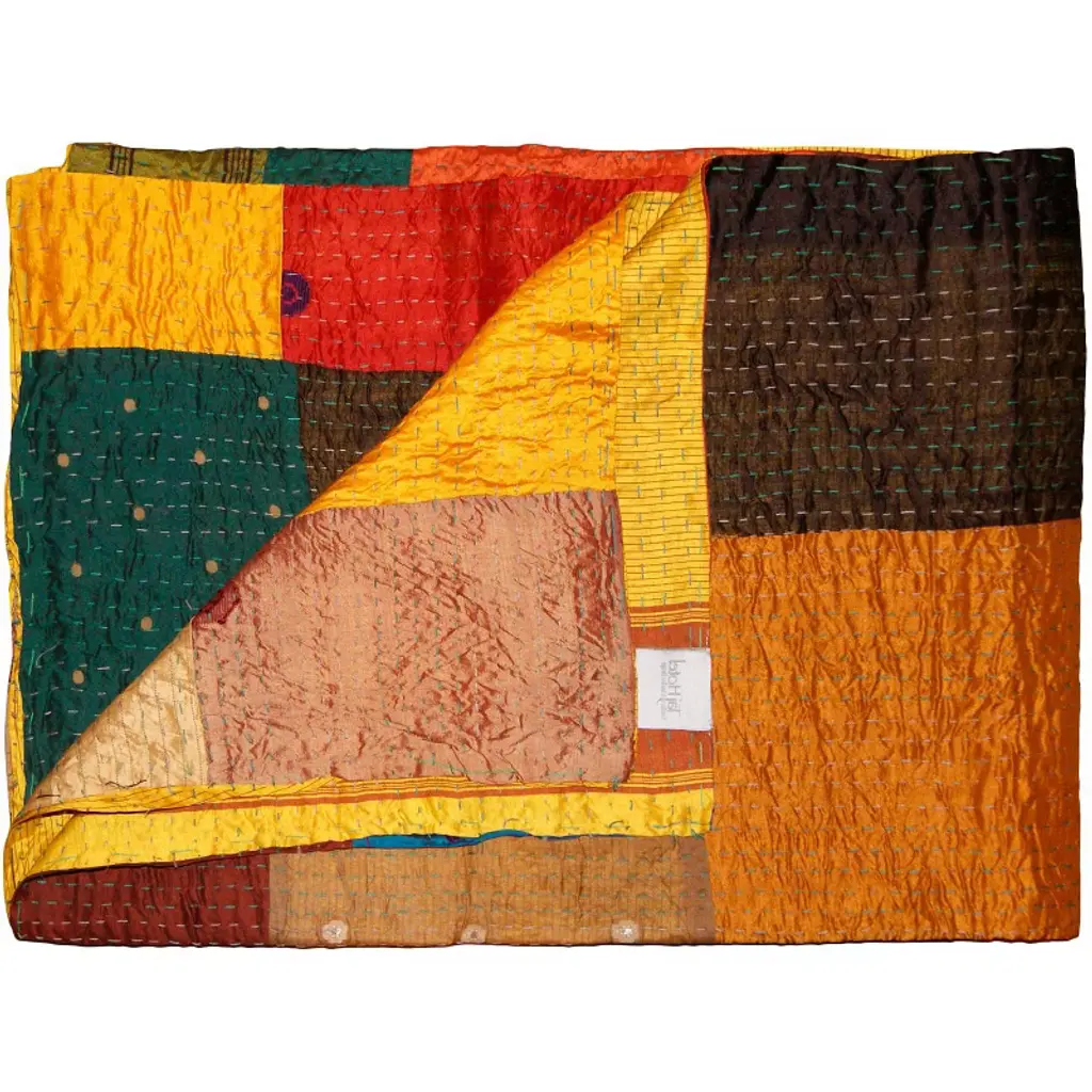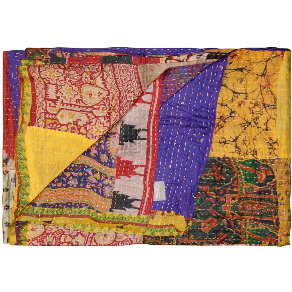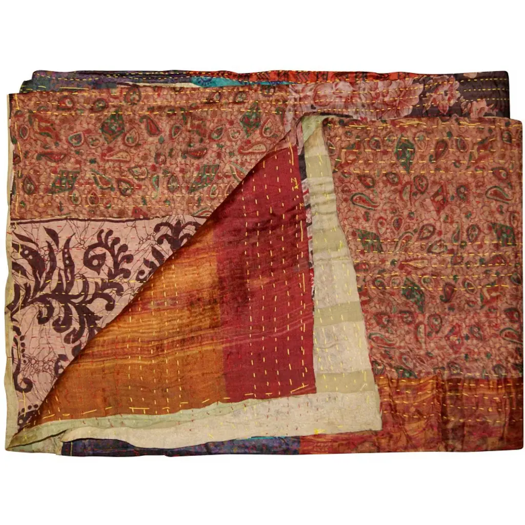 An elegant patchwork of vibrant design with an airy, lightweight feel, the Kantha series is visibly unique. Kantha embroidery is a time-honored technique practiced for centuries by skilled Indian artisans. Each piece is hand-crafted from several layers of cotton or silk held together by a running “Kantha” stitch. The luxurious materials, rich colors, vintage artistry and one-of-a-kind beauty will elevate your decor and infuse individuality to any space. Features: Silk Blend / Hand crafted / Technique: Quilted / Size: 50x60 / Country of origin: India / Can be used in a variety of ways: as a blanket, table cover, wall hanging, tapestry, beach cover and more / Hand wash cold water / Some variance in size and color may occur due to the one-of-a-kind vintage nature of this product