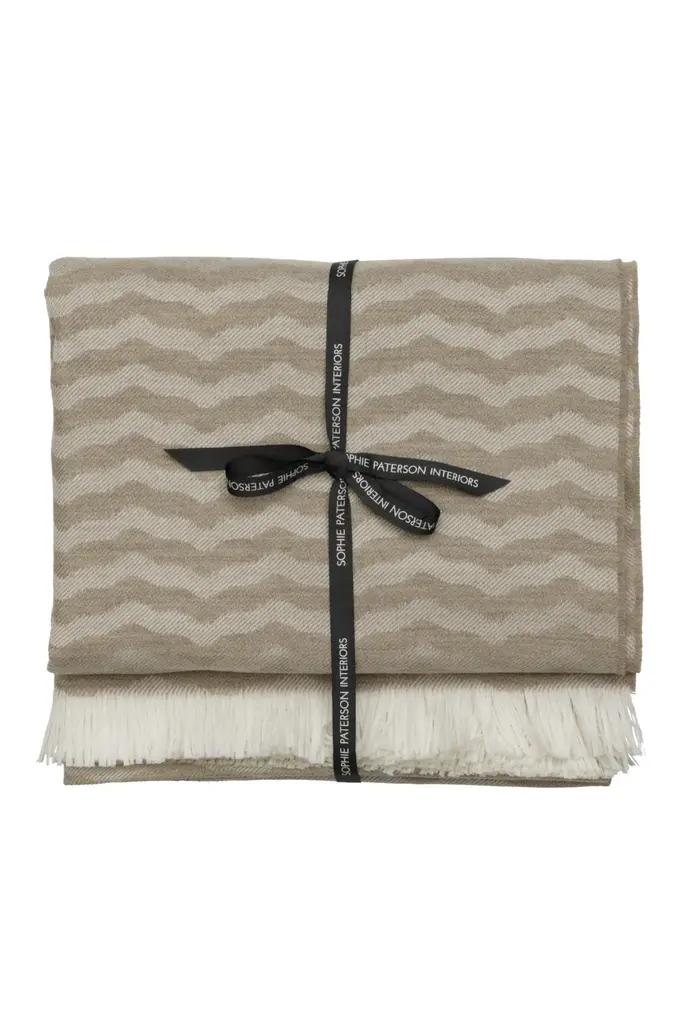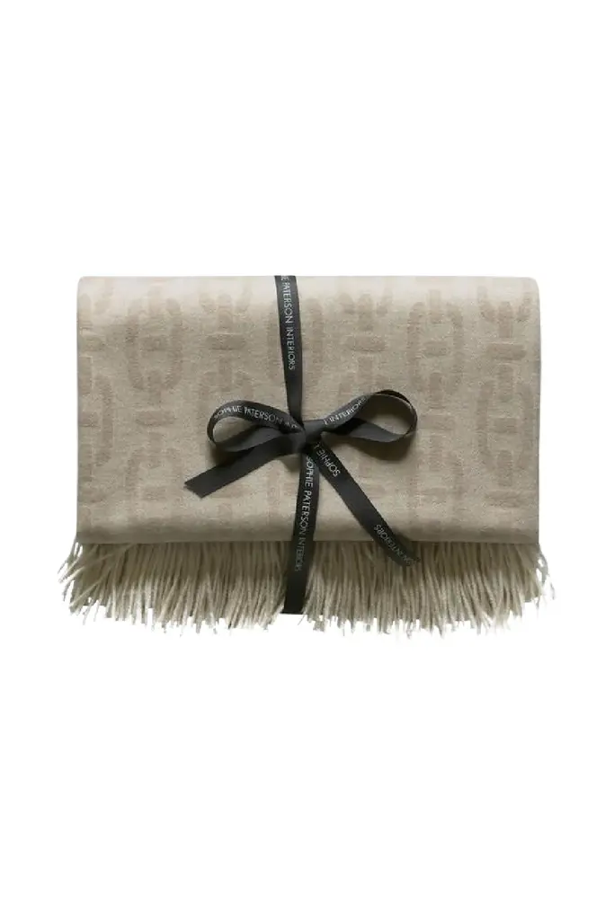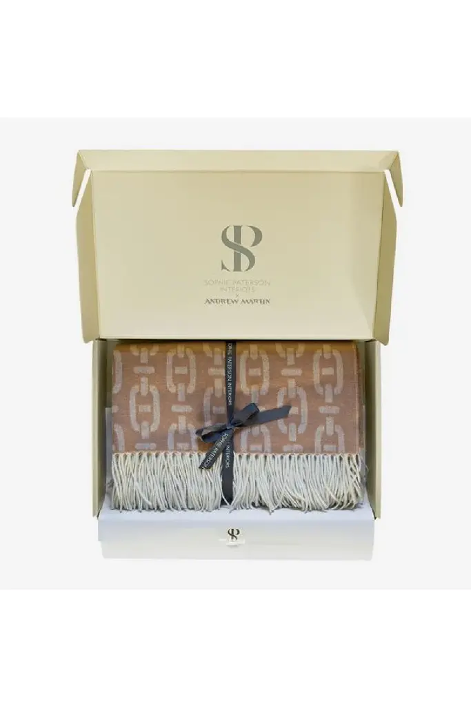 Perfect for adding a chic layer to any bed, sofa, or chair this soft and luxurious throw has fringed edges and was woven in Italy from 90% Merino wool and 10% cashmere. In a warm tan shade, this throw by Andrew Martin features our popular Burlington pattern, designed in collaboration with Sophie Paterson and inspired by the grand architecture of Mayfair's Burlington arcade. Each throw comes individually boxed and wrapped in tissue paper with ribbon.
