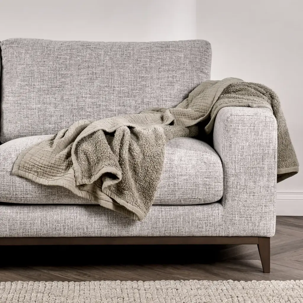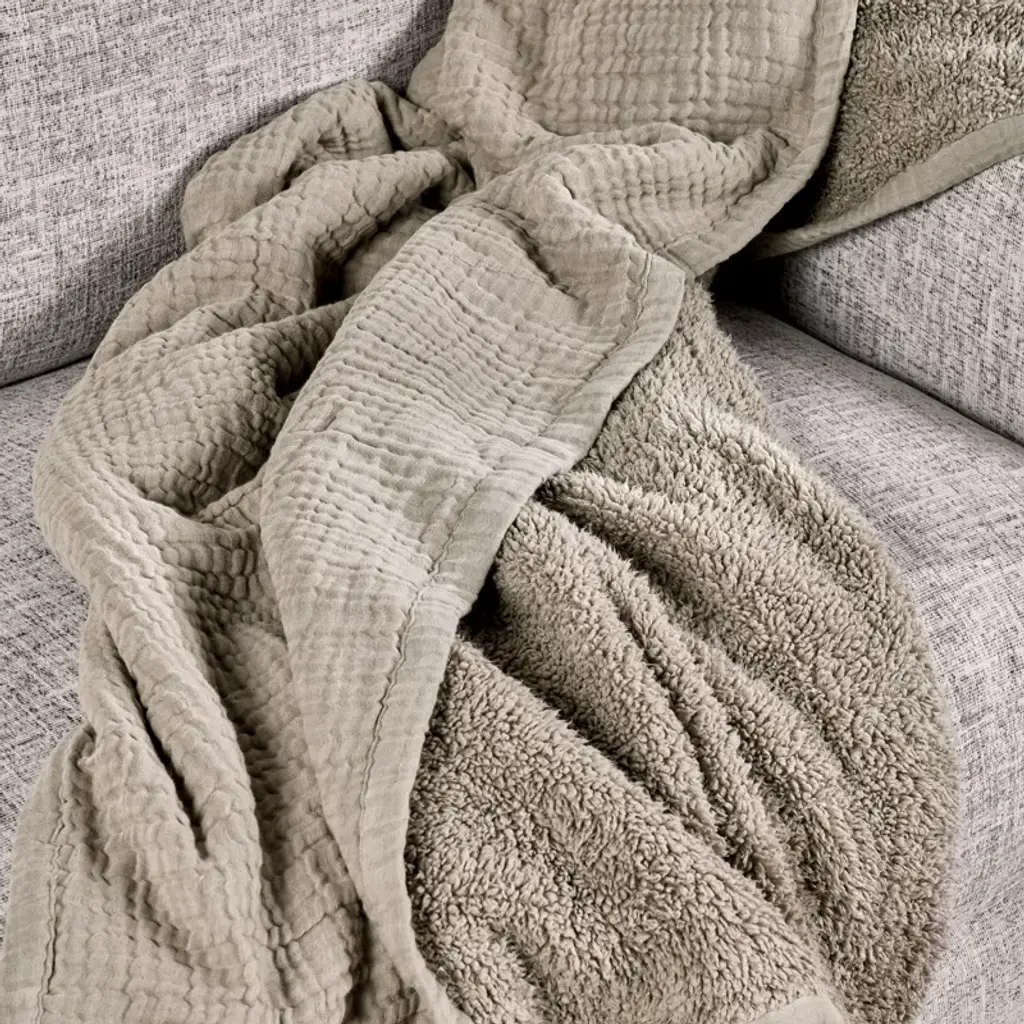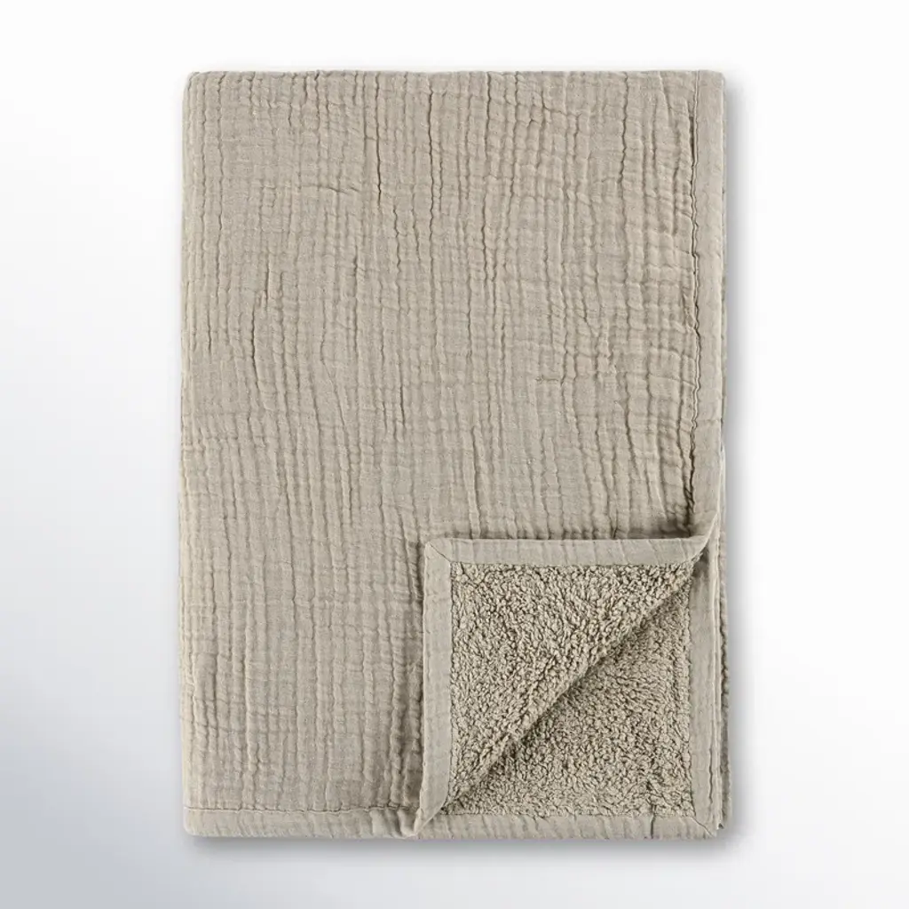 Three layers of a soft cotton linen blend give this throw a sumptuous, lofty feel while a fluffy sherpa backing adds premium coziness.