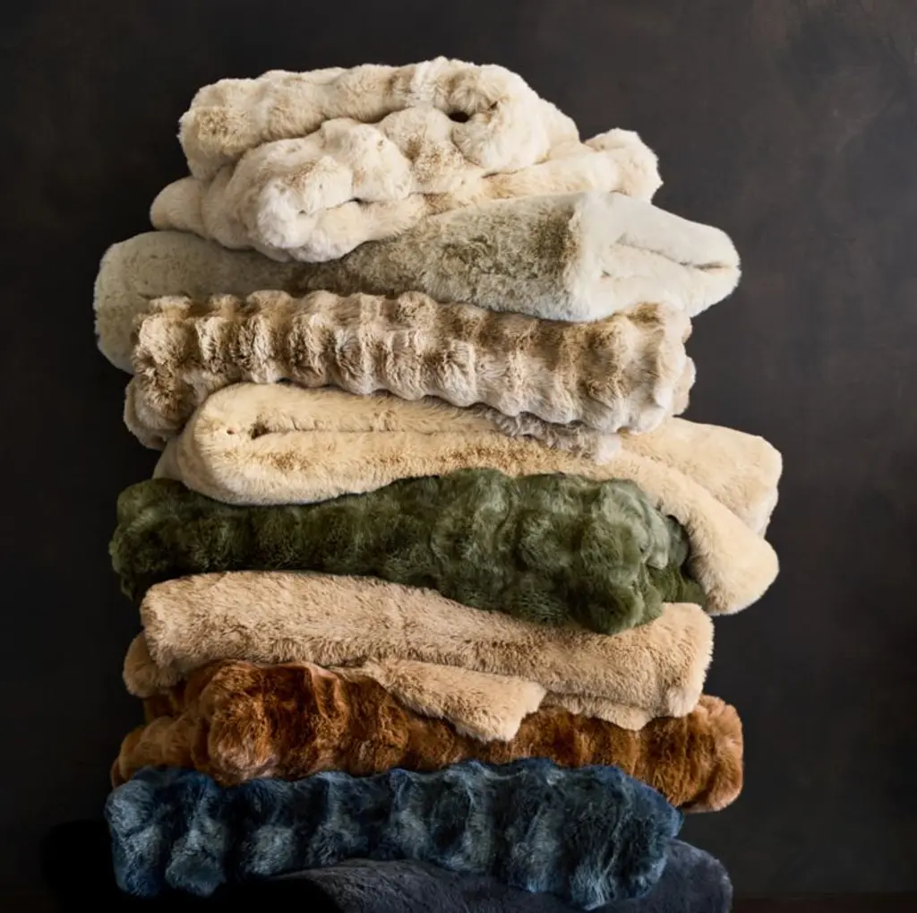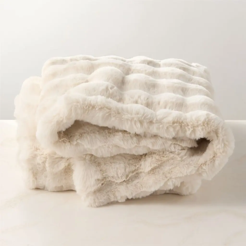 Snuggle up to a faux fur throw as cozy and luxe as the real thing. Crafted of recycled fibers, the ivory faux fur is subtly puckered to create a fluffy dimensional texture that's irresistibly soft. We love to layer this exceptional throw with our faux fur and shearling collections for serious cool-weather snuggling.