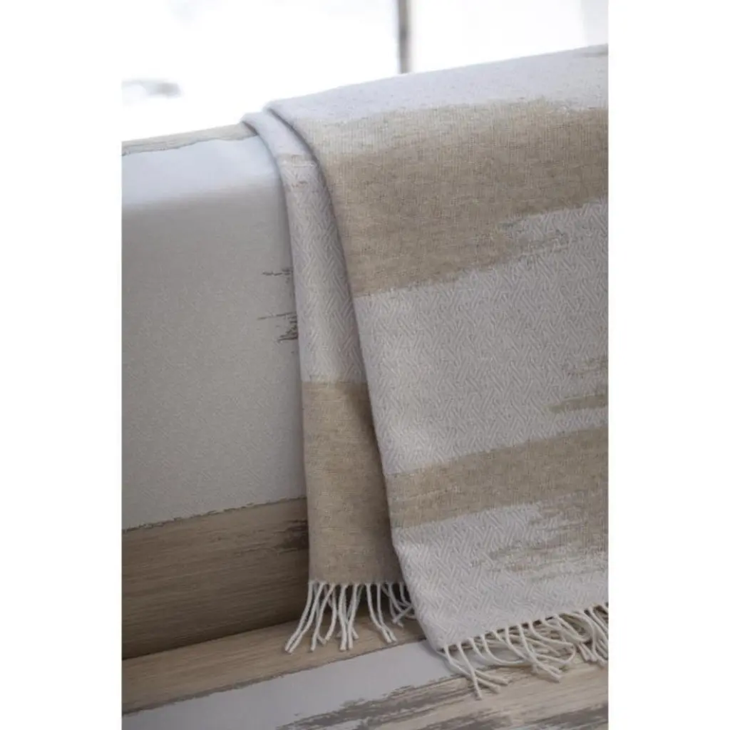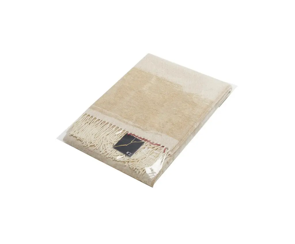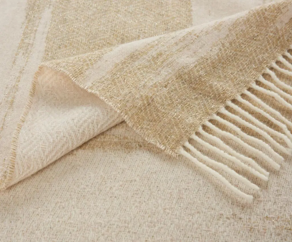 The KAMI collection is composed of yarn-dyed jacquard throws with a large golden cloud pattern, metallic threads, and short fringes. This throw is an oneiric cream colour and the cloud designs contrasted with the geometric stitiching create a sense of dream-like harmony.