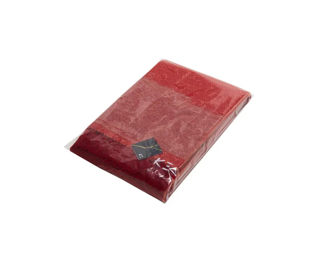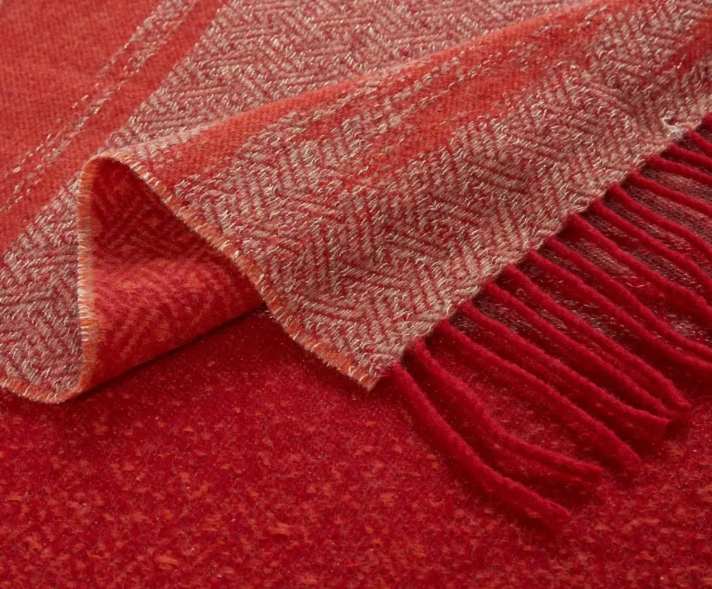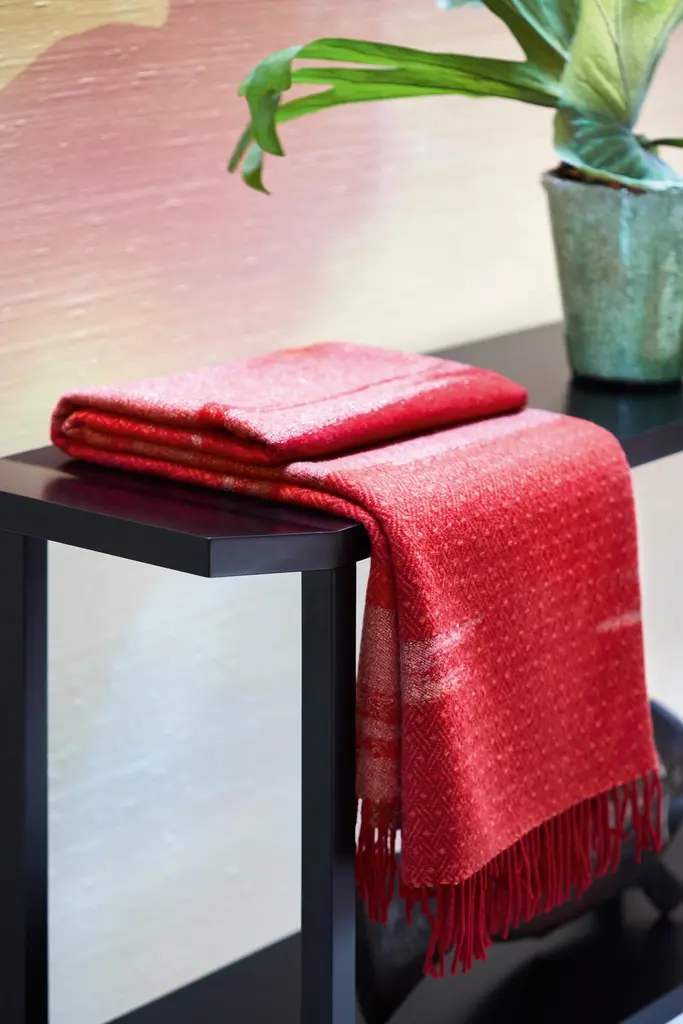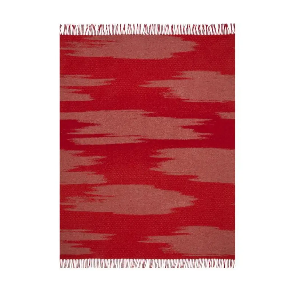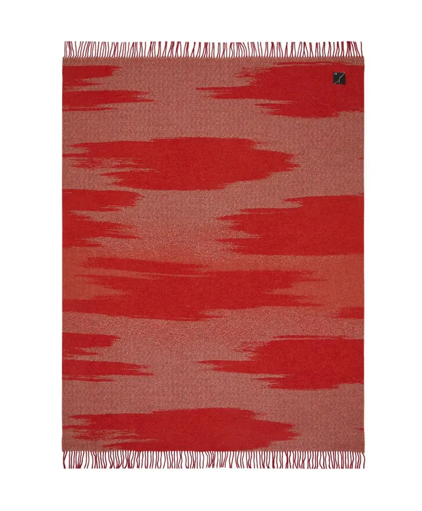 The KAMI collection is composed of yarn-dyed jacquard throws with a large golden cloud pattern, metallic threads, and short fringes. This throw is a vibrant red colour and the cloud designs contrasted with the geometric stitiching lend a sense of refined elegance.