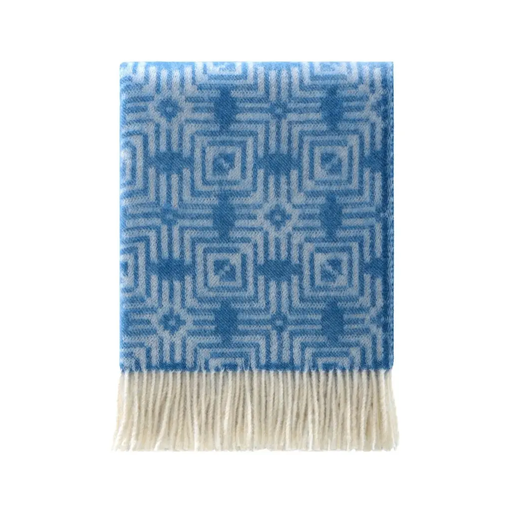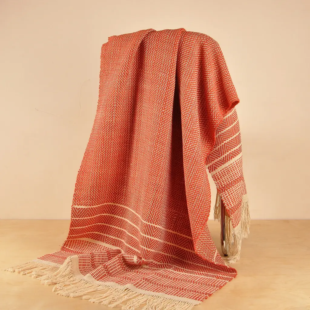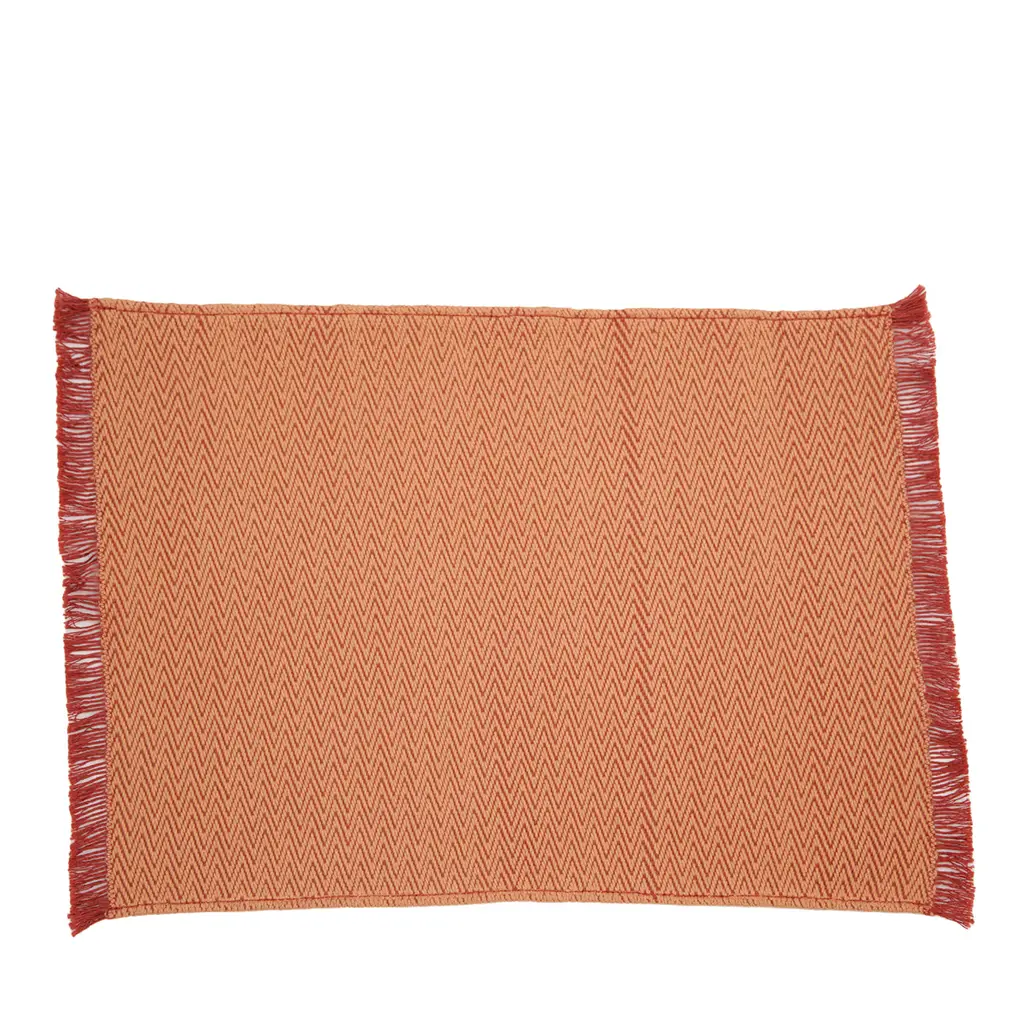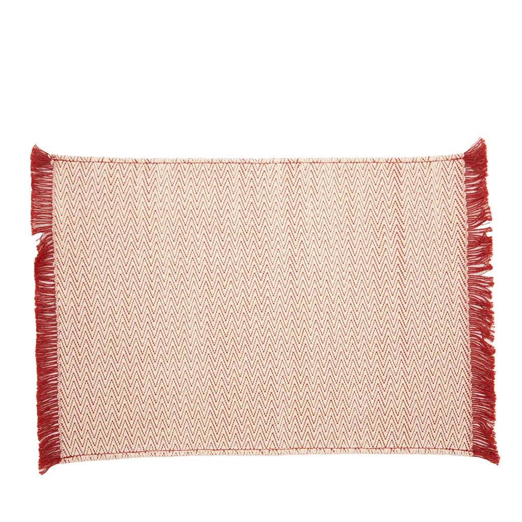 The KAMI collection is composed of yarn-dyed jacquard throws with a large golden cloud pattern, metallic threads, and short fringes. This throw is a vibrant red colour and the cloud designs contrasted with the geometric stitiching lend a sense of refined elegance.