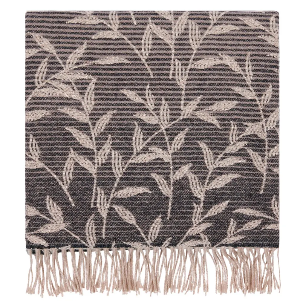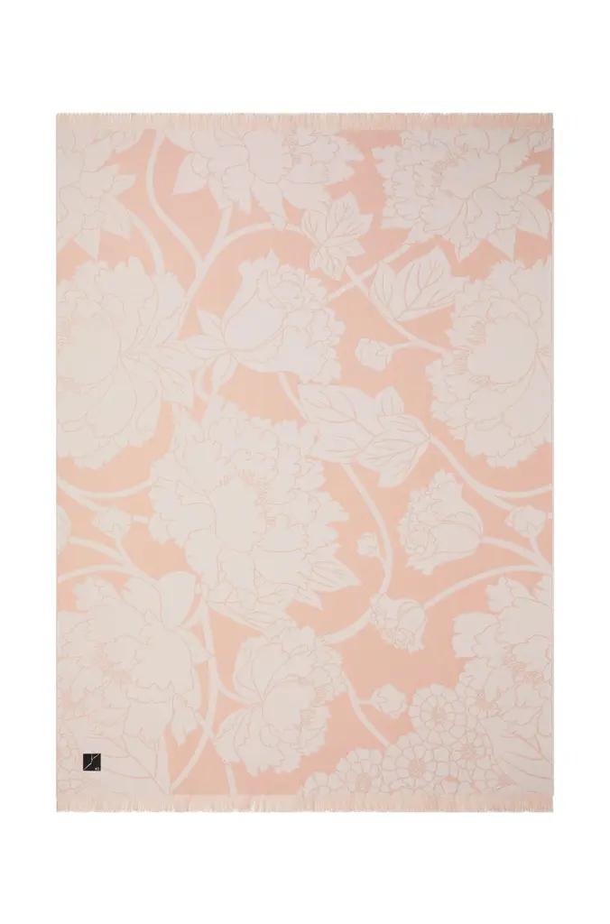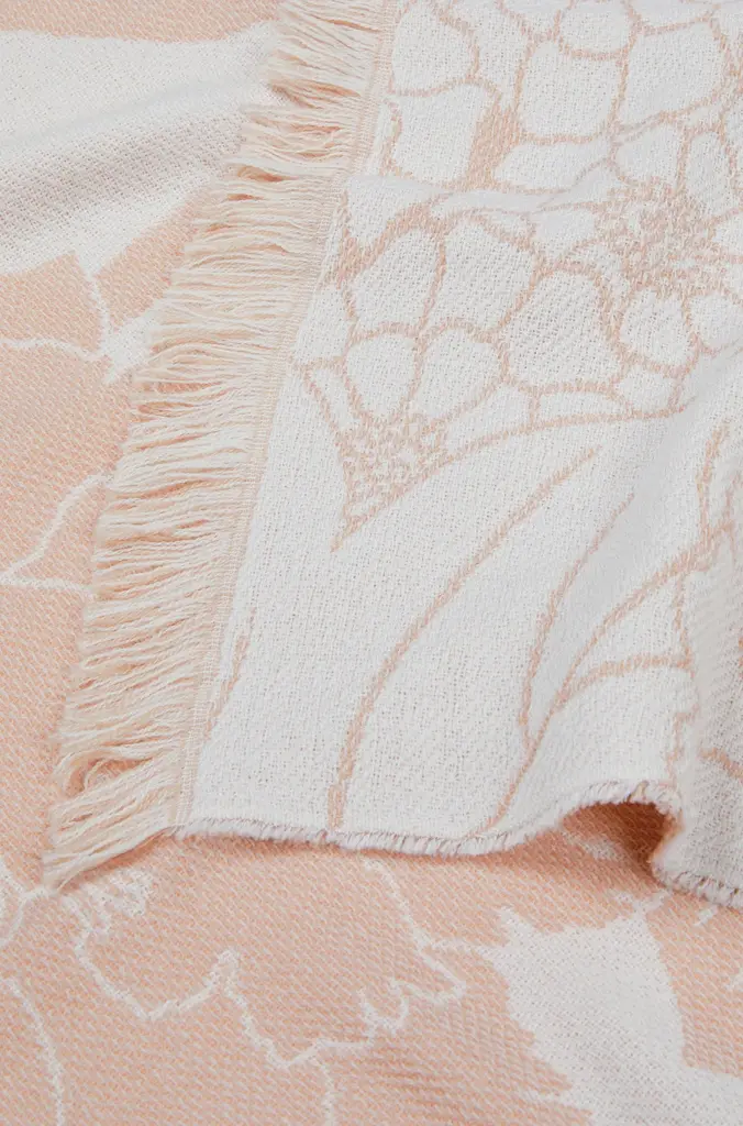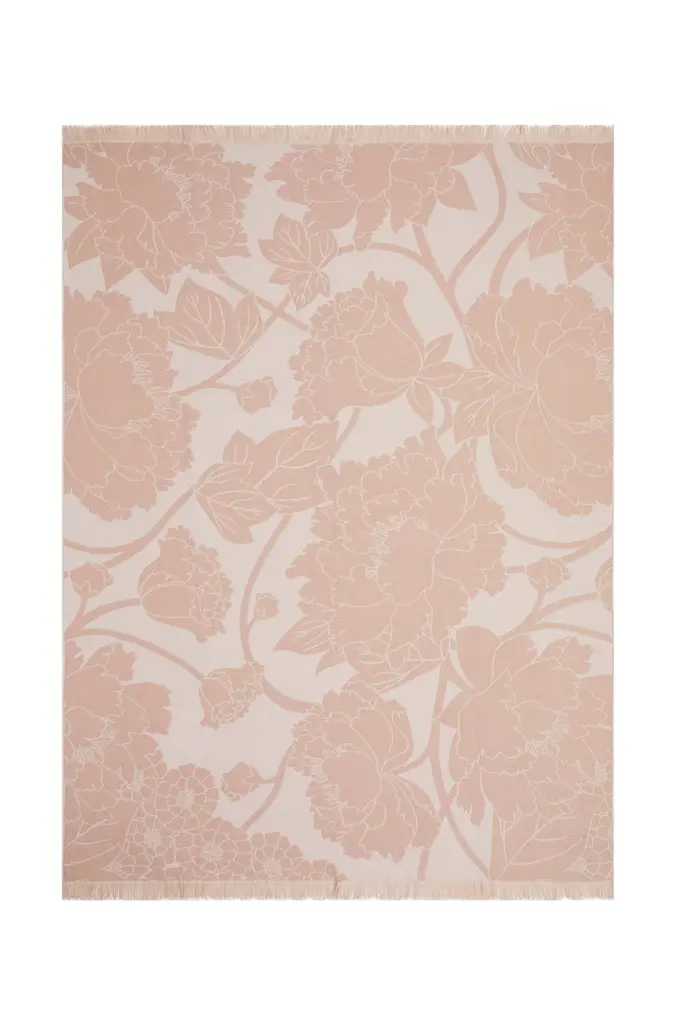 This is a natural cream jacquard throw decorated with a pattern of large, elegant peonies and short fringes. The peony flower is a Japanese symbol for good fortune.