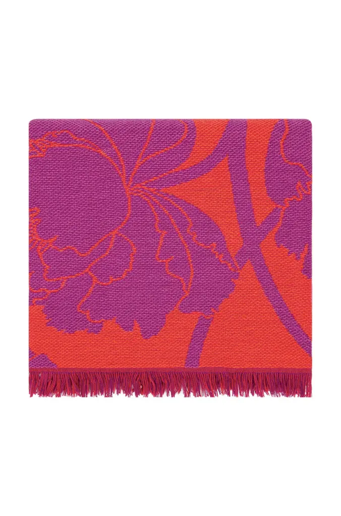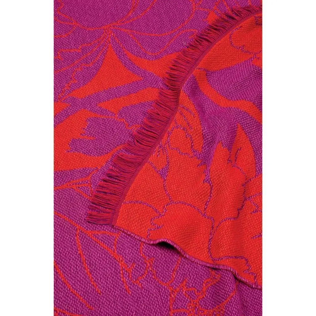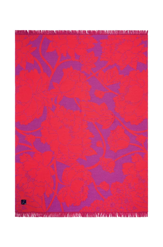 This is a vibrant pink and orange jacquard throw decorated with a pattern of large, elegant peonies and short fringes. The peony flower is a Japanese symbol for good fortune.