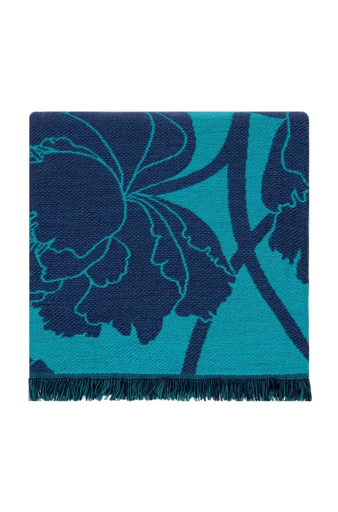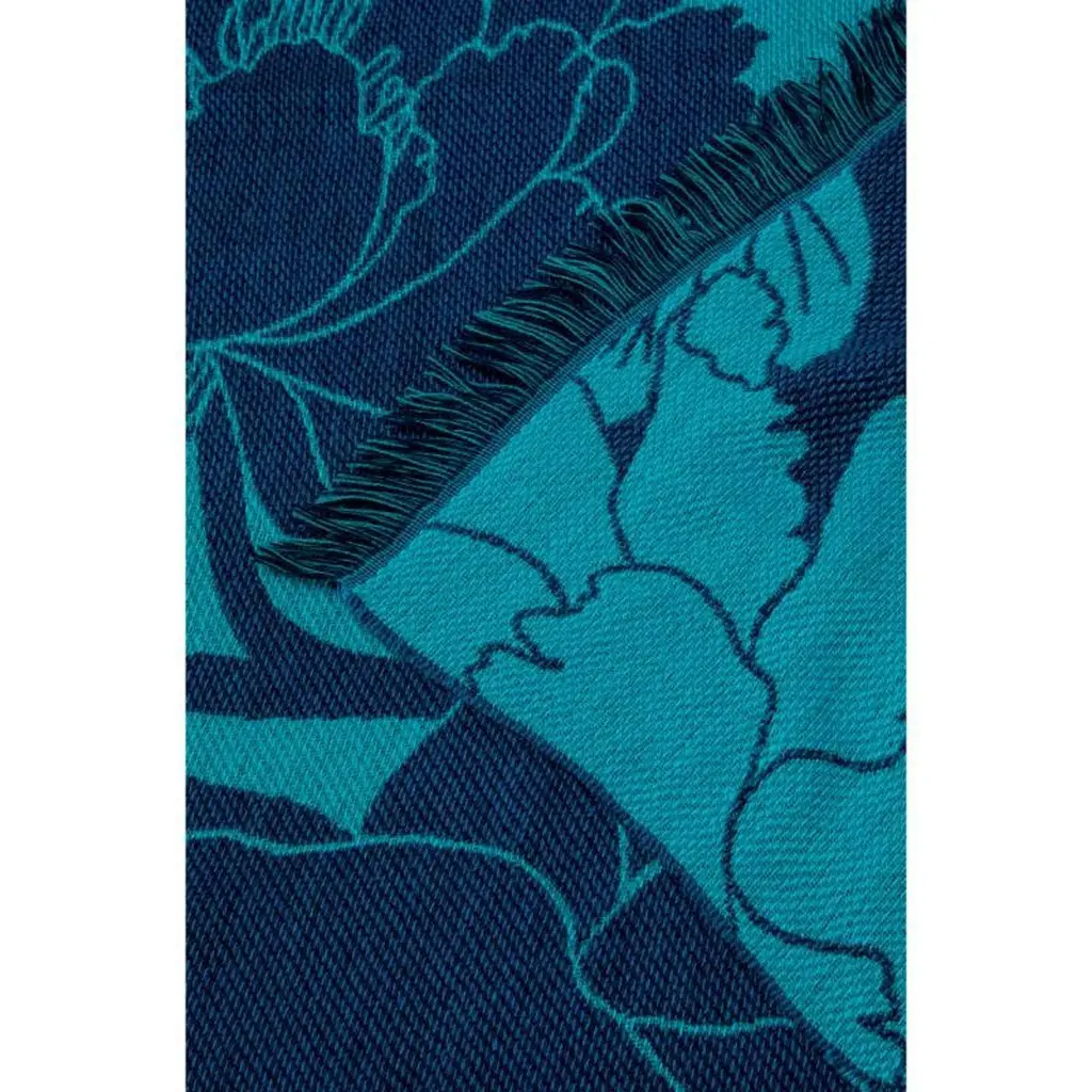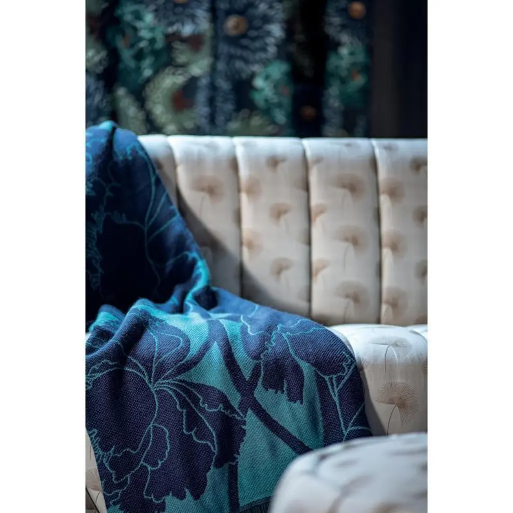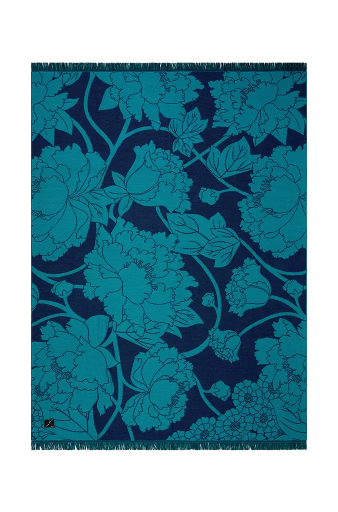 This is a rich blue jacquard throw decorated with a pattern of large, elegant peonies and short fringes. The peony flower is a Japanese symbol for good fortune.