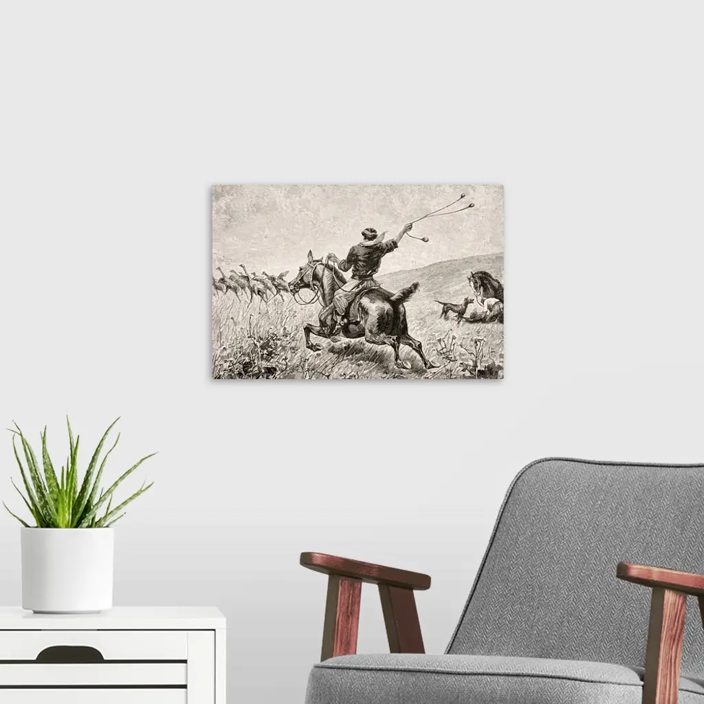Throwing the Bolas. Engraving from "Journal of Researches," by Charles Darwin, published by Nelson and Sons, 1890.