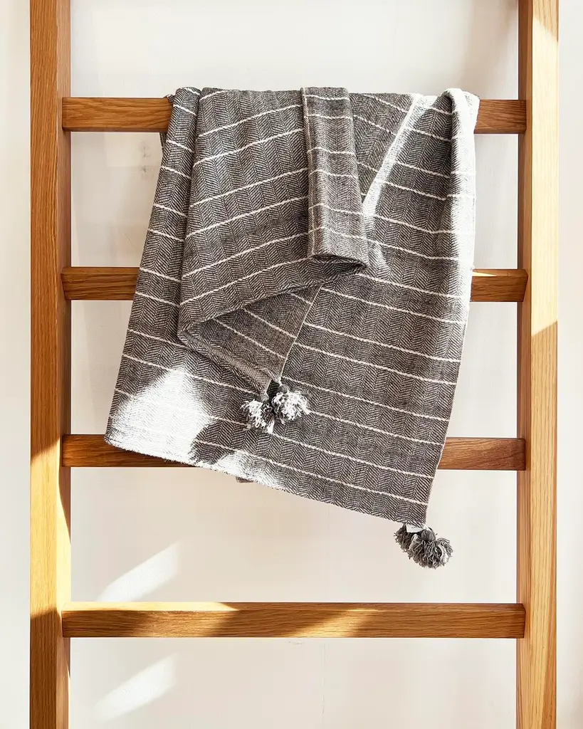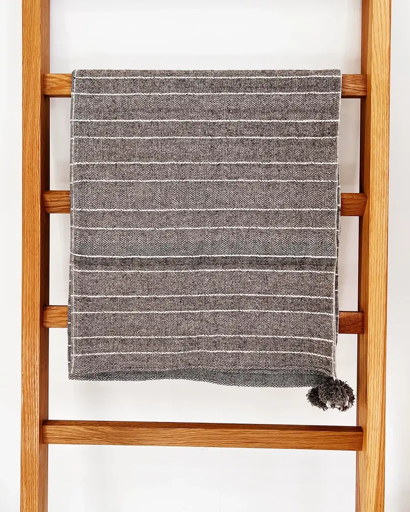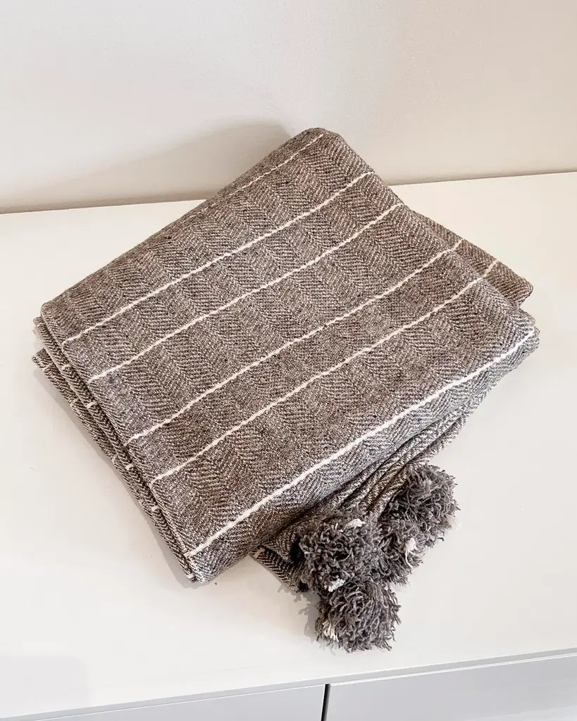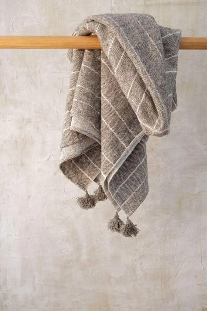 A Wool Throw to keep you cozy in all seasons. This lovely handmade throw is a lovely neutral gray cover and will go well with almost any color scheme. Drape it over your couch or bed, or keep it rolled up in a basket and out of the way until you want to cozy up while watching TV or relaxing by a fire. They have fun little pompoms attached at each corner and have a striped gray and white pattern. About the artisans Woven on a pedal loom in a workshop nestled in the mountains of Oaxaca's Mixe region, these throws are made from hand spun wool. All products are made following Fair Trade practices that allow the artisans to maintain a standard of living and continue their craft. Size 59" x 78" Care instructions: Wash in cold water on the delicate cycle setting.