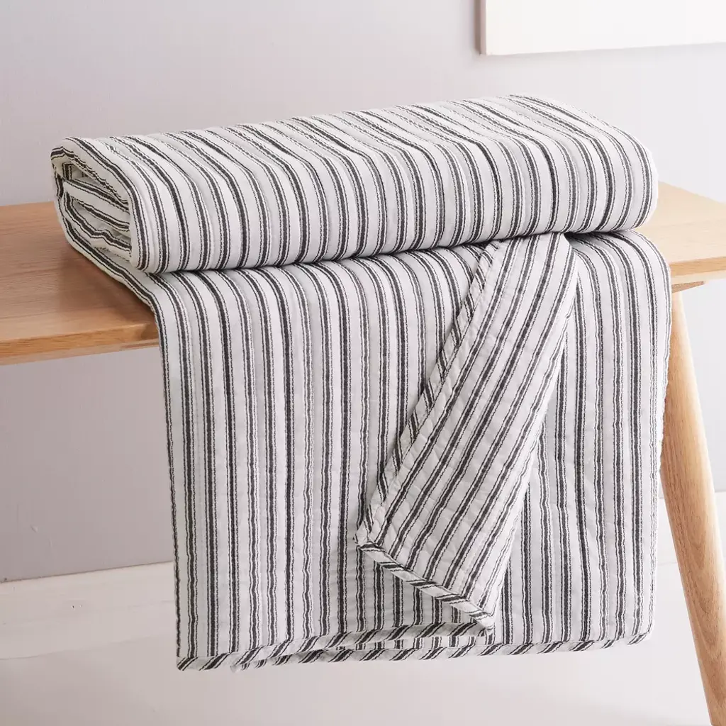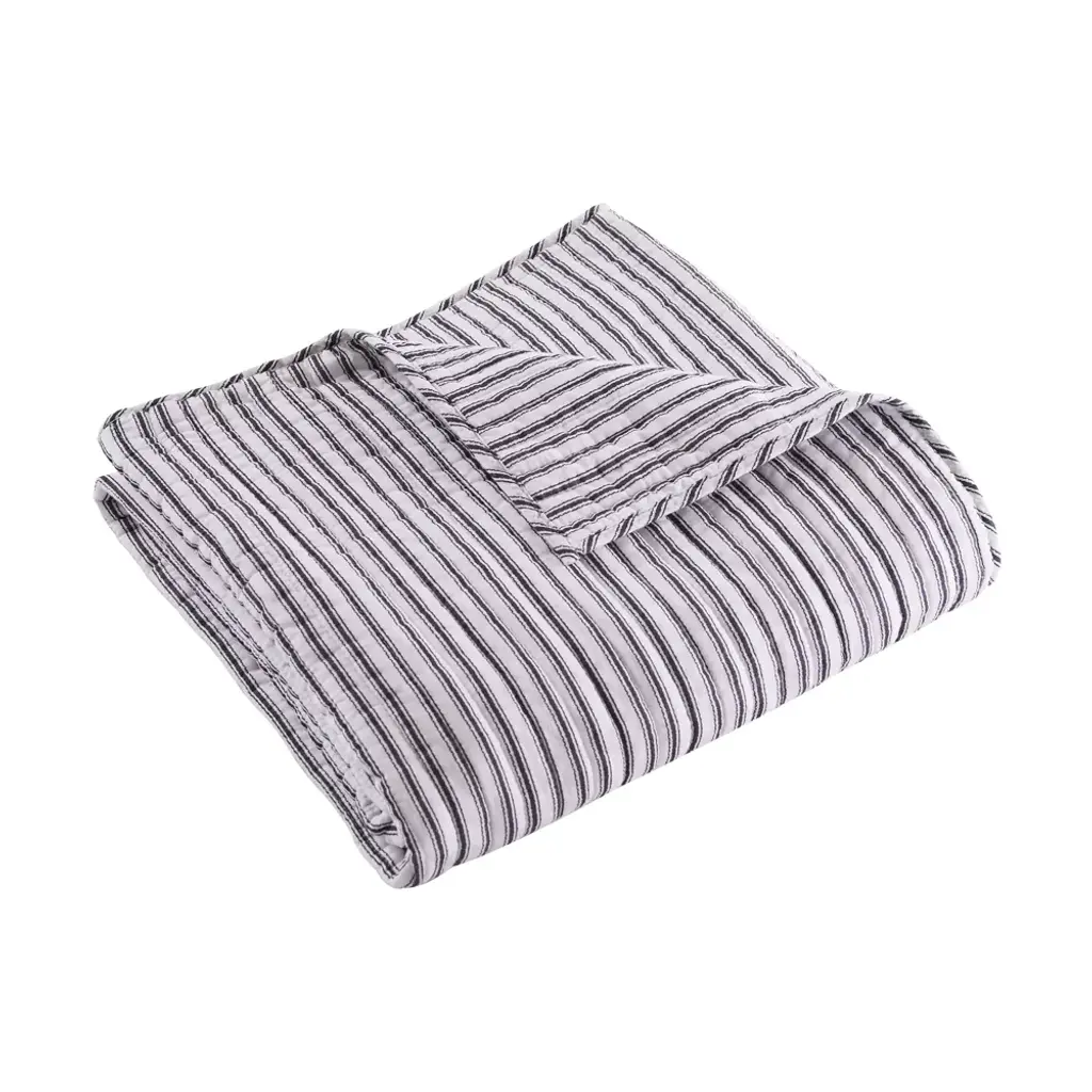 The Tobago Stripe Charcoal Reversible Quilted Throw by Levtex Home is inspired by nautical stripes. This classic stripe design will immediately transform your bedroom. Made with the softest lightweight cotton, this reversible throw features dark grey pin stripes on white, reversing to a classic charcoal and white pin stripe on the other. The Quilted Throw is perfectly sized at 50x60in. and is machine washable. Enjoy this for years to come!