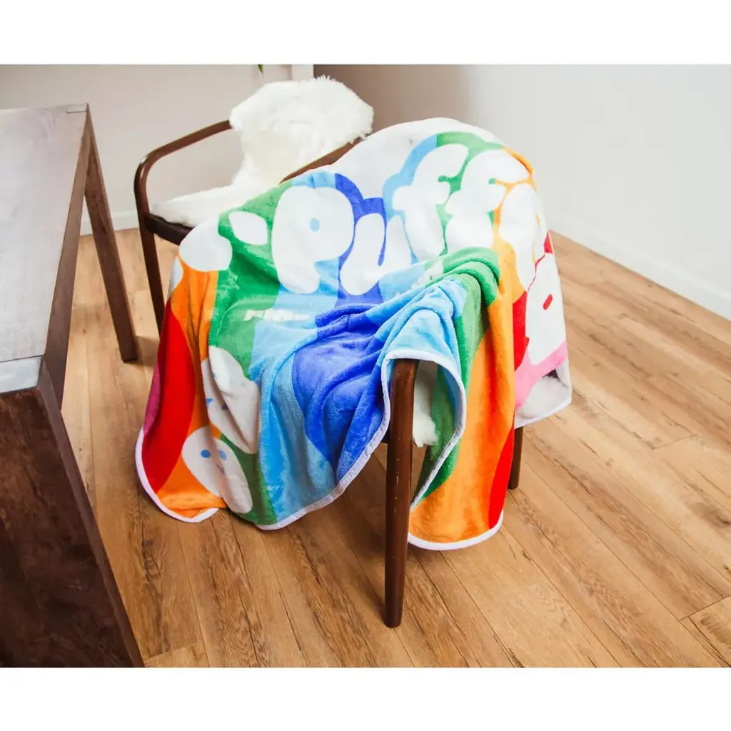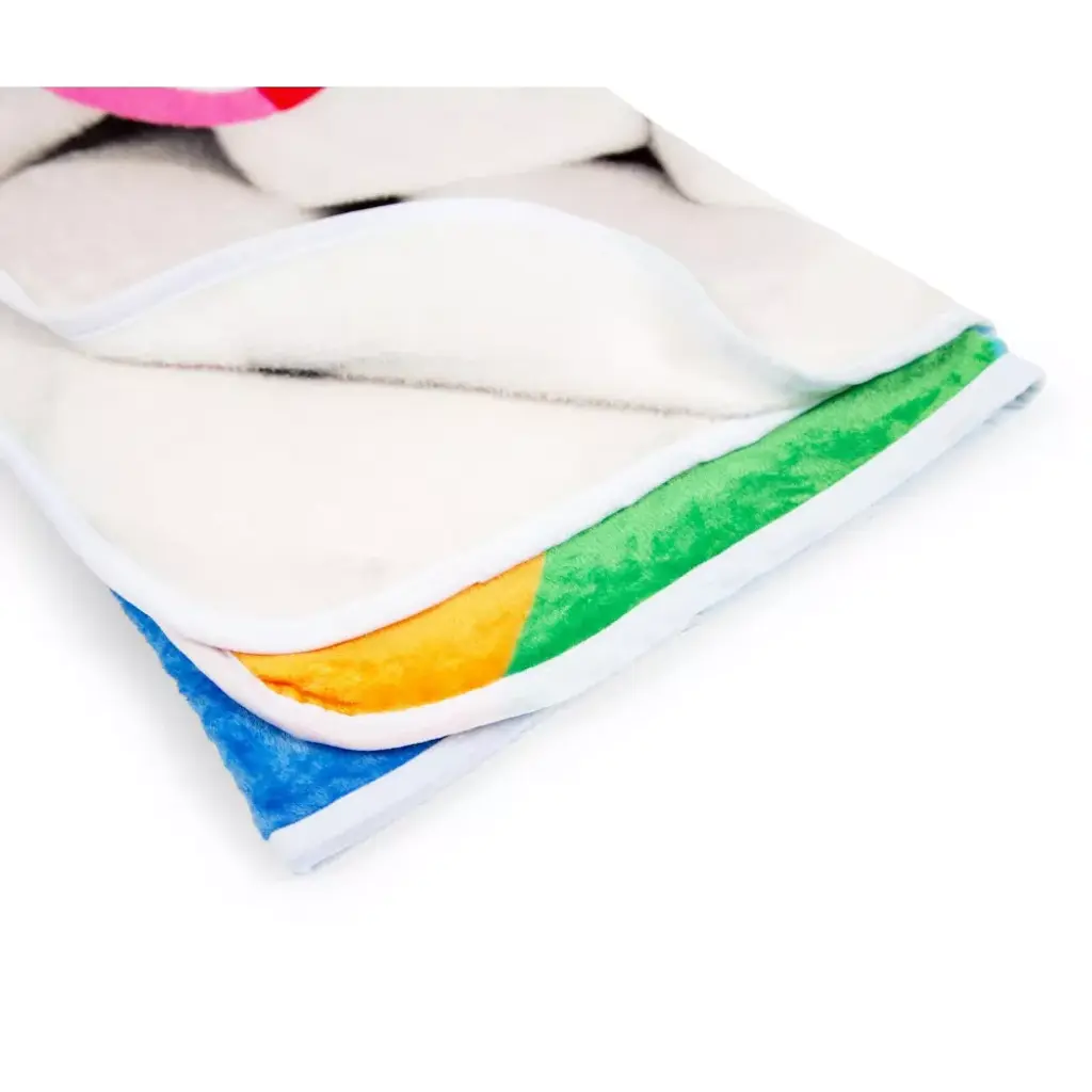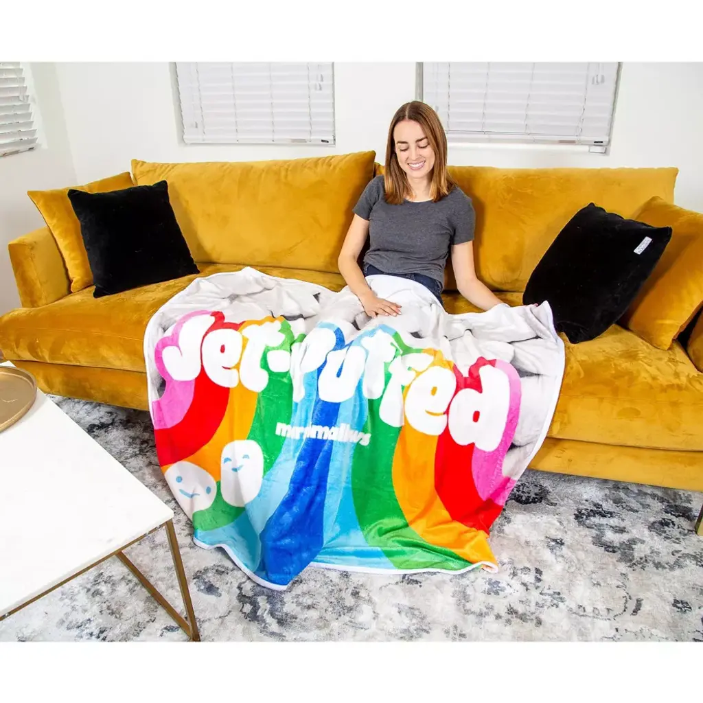 Show off your love of Jet Puffed Marshmallows with this warm and cozy throw blanket! Featuring the puffy dessert, this fun throw blanket is soft to the touch, made up of 100% polyester material and measures a roomy 45 by 60 inches. Lastly, it's also easy to clean, machine wash with cold water is highly recommended. Officially licensed. A Toynk exclusive!