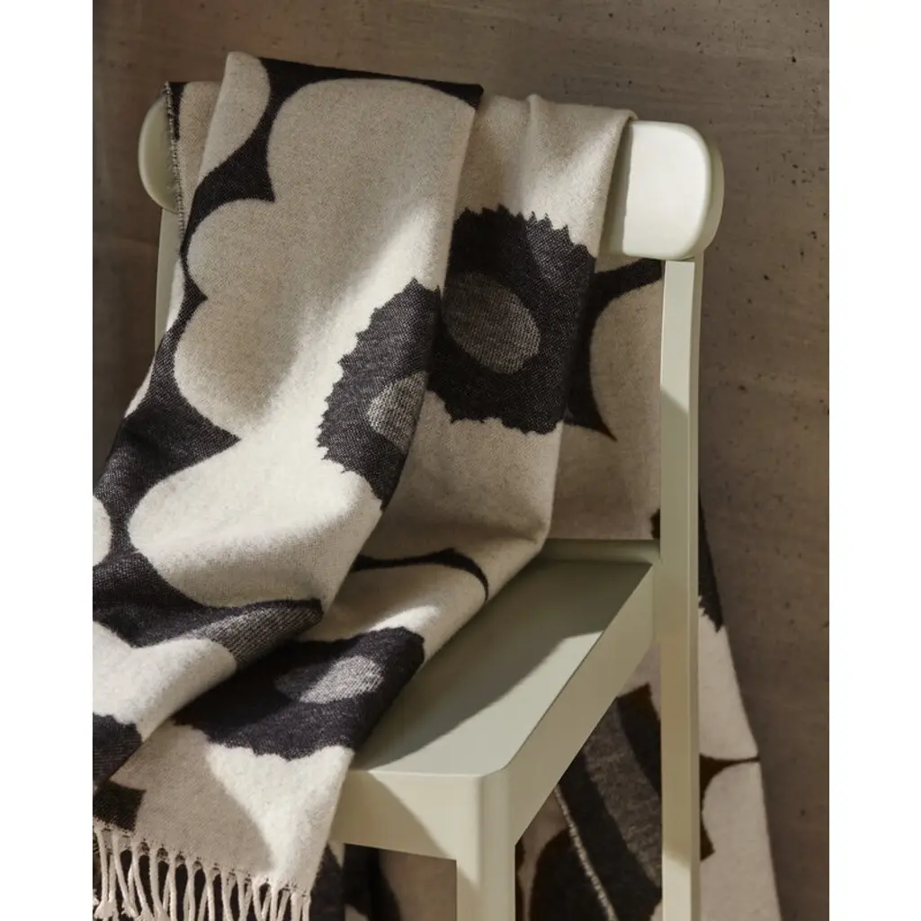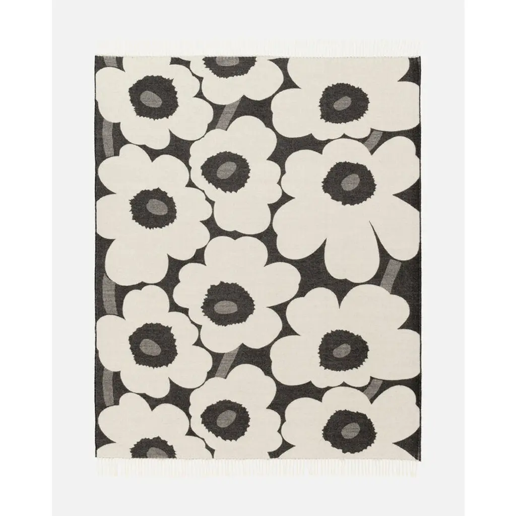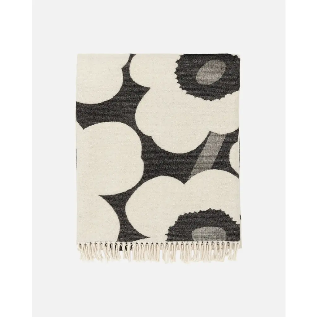 Marimekko’s Unikko throw features Maija Isola's iconic floral pattern in black and white. The soft and warm Unikko throw is made of a blend of wool and cotton and measures 51.18 in (130 cm) x 70.87 x 0 in (180 x cm. cm). The pattern is mirrored on the other side in opposite colors. The white fringes on both ends make a delightful detail. The Unikko pattern came about in 1964 after Armi Ratia, the founder of Marimekko, had announced in public that no floral fabrics are designed at Marimekko. Maija Isola did not accept rules or restrictions and designed in protest a complete collection of bold floral patterns: Unikko, a Finnish word that means poppy. Today, Unikko is one of Marimekko's best-known patterns and recognized around the world.