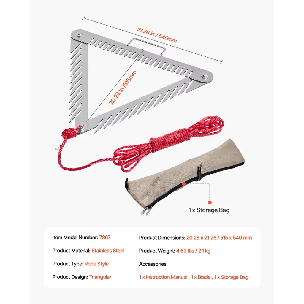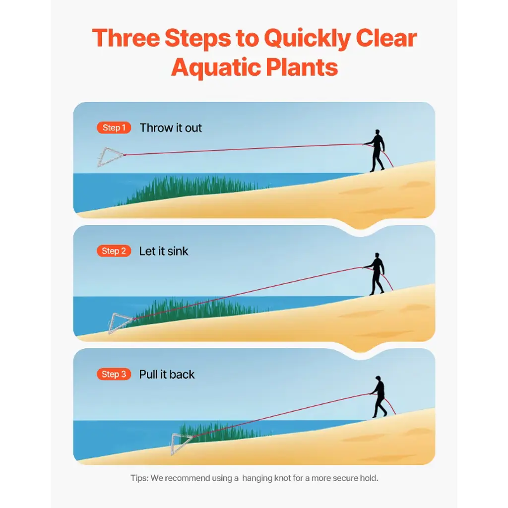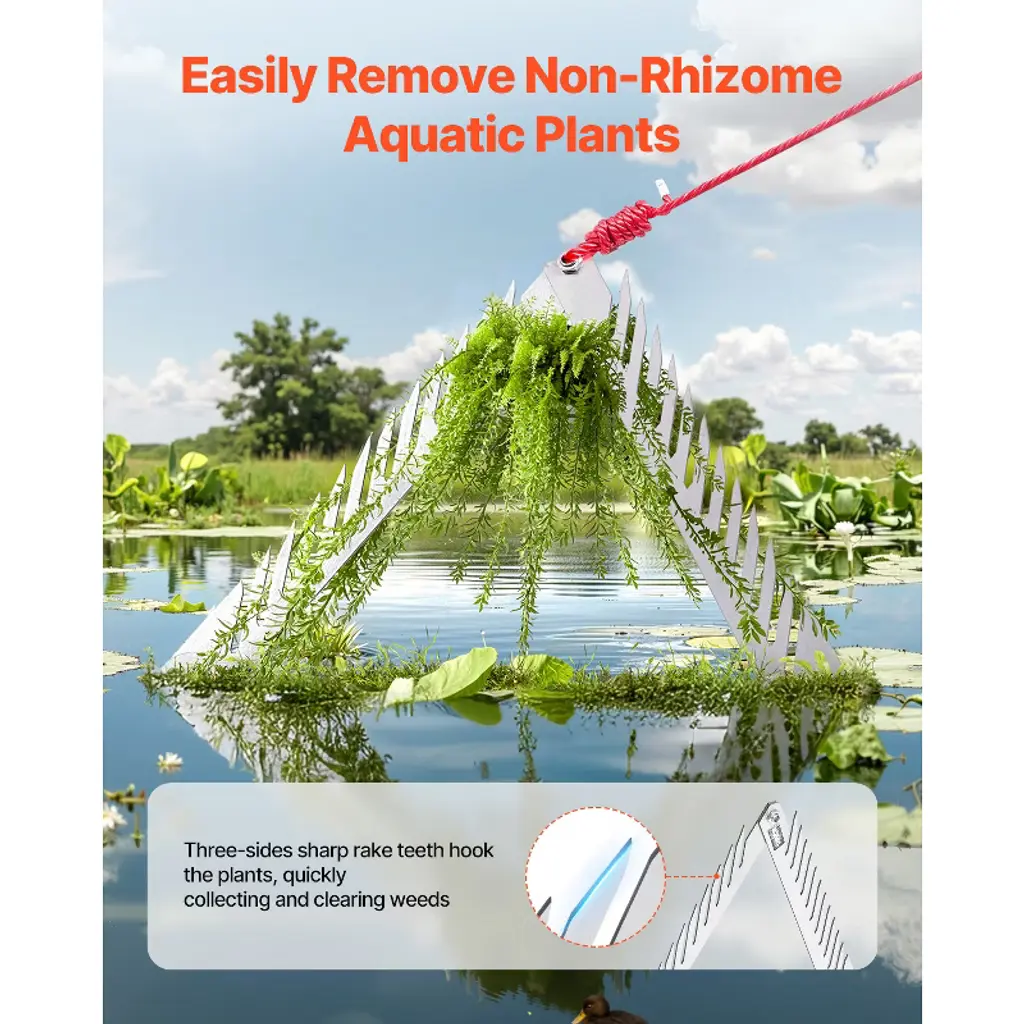 Feature: Efficiently Removing Aquatic Weed: The 24-inch triangular pond rake head is designed for clearing aquatic plants in lakes, ponds, and rivers. The sharp tines on all three sides grip different types of aquatic plants, quickly removing weeds and keeping your waterway clear for fishing and other water activities. Lightweight Operation: Weighing just 4.63 lbs / 2.1 kg, this aquatic weed rake comes with a 30ft (9m) nylon rope, allowing easy coverage of large areas. Simply throw the rake, let it sink, and reel it back to clear the weeds. It’s easy to use, offering a hassle-free cleaning experience. Durable Stainless Steel Material: Made from stainless steel, this aquatic weed razor is highly durable and resistant to wear. The 3mm thick blade remains firm and doesn’t bend during use. The ergonomic handle design ensures a safe and comfortable grip while operating. Convenient to Carry: After use, the lake rake for weeds can be folded and stored in the included storage bag. This makes it easy to carry, perfect for outdoor activities like fishing or boating. Application Scenarios: Our aquatic weed cutter is ideal for clearing weeds in lakes, ponds, and streams. Particularly effective for non-rooted weeds such as eurasian watermilfoil, chara, silk moss, coontail, and cotton moss. Tips: For tougher aquatic plants with thicker roots, we recommend using the ""aquatic rake with handle/lake weed cutter"" first, followed by the ""rope-style aquatic rake"" for better results. Avoid using the rake for beach weeding, as the salt in seawater may corrode the product and shorten its lifespan. Package Content 1 x Instruction Manual 1 x Blade 1 x Storage Bag