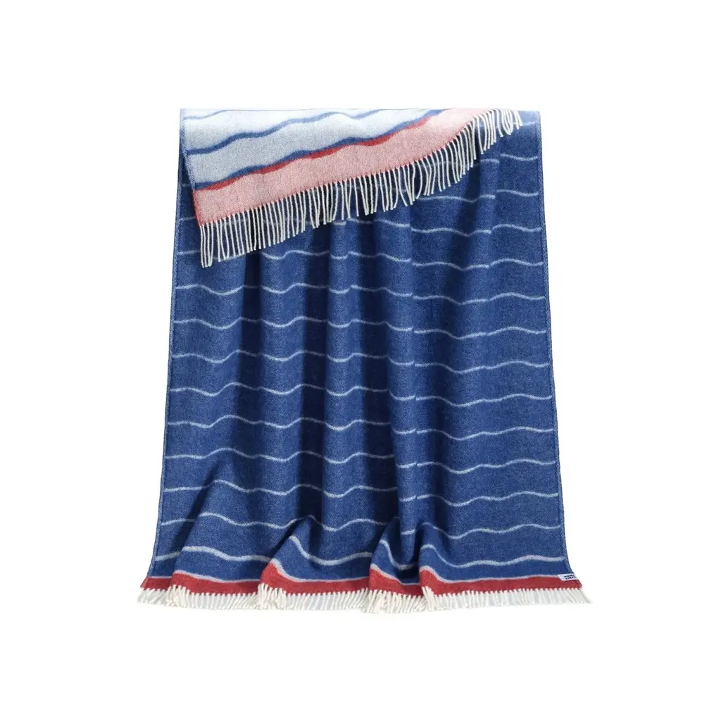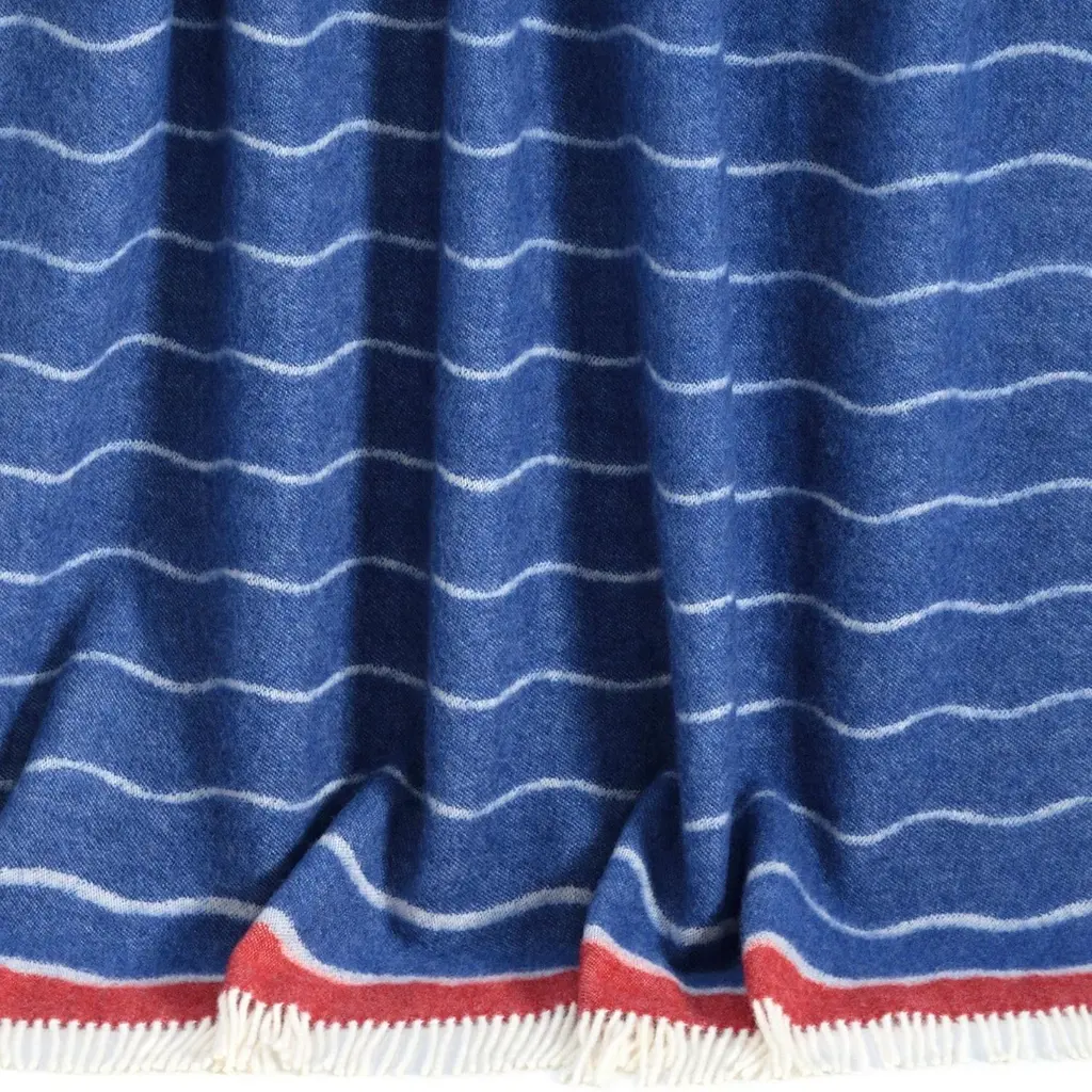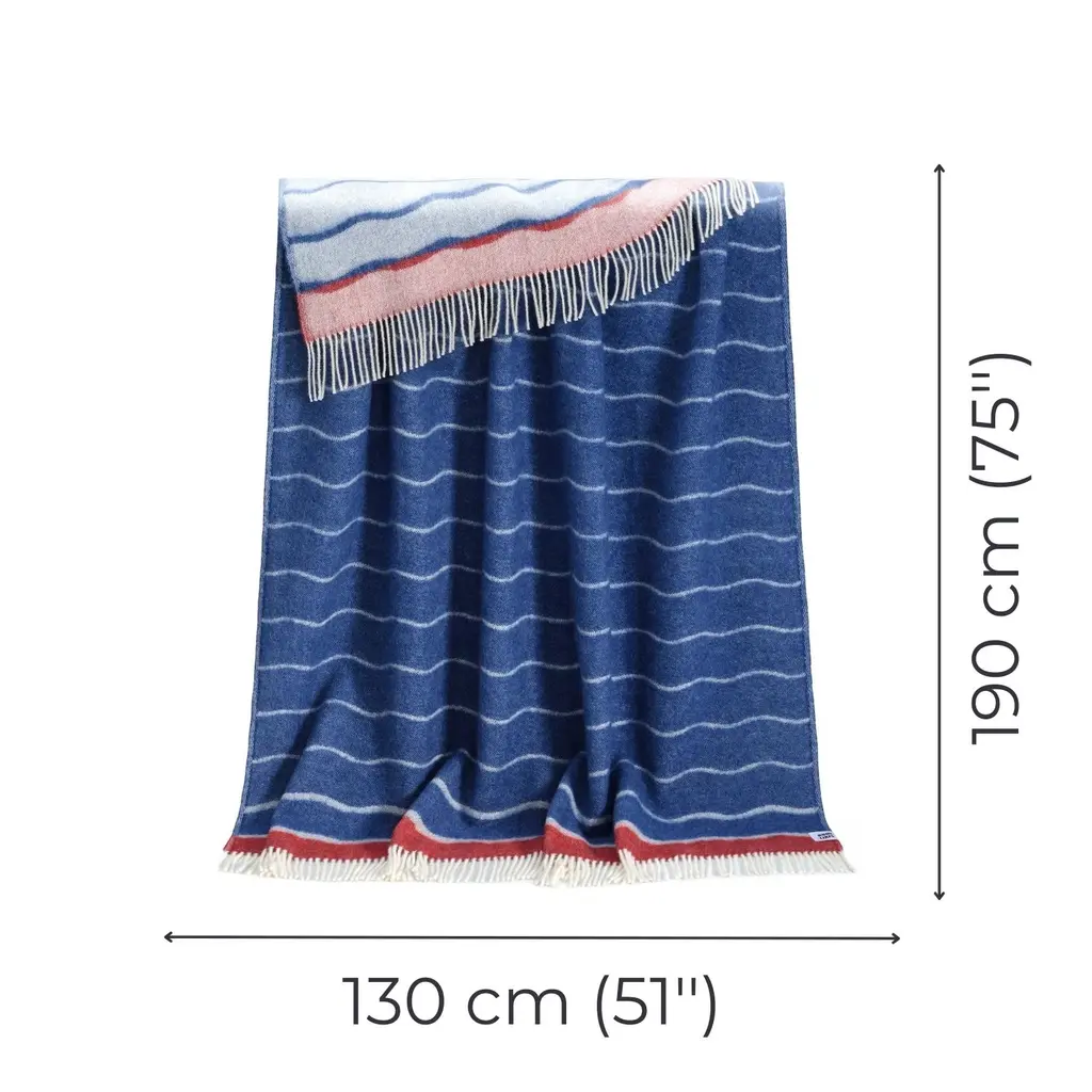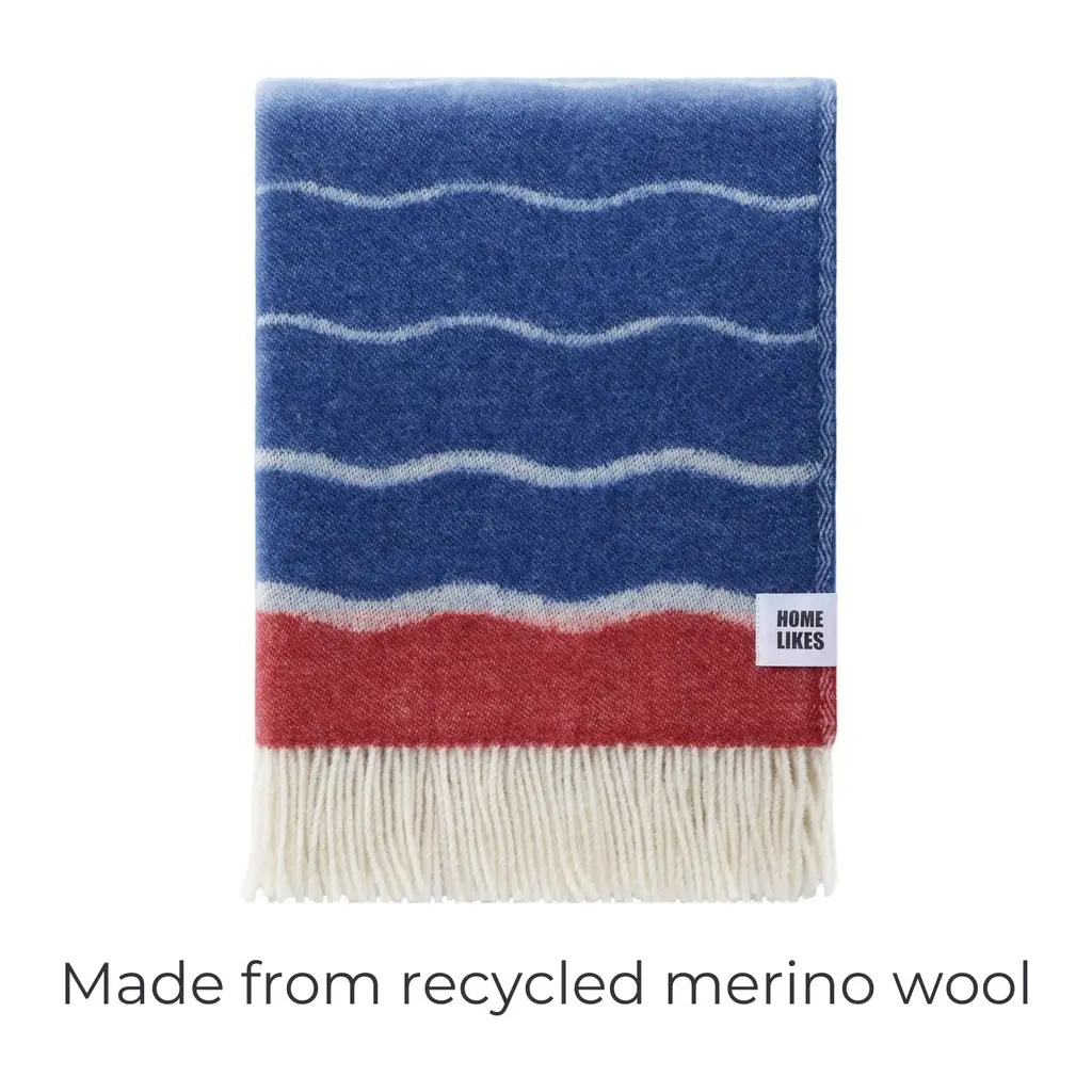 Immerse yourself in the coastal allure of our Waves Throw, where white crests dance across a deep blue sea, punctuated by a bold splash of red at the edges. This throw beautifully captures the spirit of the ocean, bringing a touch of seaside elegance to your home. Crafted from a thoughtful blend of new wool and recycled merino wool, it combines warmth with sustainability.Perfectly sized at 130 x 190 cm, it’s just the thing to drape over your favourite reading spot, curl up with on a breezy veranda or lay across the foot of your bed. Finished with a delicate fringed edge, this throw is both a stylish and eco-conscious addition to your decor, ready to infuse any space with a hint of nautical charm.