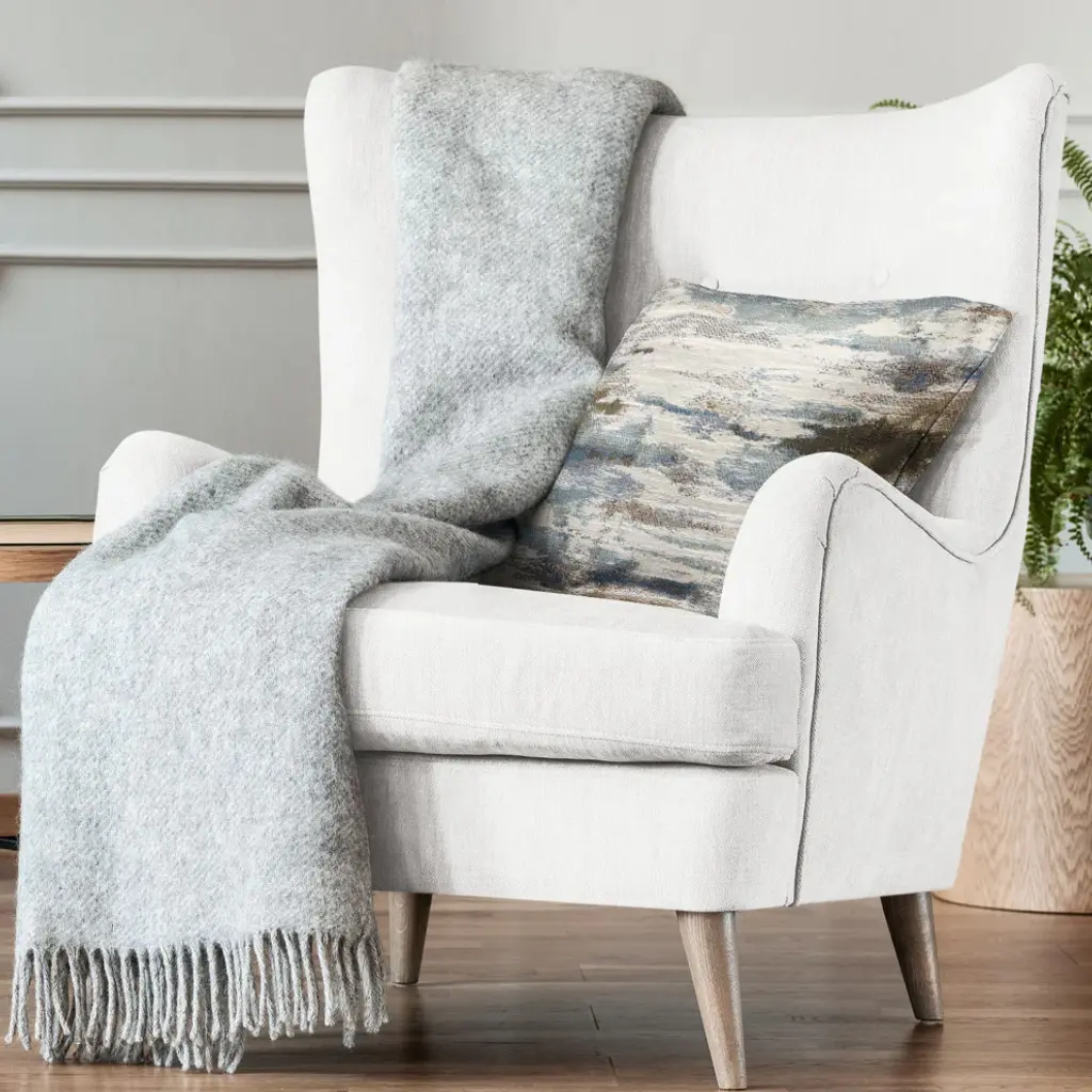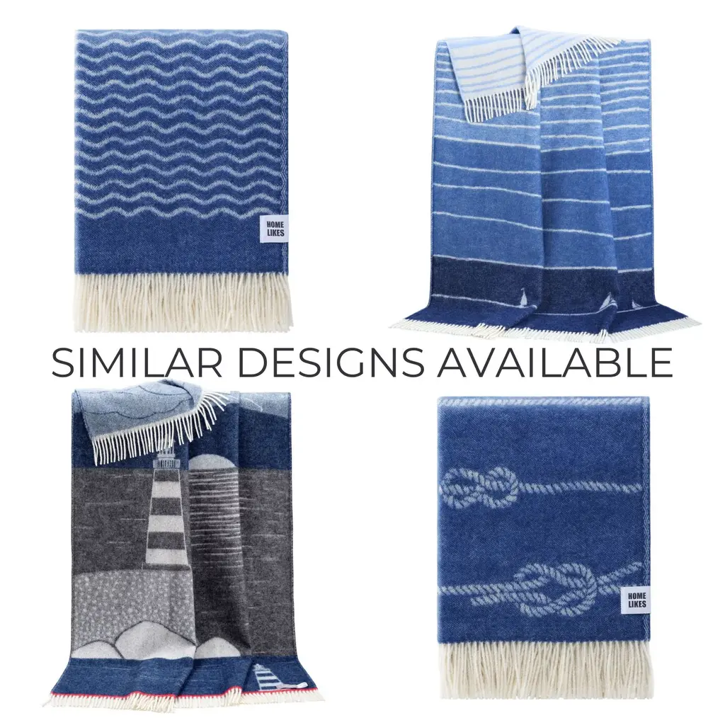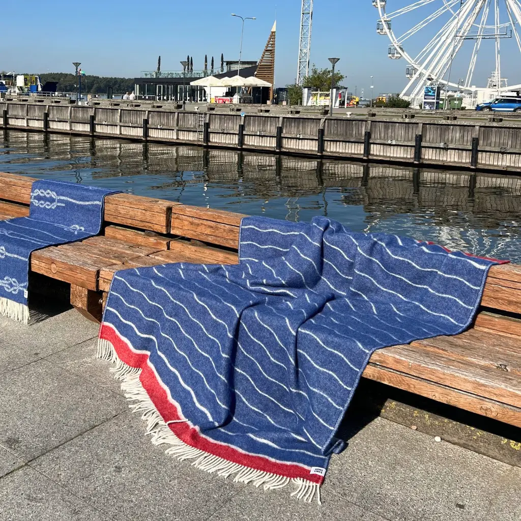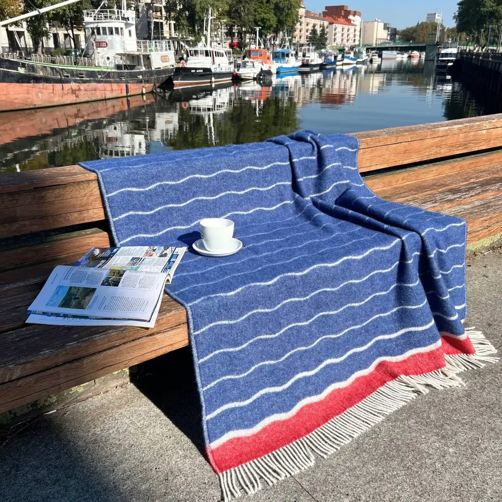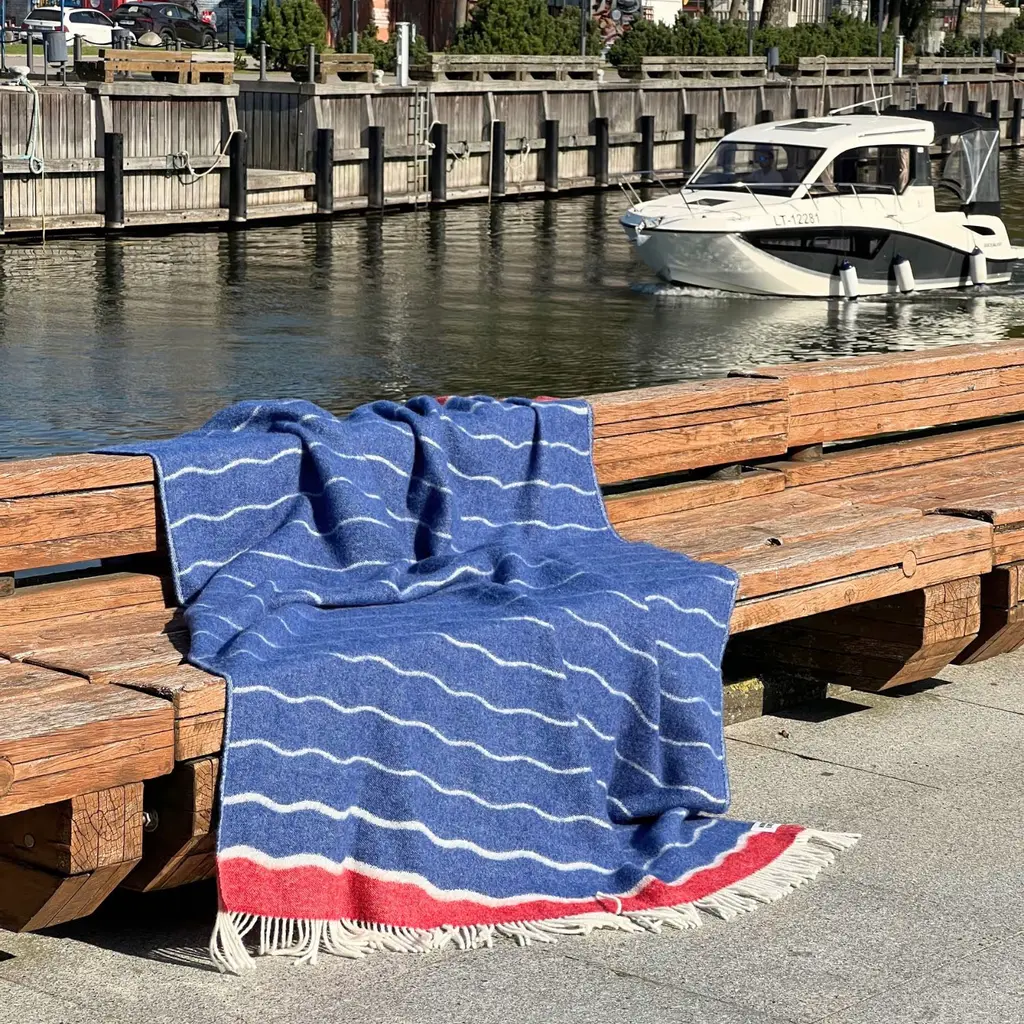 Immerse yourself in the coastal allure of our Waves Throw, where white crests dance across a deep blue sea, punctuated by a bold splash of red at the edges. This throw beautifully captures the spirit of the ocean, bringing a touch of seaside elegance to your home. Crafted from a thoughtful blend of new wool and recycled merino wool, it combines warmth with sustainability.Perfectly sized at 130 x 190 cm, it’s just the thing to drape over your favourite reading spot, curl up with on a breezy veranda or lay across the foot of your bed. Finished with a delicate fringed edge, this throw is both a stylish and eco-conscious addition to your decor, ready to infuse any space with a hint of nautical charm.