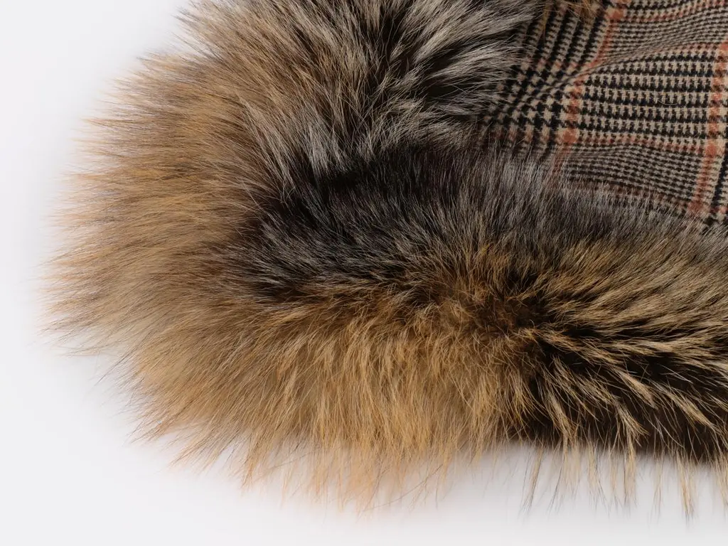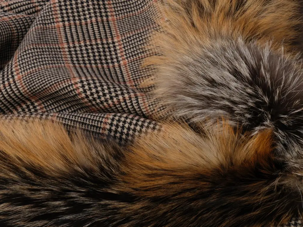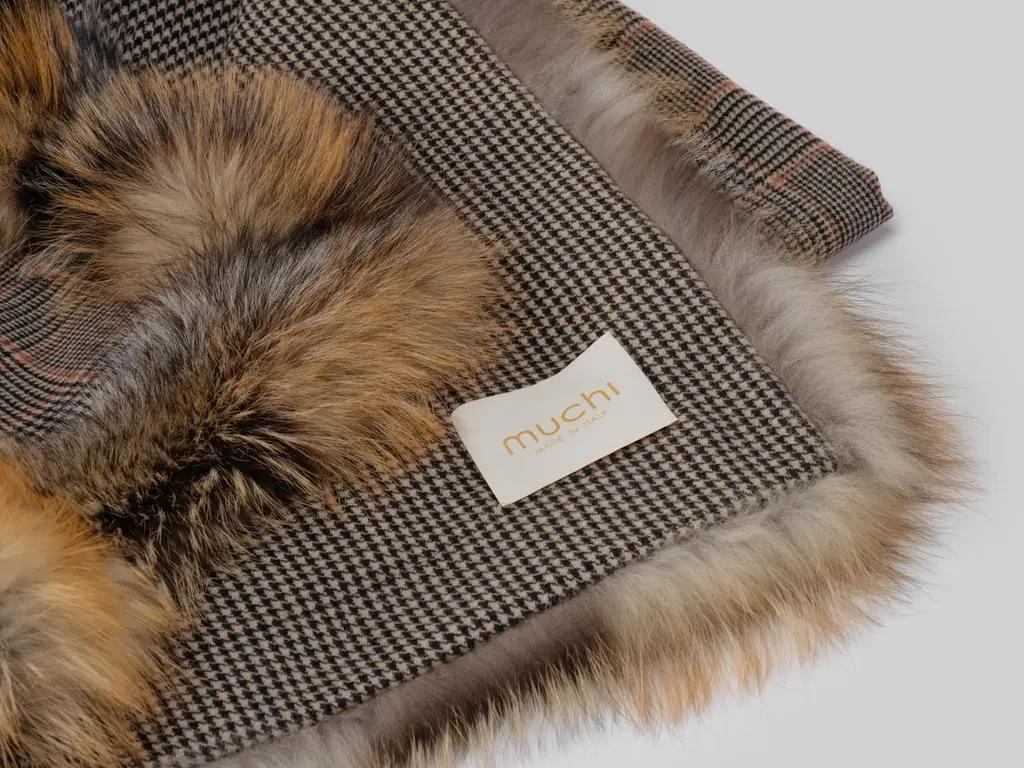 A wool and cashmere throw blanket hemmed with natural Gold Cross Fox fur.Thanks to its front Prince of Wales design and its back, black and white, Pied de Poule design, livens up the room while bringing together the best of comfort and elegance. The natural hues of Gold Cross Fox create colorful shades in the hem which make this throw blanket special and unique. Thanks to its big size, it can comfortably accommodate two people.This throw blanket will be delivered in our luxury Muchi Decor box.All the distinctive features of each single piece, made from natural materials, are unique and unrepeatable. Differences in colour, uniformity, dimension, height and a slight loss of hair are intrinsic characteristics of the material and are an indication of the naturalness of the product. For this reasons every piece may slightly differ from the others, making each one of them unique.We only use the best quality natural materials, sourced following EU regulations and that does NOT require CITES requirements.Dimensions: 140 cm x 180 cmHem: 100% Natural Gold Cross FoxFabric: 90% Wool 10% CashmereFront: Principe di Galles DesignBack: Pied de Poule DesignMade in Italy