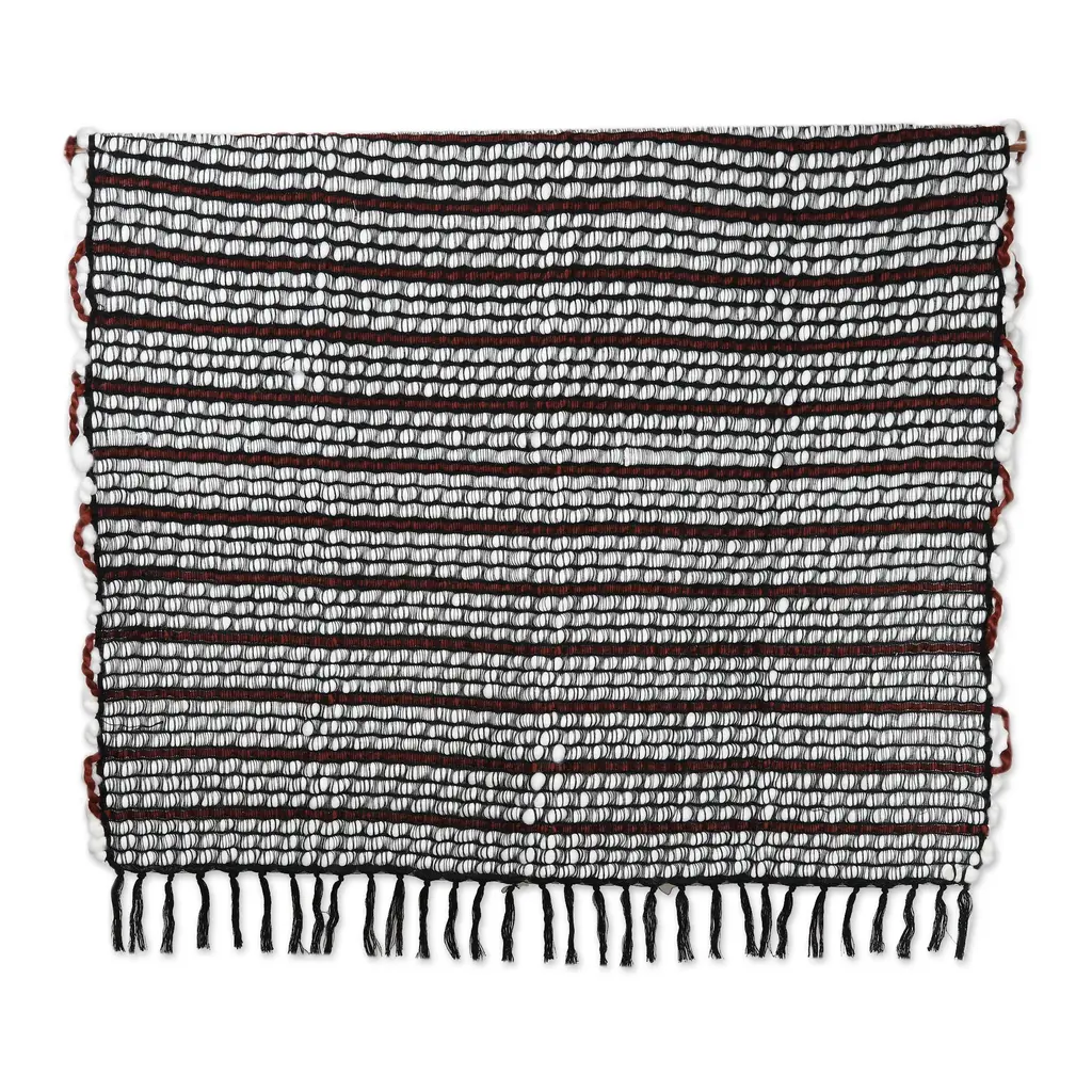 Indian artisans follow traditional techniques to craft a polyester and acrylic throw blanket with a soumak-like weave. Presented by Sandeep Malhotra, this accessory comes in a palette of russet, white and black tones, all arranged in a striped pattern for a captivating look. Furthermore, the item features little fringes that dangle at the end.