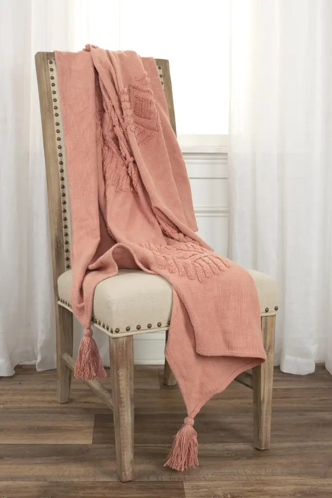 With intricate hand-tufted detailing, this gorgeous throw is the epitome of refined boho chic style, woven using slubbed yarns for a textured, transitional ikat design. In a rich coral hue, this piece will add a pop of color to any décor, with the added benefit of ultra comfort. The warp yarns are hand-tied into tassels, adding a finishing element of refined texture and warmth. This medium to heavy-weight throw is specially washed for extra softness, perfect for snuggling on chilly evenings. Add an air of sophistication and coziness to your living room, bedroom, or outdoor space with this hand-crafted, high-quality throw. This 50" x 60" textured cotton throw is not only functional, but features a stunning design in beautiful coral.