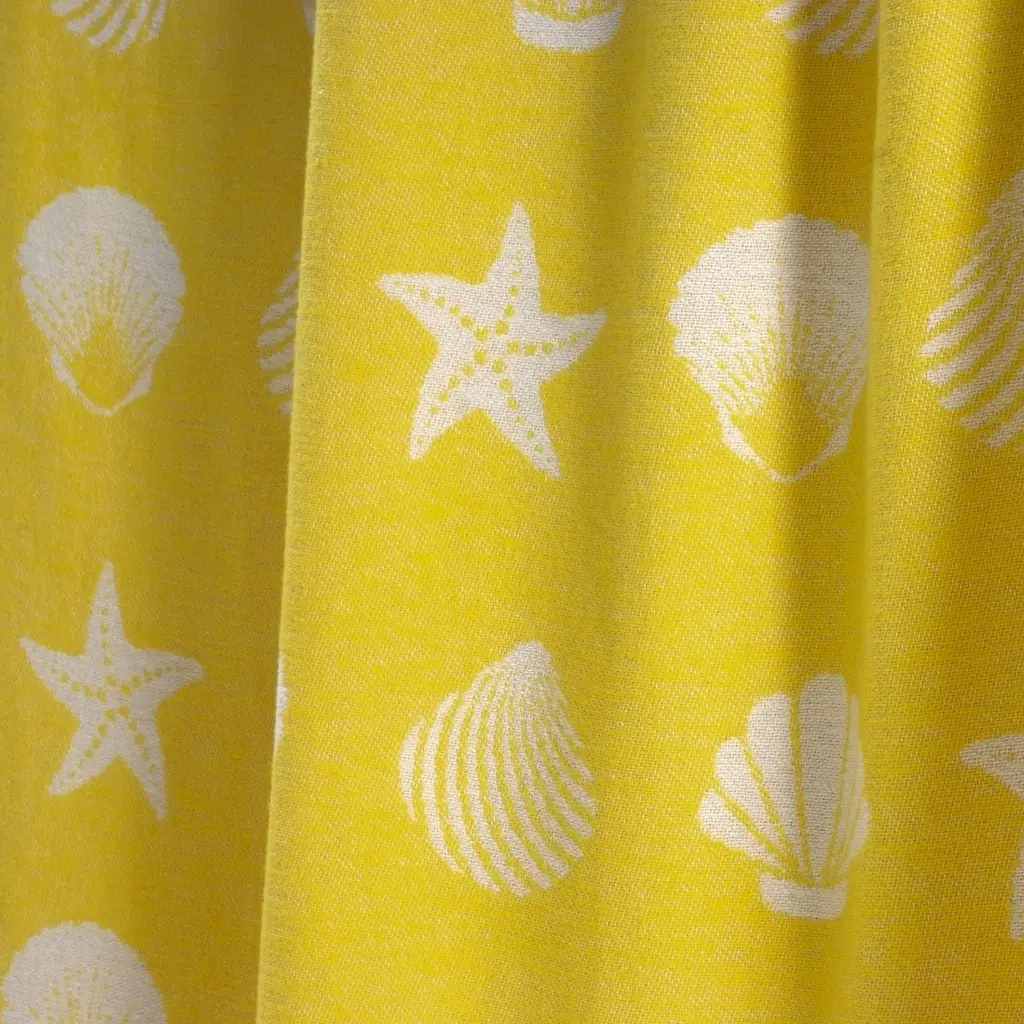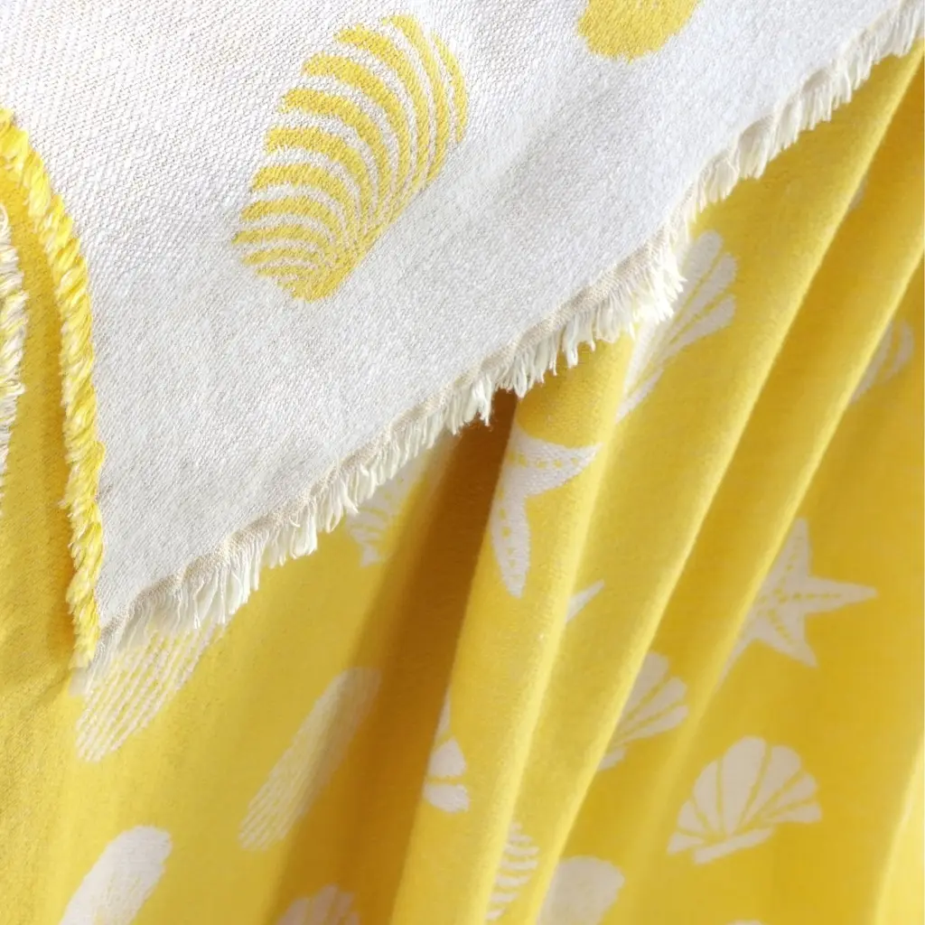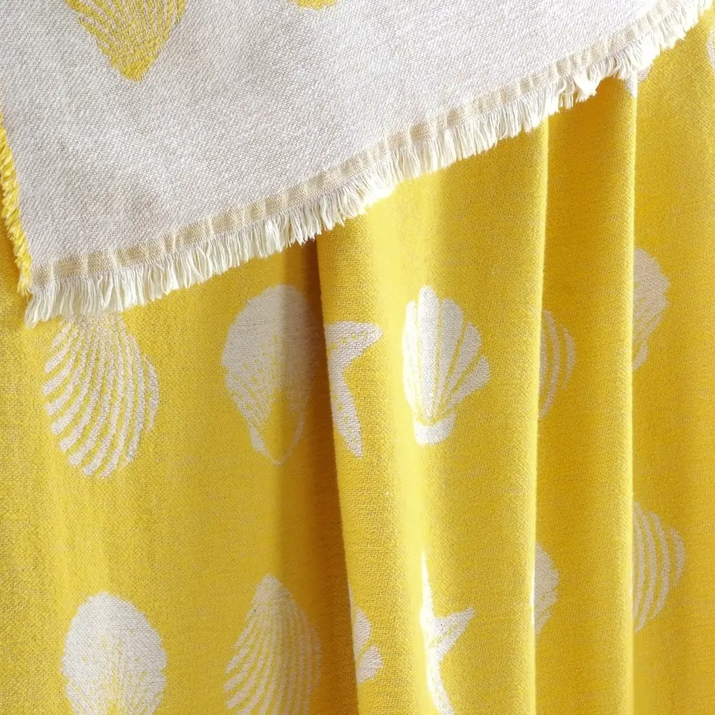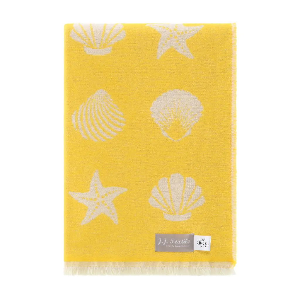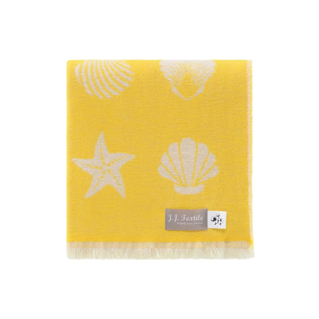 Let the sunshine in with this cheerful blanket. In a bold sunshine yellow hue, it’ll certainly brighten up those dull days when the sun doesn’t shine! With its summery seashell design, you can relive happy beach holidays every day of the year through this playfully elegant blanket. As this light blanket is woven from pure cotton, it is thermoregulatory and very breathable, meaning it’ll keep you toasty warm in winter and cool in summer. Featuring a fully reversible design and a small cotton fringe, you’ll always want to keep this versatile blanket handy all year round. This blanket makes a perfect gift for someone special. Great for housewarming presents or as a gift for any age, from new-borns to mums and grandparents.Happy living with friendly designs!130 x 190 cm (51 x 75 in)