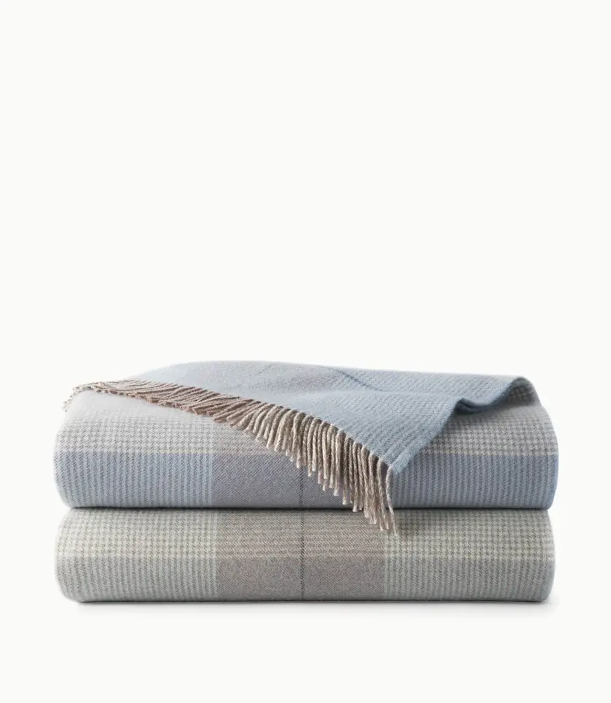 The fringed York Merino Wool Plaid Throw blanket is made of 100% super-fine Merino wool. Sourced from a 180 year old family mill in Italy, and made in Lithuania.