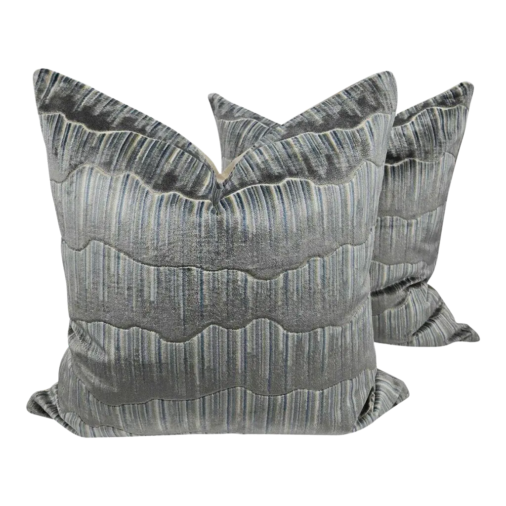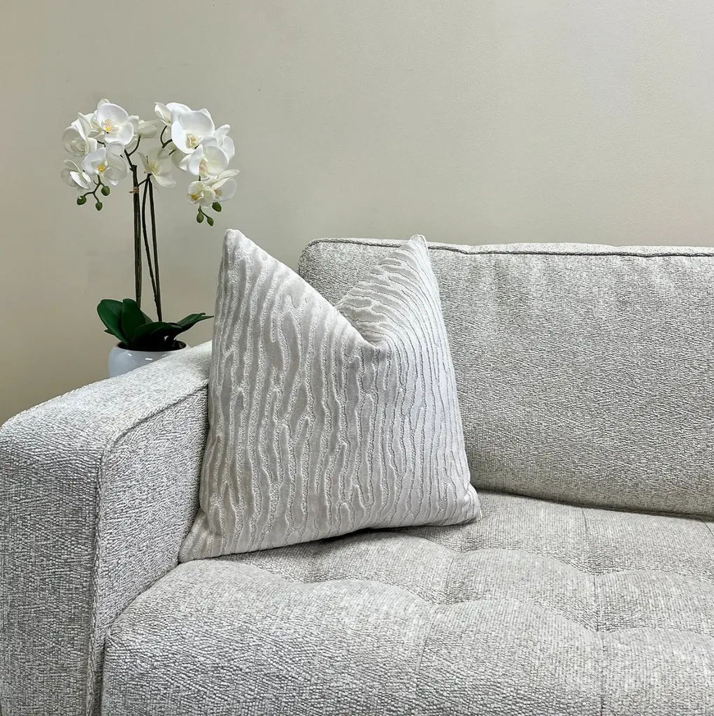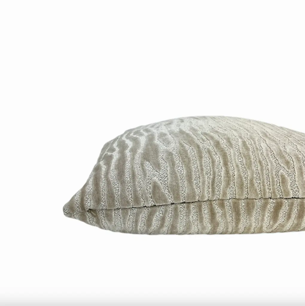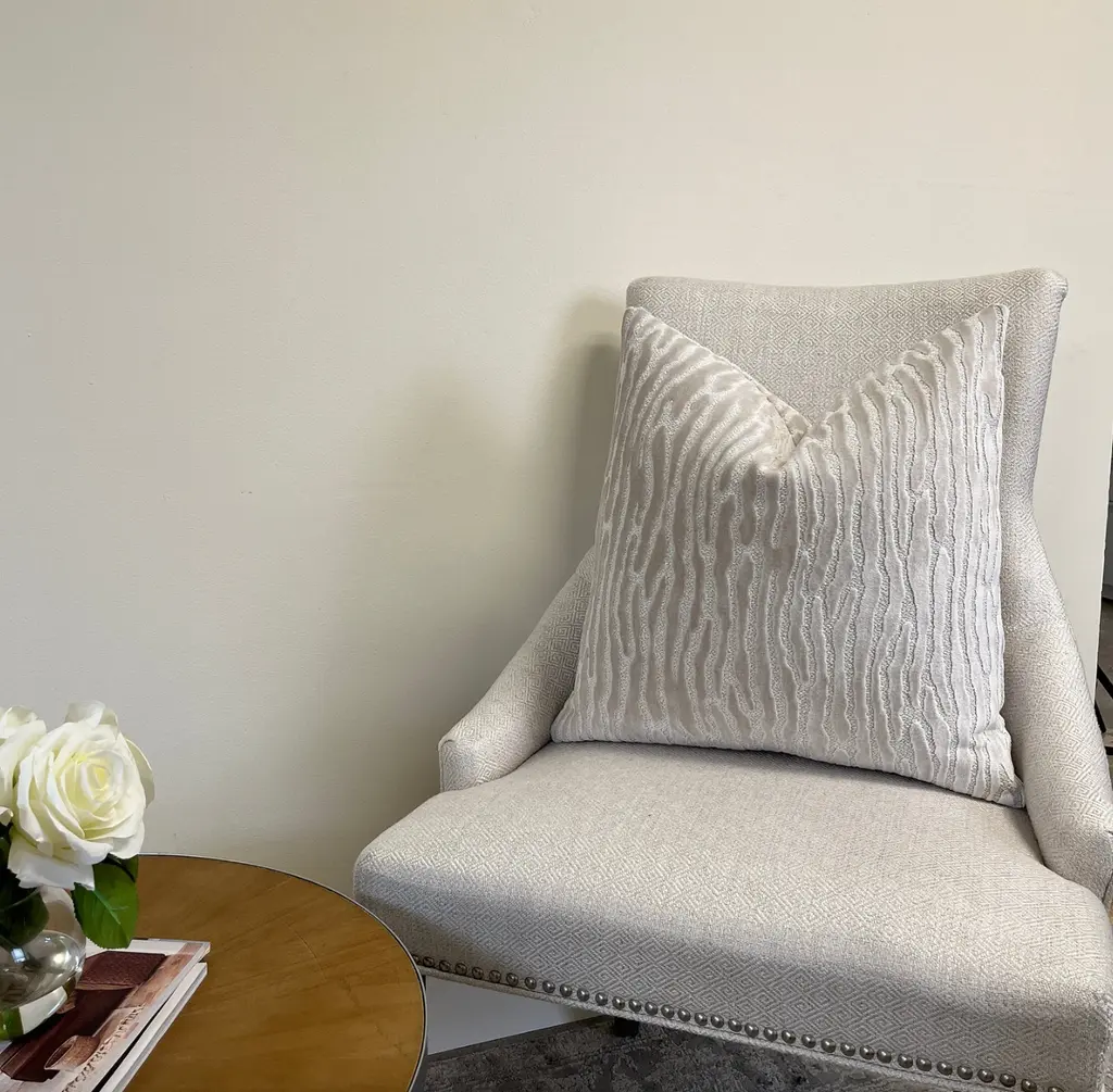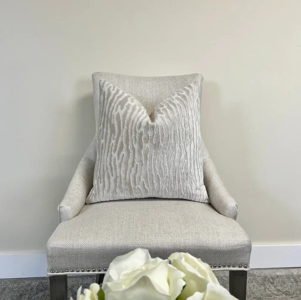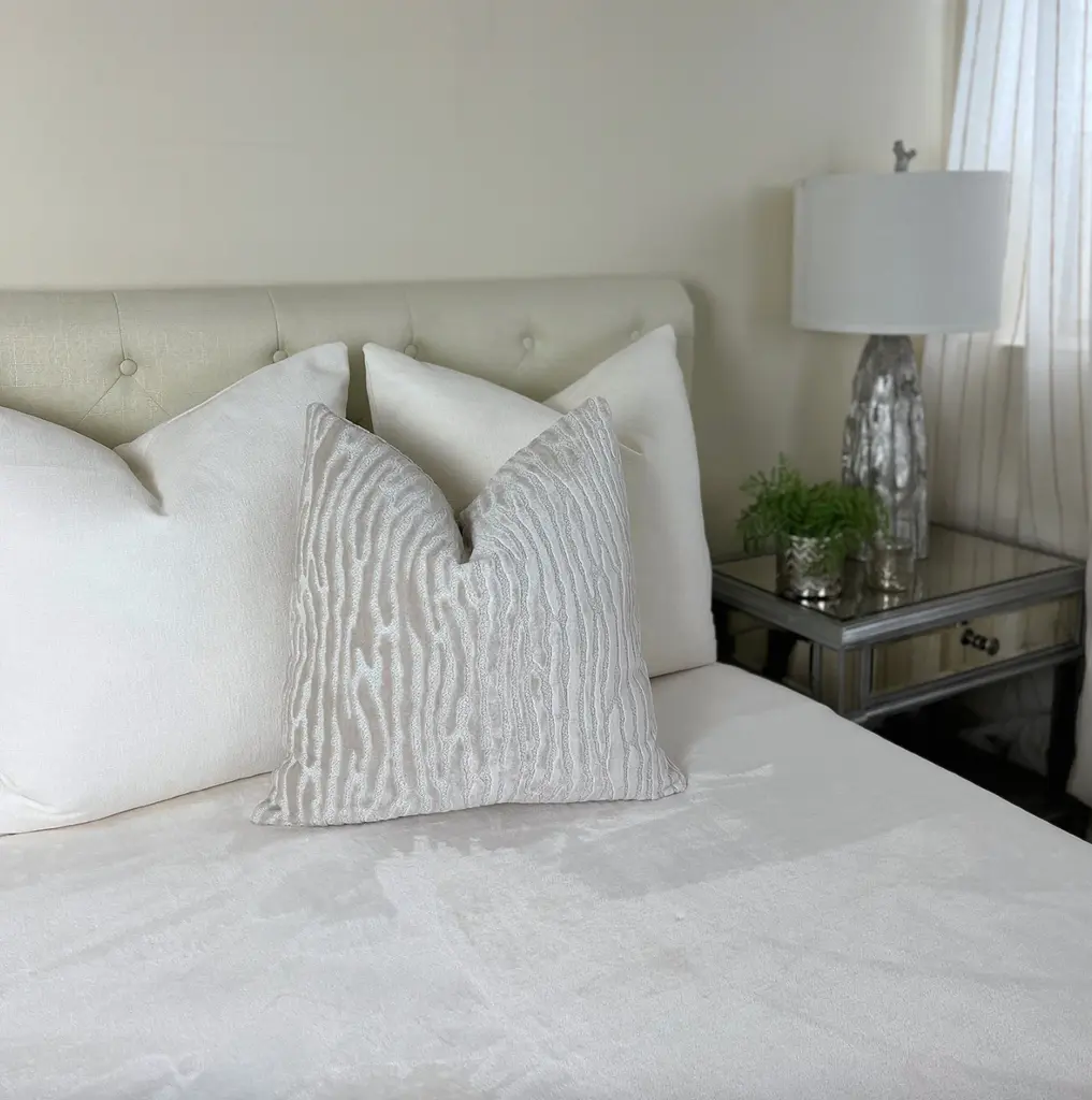 Add this rich calming alabaster cream cut velvet throw pillow cover to you pillow scape. Made of high end super soft designer quality fabric, this pillow is the epitome of luxury. The contemporary design of this unique pillow cover is fresh and elegant. The raised cut in a light beige velvet on a cream background adds depth and texture to the pillow. Mix and match it for a luxurious high end feel. All pillow covers are slightly tapered at the corners to prevent doggy pointy ears. When stuffed, the pillow will have a perfect square shape. This pillow comes stuffed with a Feather down insert. Fabric: Velvet Stuffing: 95/5 Feather Down Insert Care: Dry Clean Closure: Nylon zipper closure Made to order Will ship within 5 business days