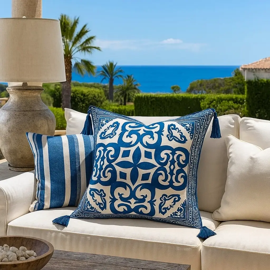 Inspired by the timeless beauty of Santorini, the Santorini SmallCushion Cover brings the essence of the Aegean into your home. Crafted in a 50cm x 50cm silhouette, its intricate blue and white tile motif evokes the island’s iconic rooftops and sunlit architecture.Finished with elegant corner tassels for a touch of refinement, this cushion captures both serenity and sophistication. Whether styled as a statement accent or layered among your home décor, it transports your space to the tranquil charm of the Mediterranean.