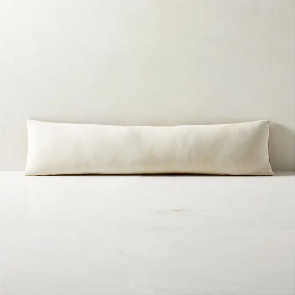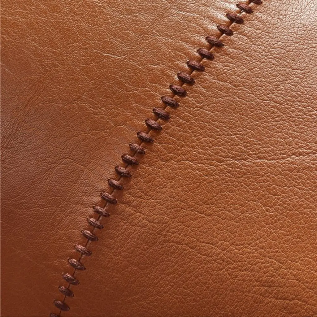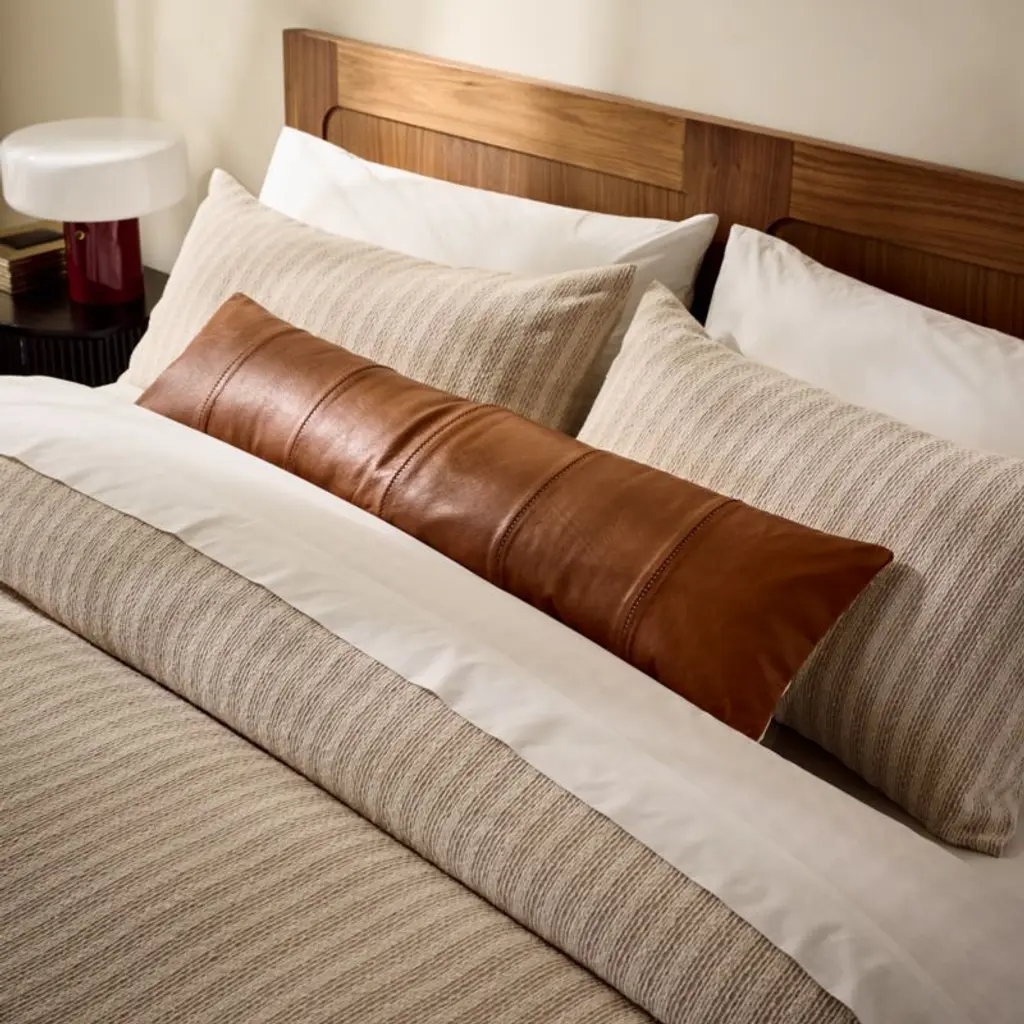 Genuine saddle leather is stitched together to create a long, luxe throw pillow. Gorgeous tonal stitching and an exposed brass zipper give the pillow a high-end feel. Flips to natural cotton/linen blend back. CB2 exclusive.