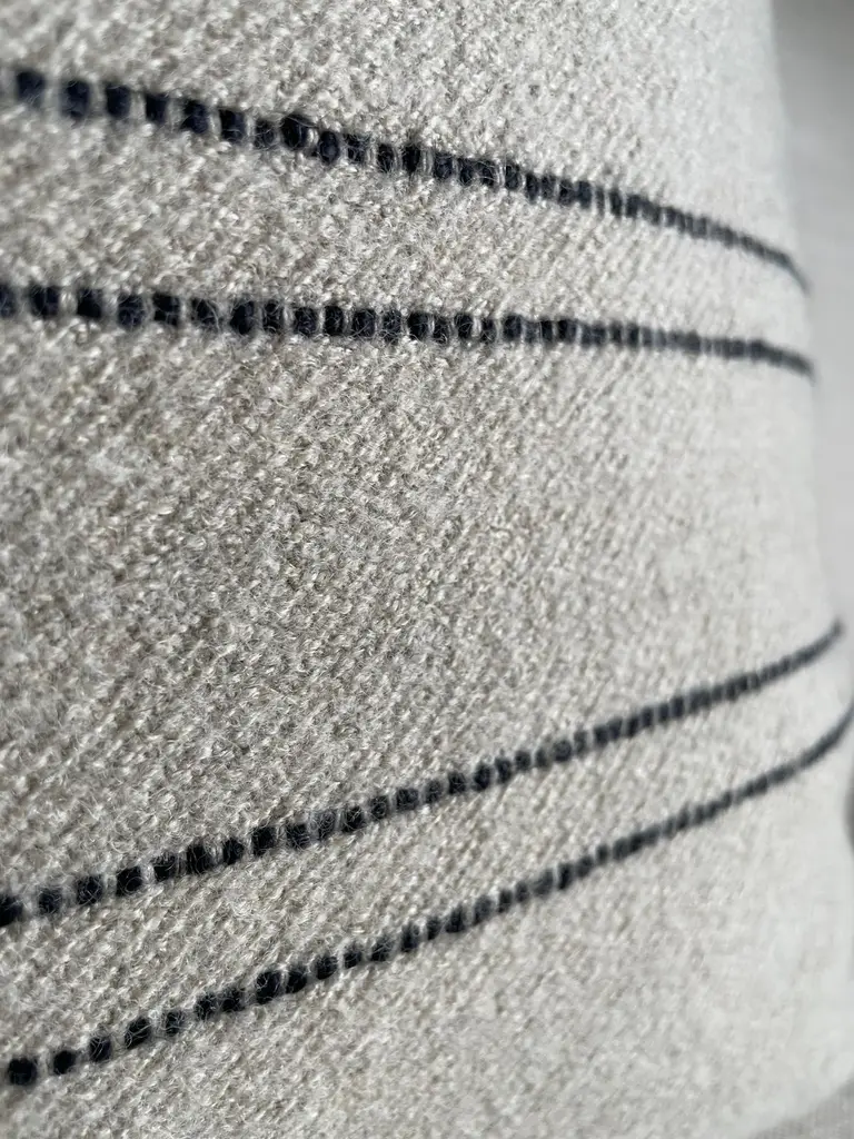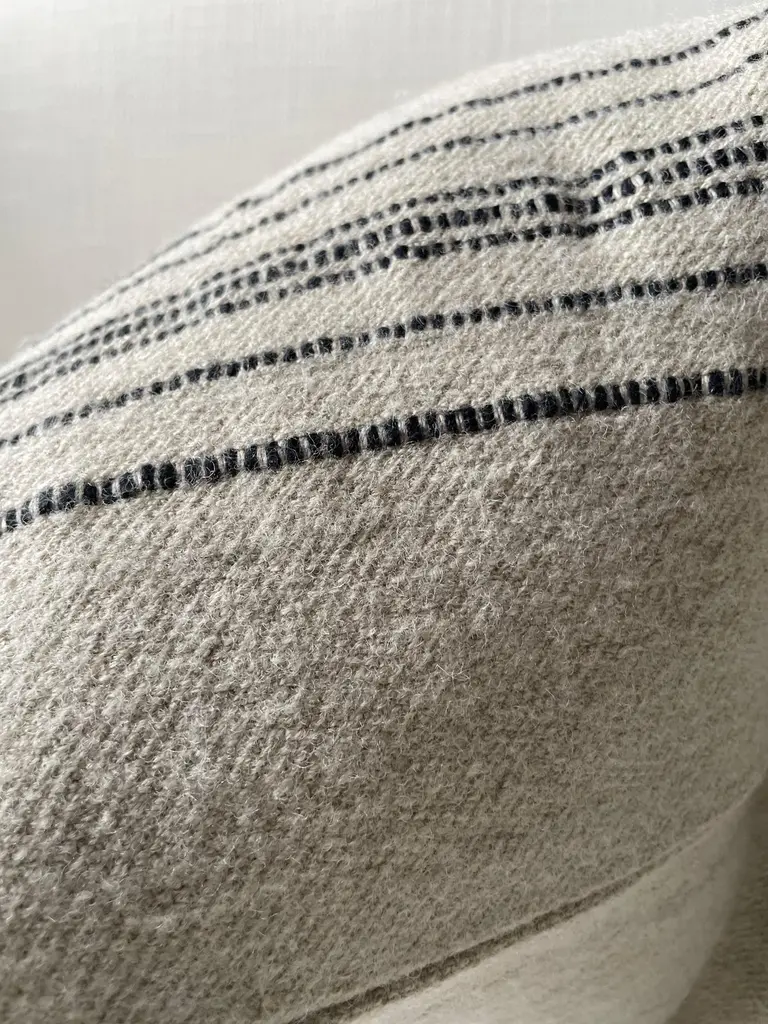 The Moroccan stripe pillow Size 25" x 25" Composition : 70% Linen, 30% Wool. Washed finish. Details : 1 cushion cover, Padding not included. 50 x 50 cm. Iron whilst linen is still damp. Made in : Belgium.Care: Please wash at max. 30°C/86°F on a wool or hand wash program. Unfold the coverlets completely before washing and do not overload the machine. Use a mild soap and avoid chlorine bleach. If possible, line dry, it's best for linen and the environment. Should you choose to iron the product, for best results, do so with steam on slightly damp linen.25” x 25”.