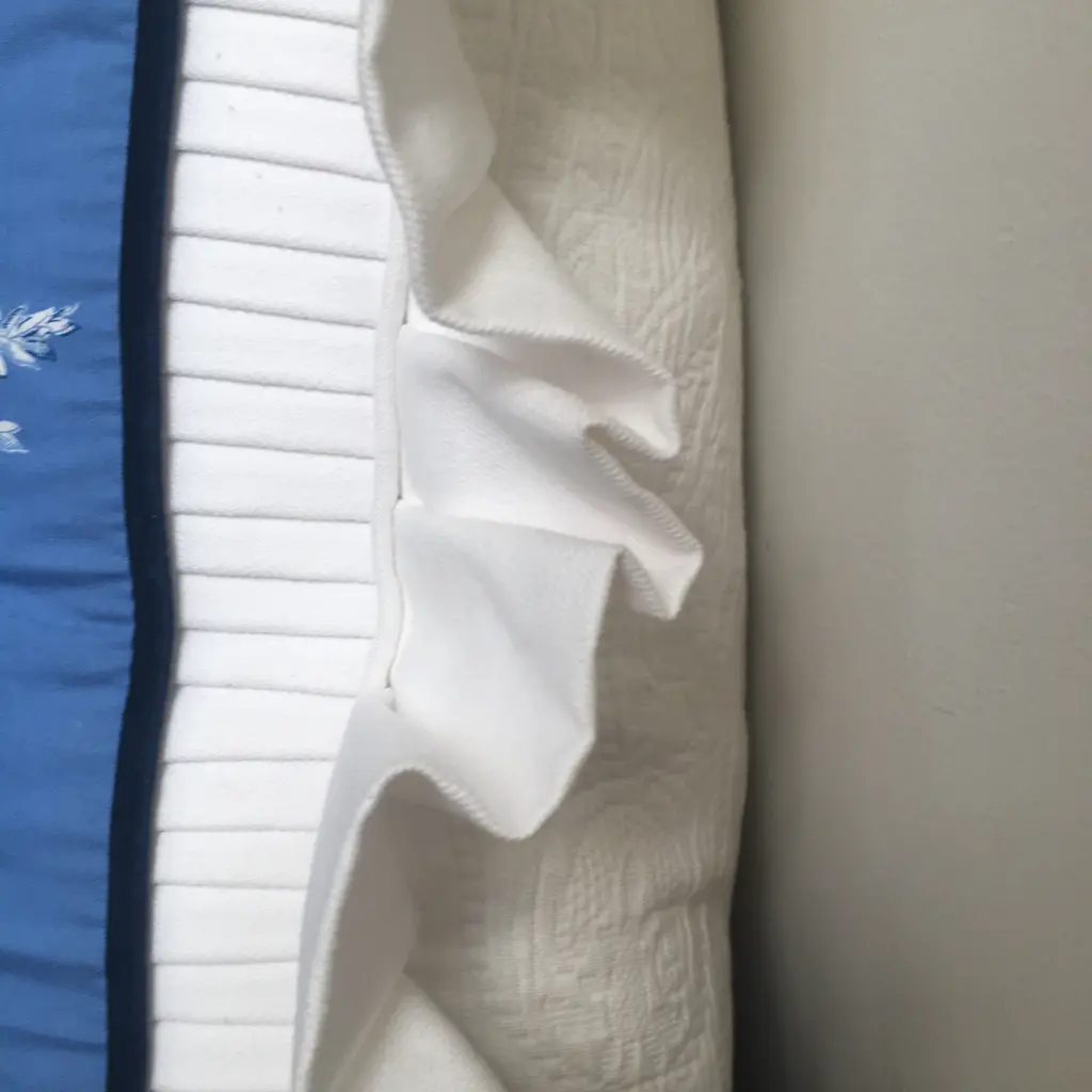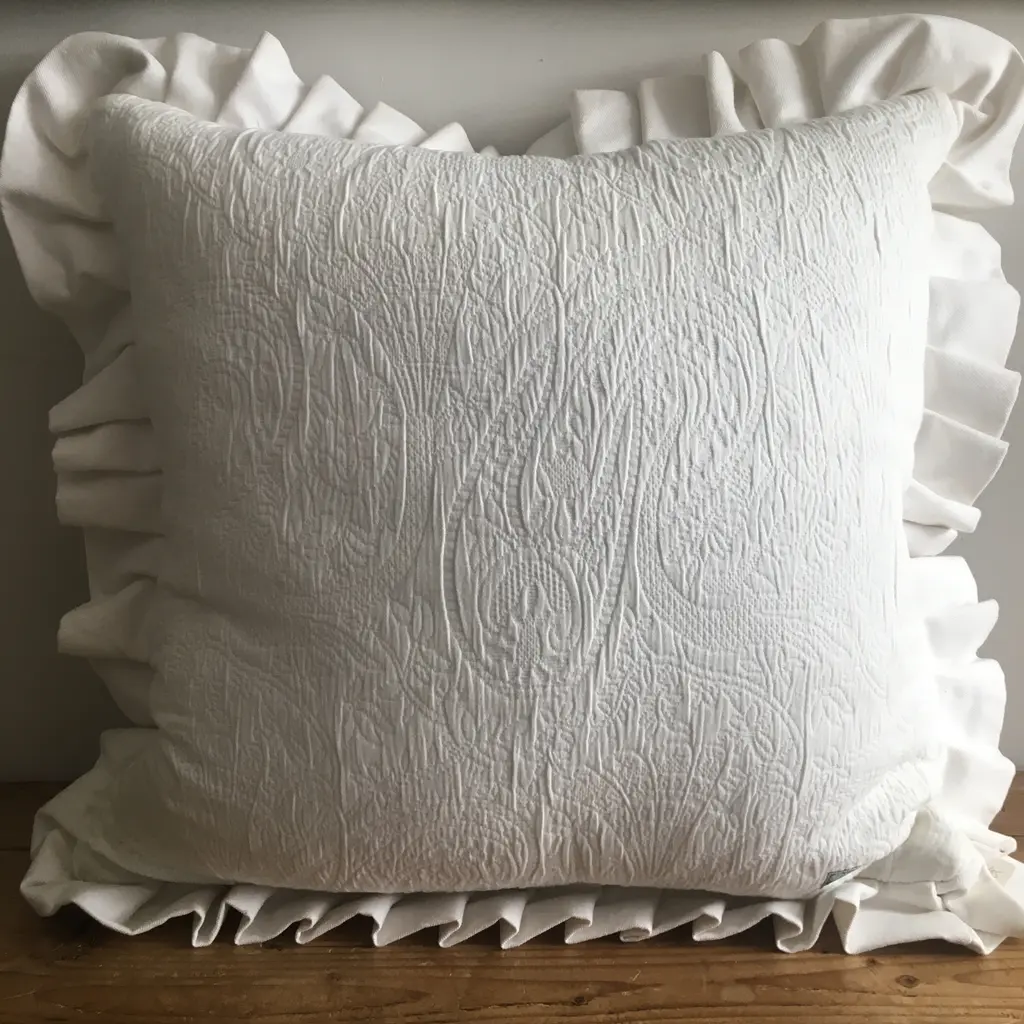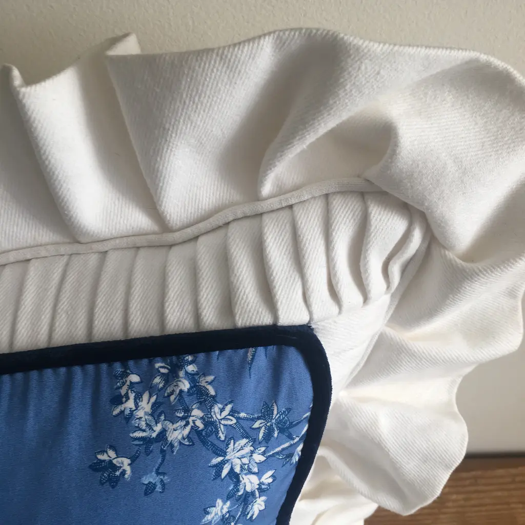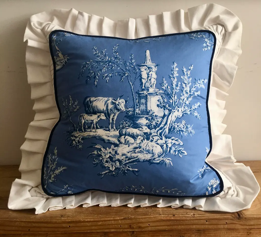 Beautiful Brunschwig and Fils Pastoral French de Jouy blue and white toile fabric used to create this pillow. 22" square finished with a 3" pleated flange like a ruffle! Centered blue and white toile panel surrounded by navy velvet piping, and crisp, tailored white pleated band. Reverse side finished with a crisp, white matlasse pattern. Zippered closure. Inserts not included. Beautiful craftsmanship and detail.