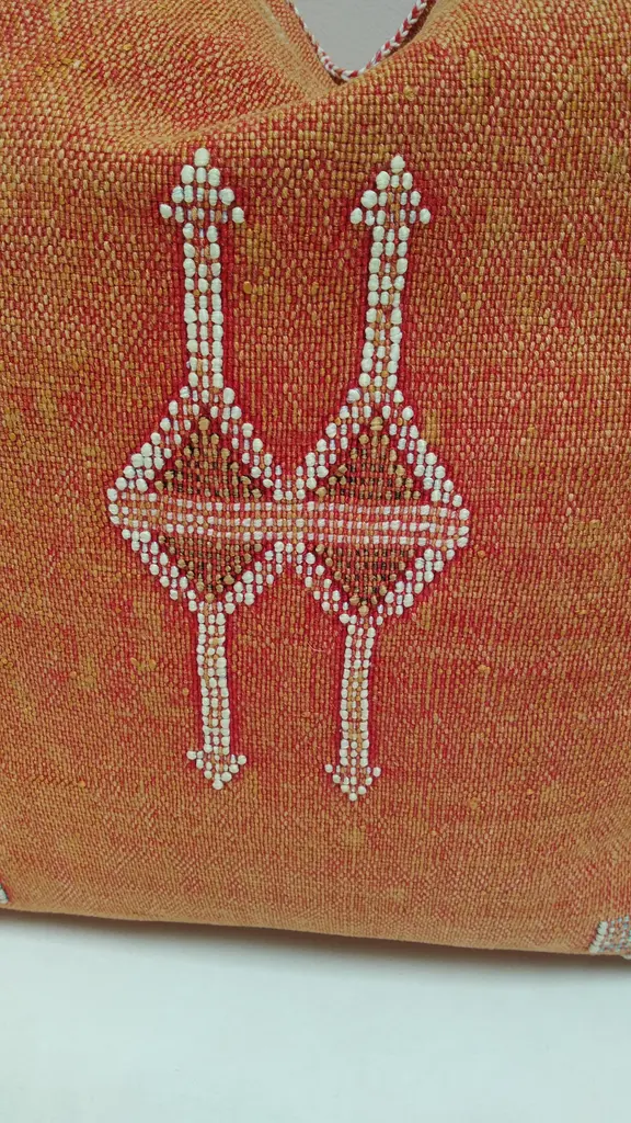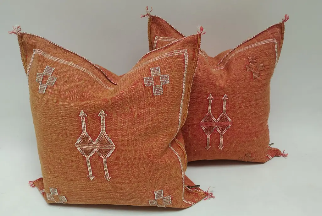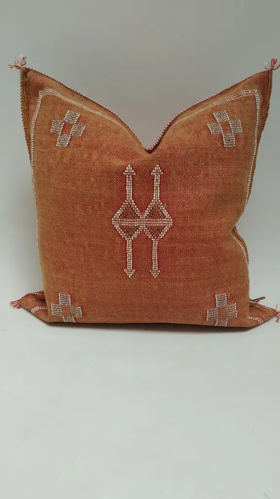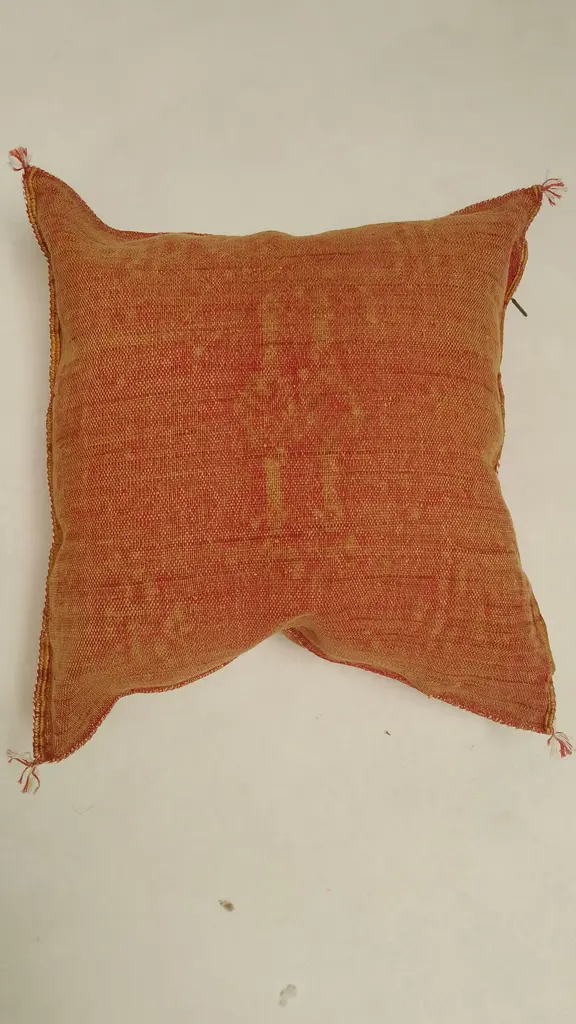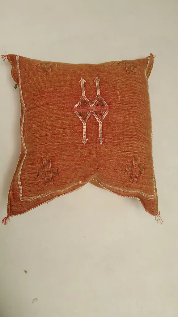The Moroccan Cactus pillow is a masterpiece handcrafted by local Berber artisans. This carefully decorated pillow is a unique piece of art that should be in every home. - Sabra pillow is 100% handmade. - 100% handmade and handwoven. No chemicals were used in the weaving process. - This pillow is Moroccan made, handcrafted from Aloe Vera silk, commonly known as vegetable silk, Sabra silk. - 100% handmade and handwoven. Mixed inscriptions at the front. - Zipper on one side. Washing Instructions: Dry Clean Only, Avoid Contact With Water. Features and Dimensions: * Approx Size: 20in x 20in / 50cm x 50cm (+/- 2 inch due to the handmade nature of the item). Origin: Berber handmade in Morocco. Condition: in excellent condition! Does not include the filler, the product is empty.
