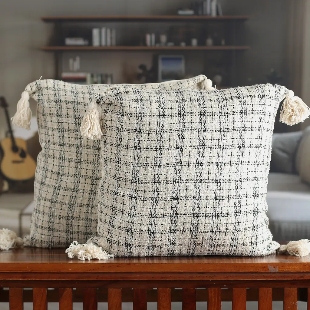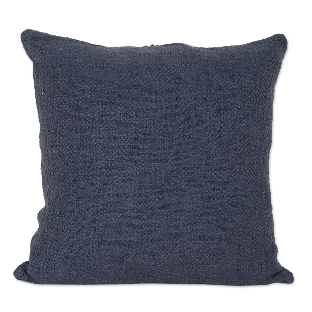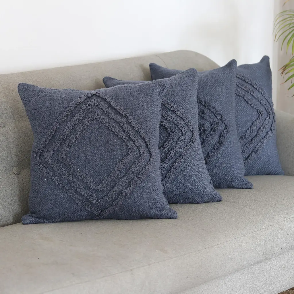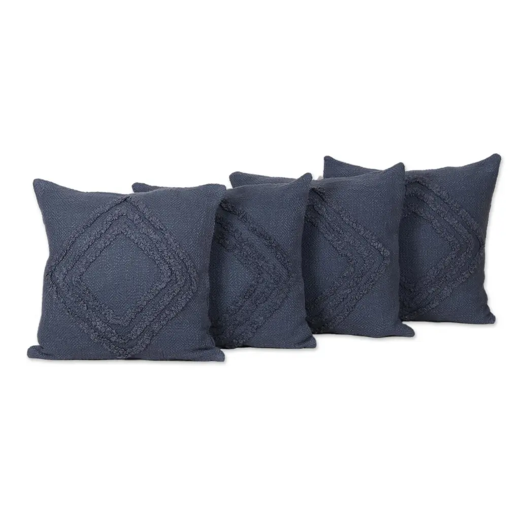 Embroidered with a fluffy diamond motif, Sandeep Malhotra's four-set of cushion covers add soft texture and beautiful color to your living space. Indian artisans craft the set from slub cotton, using tufted embroidery work to create the diamond pattern. Each cadet blue cushion features a zippered closure for inserting and withdrawing your favorite cushions.