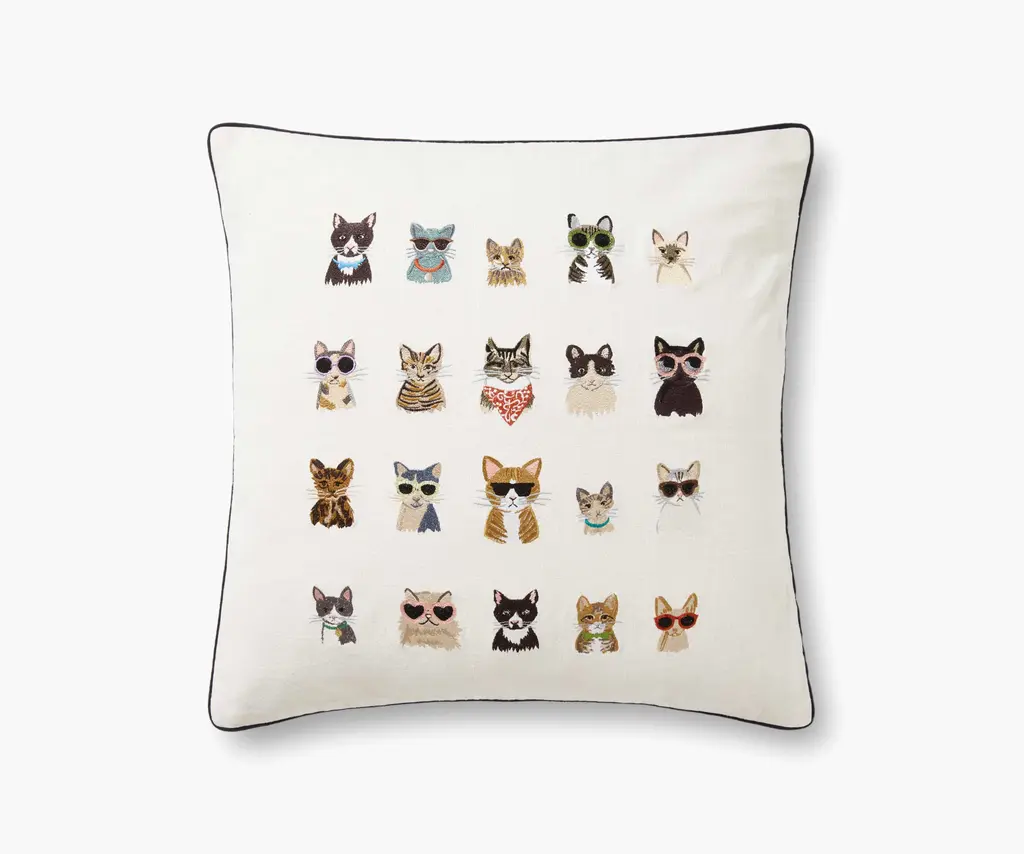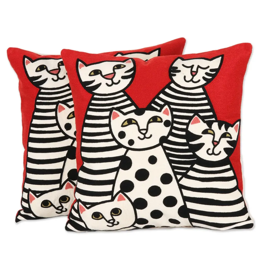 Cat-Themed Embroidered Cotton Cushion Covers (Pair)- Cat Family