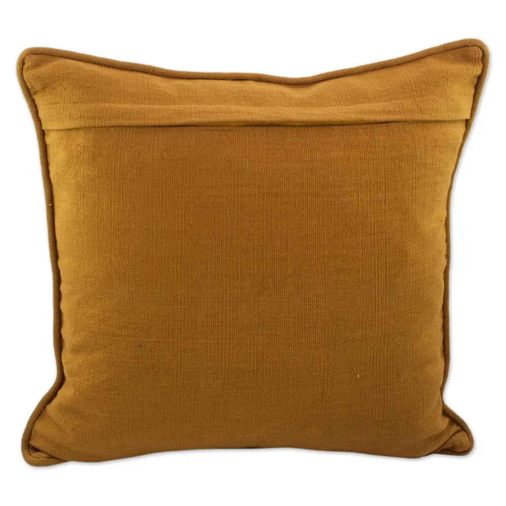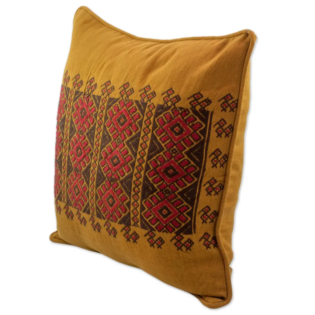 "The inspiration for this square cushion cover comes from the beautiful sight made by the sun when it rises and falls over the mountains. It's as if they fuse together," artisans from Women United for Artisan Development explain. The Guatemalan artisans weave the cotton cushion cover in a spicy cinnamon hue featuring chili red suns and escorted by chocolate brown birds. The artisans border the square cover with cording and include a zipper closure on the back.