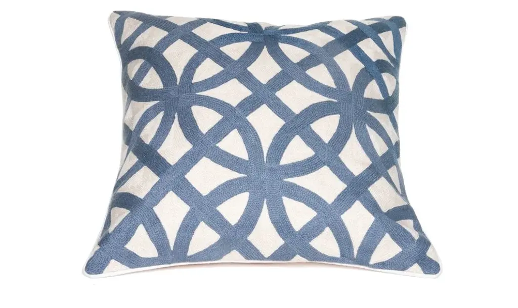 Decorate your sofa or bed with the Circles Crewel Cashmere Embroidered Pillow. Featuring a white piped edge, this pillow is handmade and features blue cashmere embroidered circles overlapping each other on cotton fabric. Dry clean recommended. Pillow cover only.