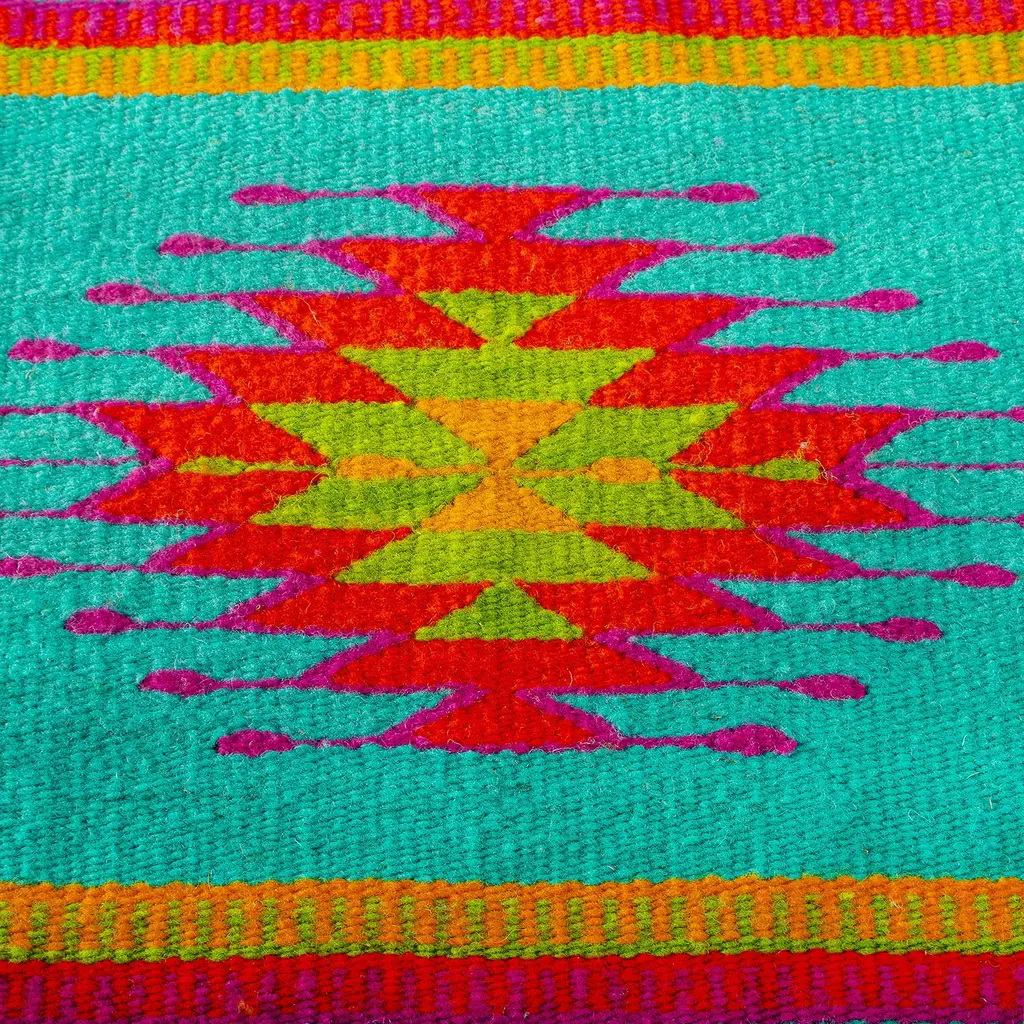 This stunning cushion cover is created by Mario Chavez in Mexico, who works with wool that has been tinted with natural pigments. The hand loomed cushion cover features a traditional Zapotec design in vermilion, magenta and yellow on a background of sea green. A zipper on one side allows for easy insertion of a cushion.