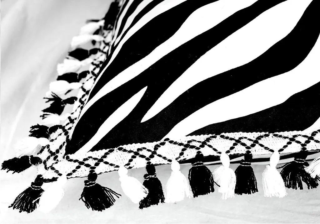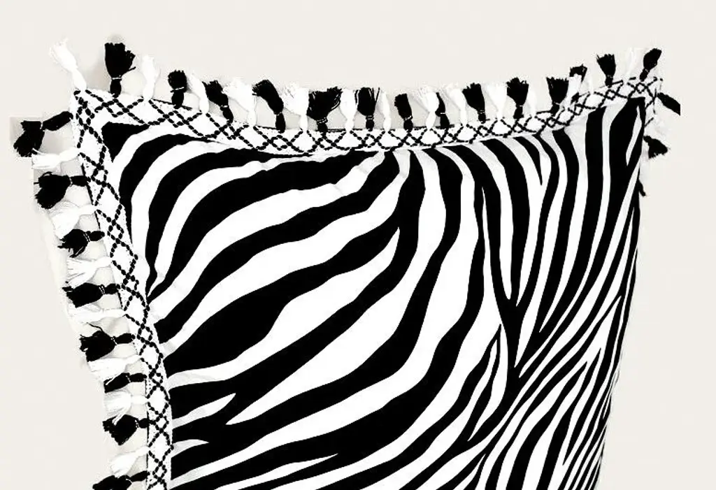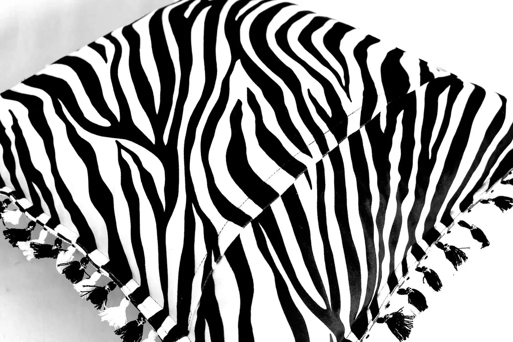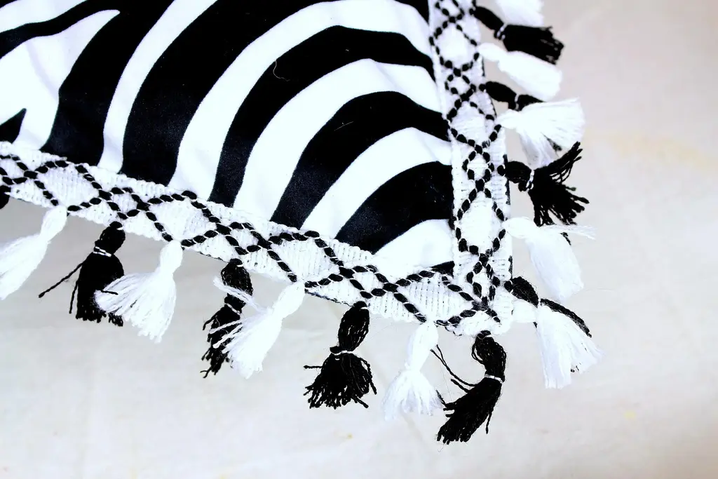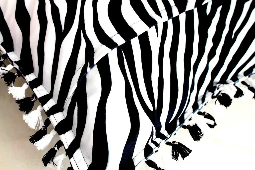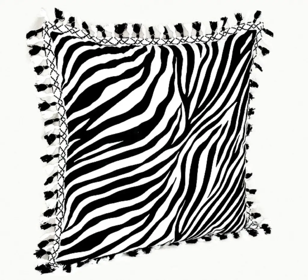 From high end design house, Scalamandre, comes this exuberant Zebra Print Textile Fabric in rich black on a white background. Revered for its incomparable quality, taste and style, Scalamandre has fashioned the fabric of the Scalamandre Zebra Print exclusively for Frontgate's collection. The iconic zebra print instantly brings exotic vibrancy to your space. Velvet Suede Zebra Print Pillow Sham is perfect for homeowners with sophisticated tastes in Decoration Home. The fabulous color revives this piece with an elegant appearance to complement your Room a chic feeling. Beautifully soft, this throw pillow cover will become a focal point wherever it is placed. Add it to a bed, office or sofa in the living room. It can also be coordinated with matching accessories to create a consistent theme. Scalamandre is a well-known manufacturer of the finest quality fabrics for over 80 years. As the leading American purveyor of decorative fabrics, Scalamandre has been called upon by some of America's most extraordinary properties, including the White House. How can you not love the iconic and oh so whimsical Scalamandre Zebra pillow sham! Details: Made on both sides from a premium Velvet Suede fabric with a zebra pattern, making it comfortable. This pair has a beautiful lively black & white zebra print design on both sides. All the edges are professionally embellished with Black and white Boho fringes and a decorative flanges edges of 1 inches, approximately, detailed with a geometric trim. I have made a flange stitched around the outside edge. Adding a flange allows you to have a larger looking pillow while using a smaller pillow form. The corners are professionally hand sewn forming MITERED CORNERS: A technique in sewing. The all-weather construction of these designer pillow covers will hold its color and shape through seasons of use. Printed with weather resistant inks on woven acrylic. Resists fading, mold and mildew. The Art of Centering the fabric: I have used exactly the same zebra print on the front side on both pieces and a different and exactly same zebra print on the back side of both pieces. I have meticulously centered each pattern, which causes much more loss of fabric. Having lost more than half the fabric! To make ZIPPERED pillows with an envelope opening: I have sewn a Black zipper (2 inches shorter) near to the bottom of the back side and made a stitch trim so that the fabric will be held in place and not be caught in the zipper teeth. A zipper closure in the back of a pillow keeps the pillow cover on the pillow form but allows it to be removed for easy laundering. Care Instruction: Spot clean with mild soap and water; air-dry only. SIZE: Internally Measures, approximately 21.65X21.65 inches/ 55x55cm. Externally Size 23x23 inches/ 59 cm. witthout fringes. Pillow inserts are not included. Each pillow cover fits perfectly in an insert 23x23 inches or 24x24 inches, more tight. Shipping Details: This listing will be send by DHL Express. The shipping takes to USA between 2 and 5 business days, approximately.
