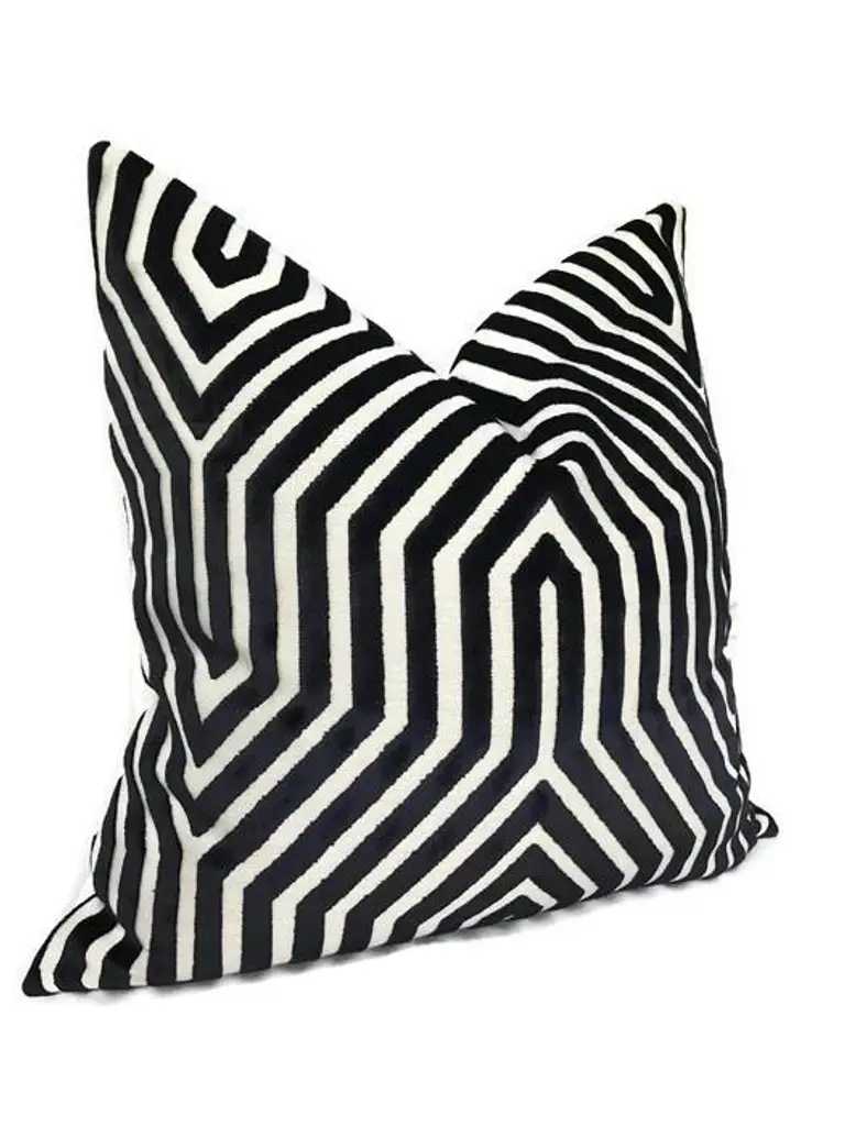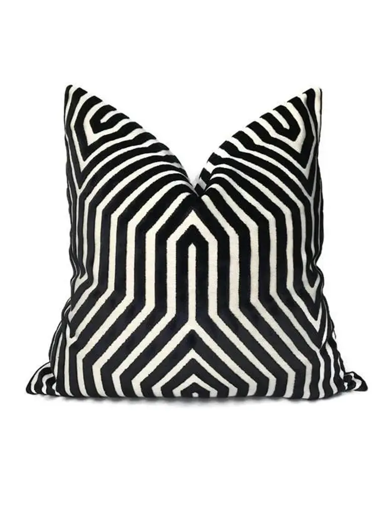 Add A New Look By Using Pillow Covers Made of Designer Fabric! Unused Pillow Cover- Made to Order On the Front: Vanderbilt Cut Velvet Fabric in Noir/Black On the Back: Ivory Velvet Fabric All pillow covers are sewn professionally, over-locked with finished edges to prevent fraying and has invisible zipper enclosures. This provides long lasting, durable covers that will stay straight and beautiful over time, which makes for a clean professional look. Swatches Available, if you would like a swatch of this fabric, please contact us!
