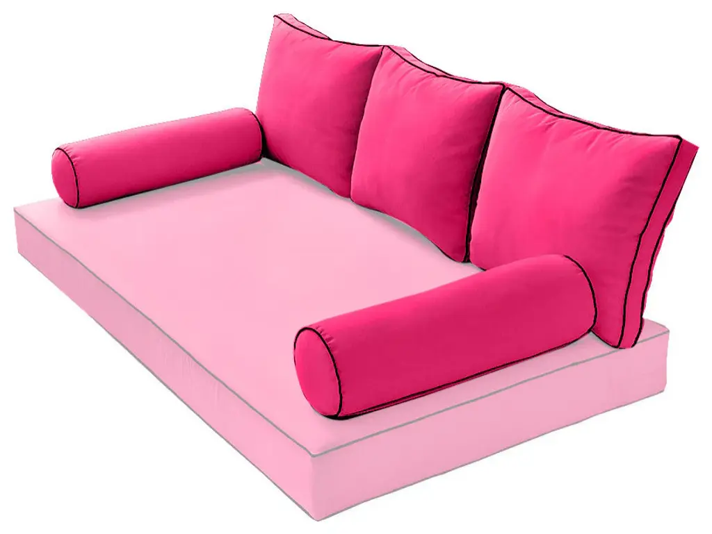• Style-3 Twin Size Contrast Pipe Trim Bolster and Back Pillow Cover Set• • Mattress and Insert Not Included• • 2 x Bolster Pillow Cover Only: 27" x 8"• 3 x Back Pillow Cover Only: 24.5" x 20" x 5"• Color: AD110• Edge Trim: Pipe Trim ( contrast color )• Fabric: 230 Gram Polyester Upholstery• Hidden Zipper• Water Repellent • Not Water Proof• • Tips: Please cover or store cushion pillow in rainy season• Cleaning: Soap clean and rinse off with water hose. Outdoor durable!• Quantity: 1