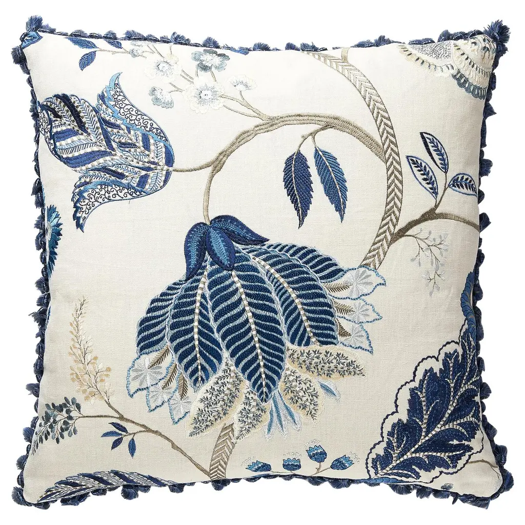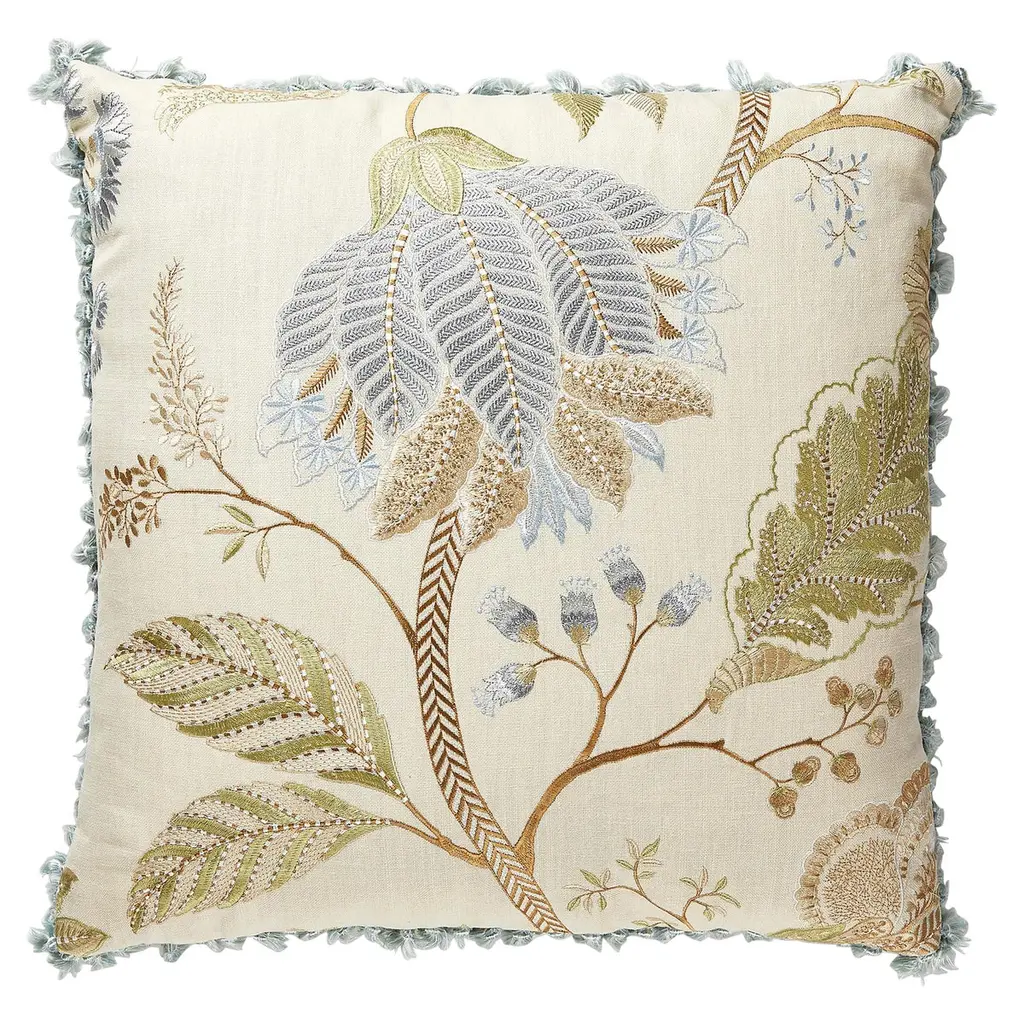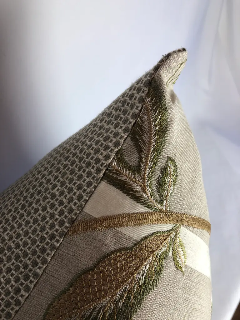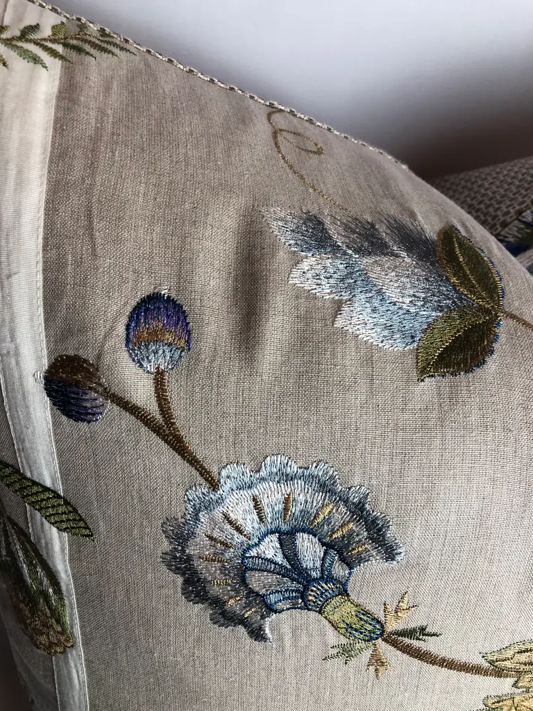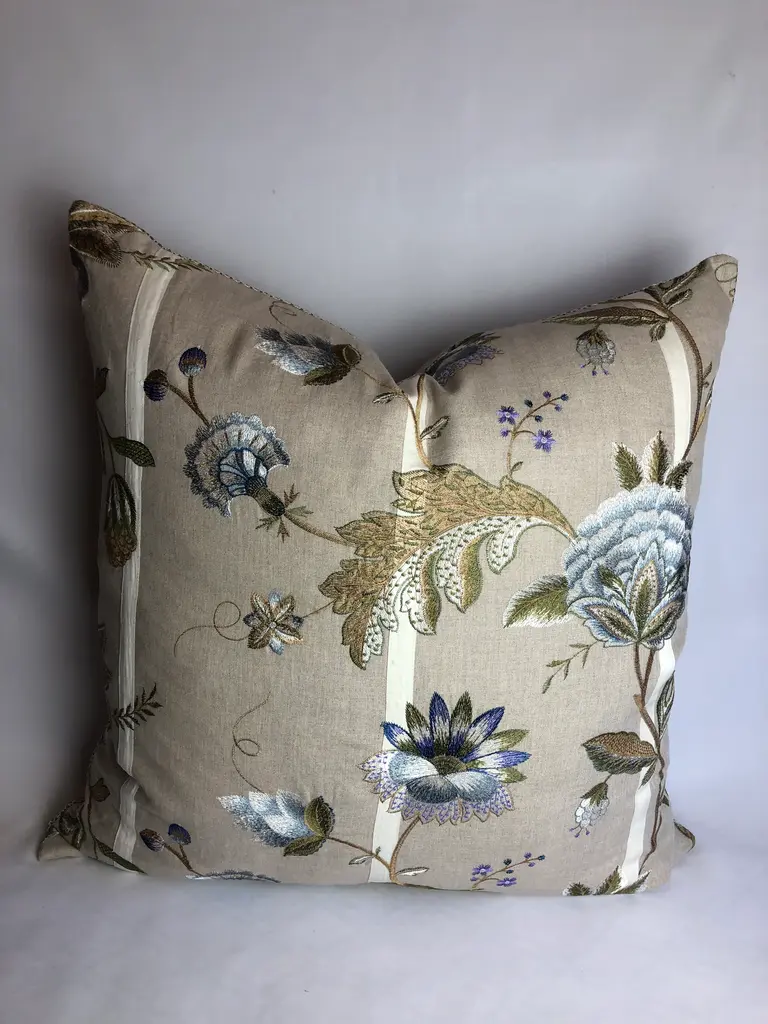 This beautiful linen fabric has embroidery over cotton ribbon. It is a natural linen color way, the ribbon is almost white with heavy embroidery in blues, hydrangea purple and greens of various shades. The reverse side is a textured woven fabric of olive khaki and natural from Kravet. Insert is 90/10