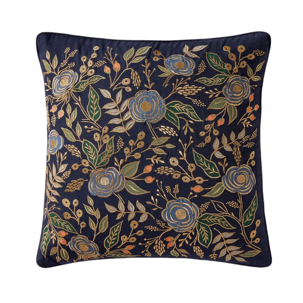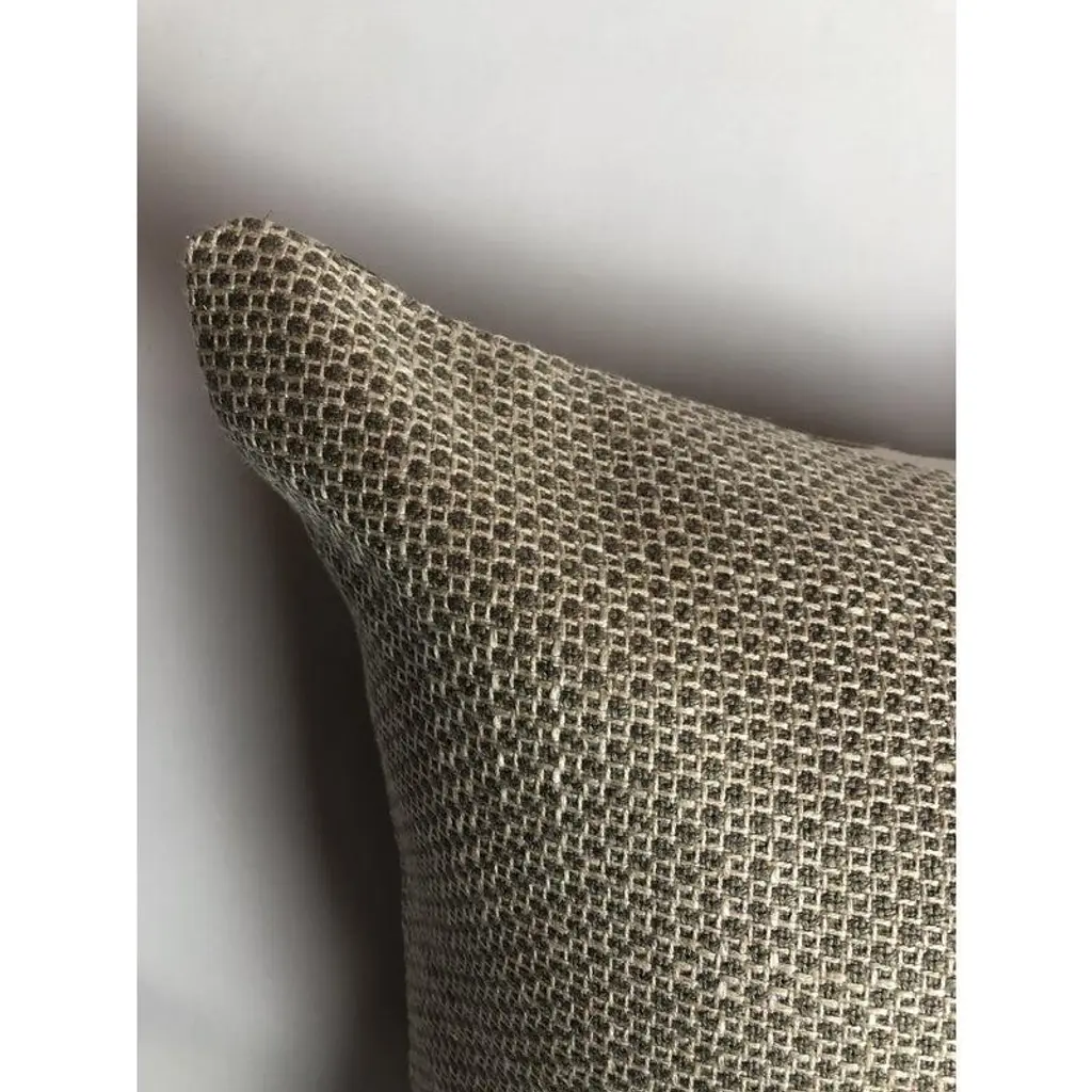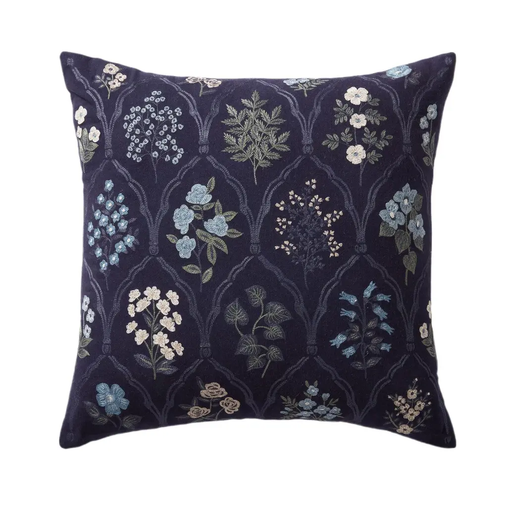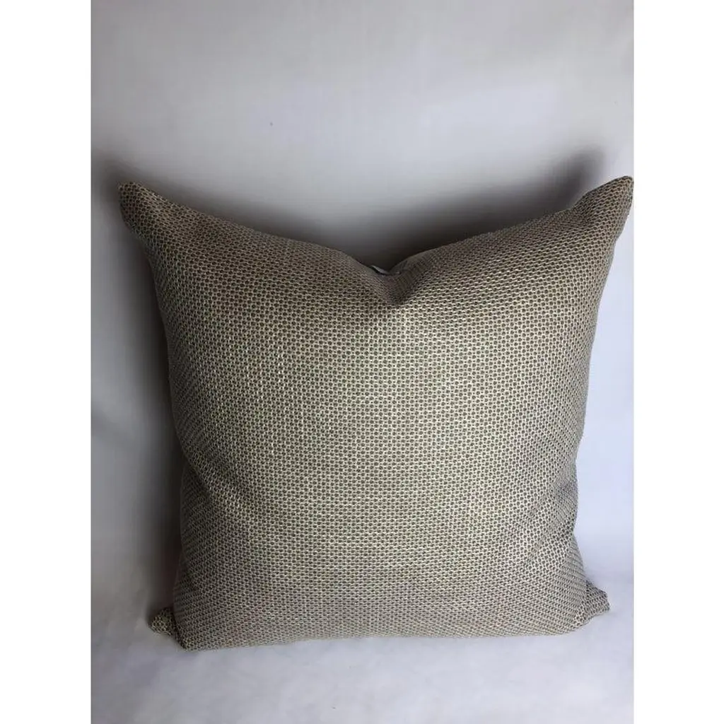 This beautiful linen fabric has embroidery over cotton ribbon. It is a natural linen color way, the ribbon is almost white with heavy embroidery in blues, hydrangea purple and greens of various shades. The reverse side is a textured woven fabric of olive khaki and natural from Kravet. Insert is 90/10