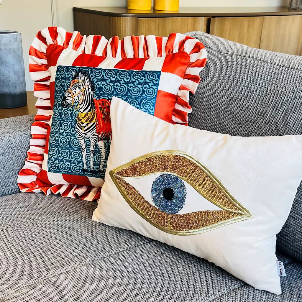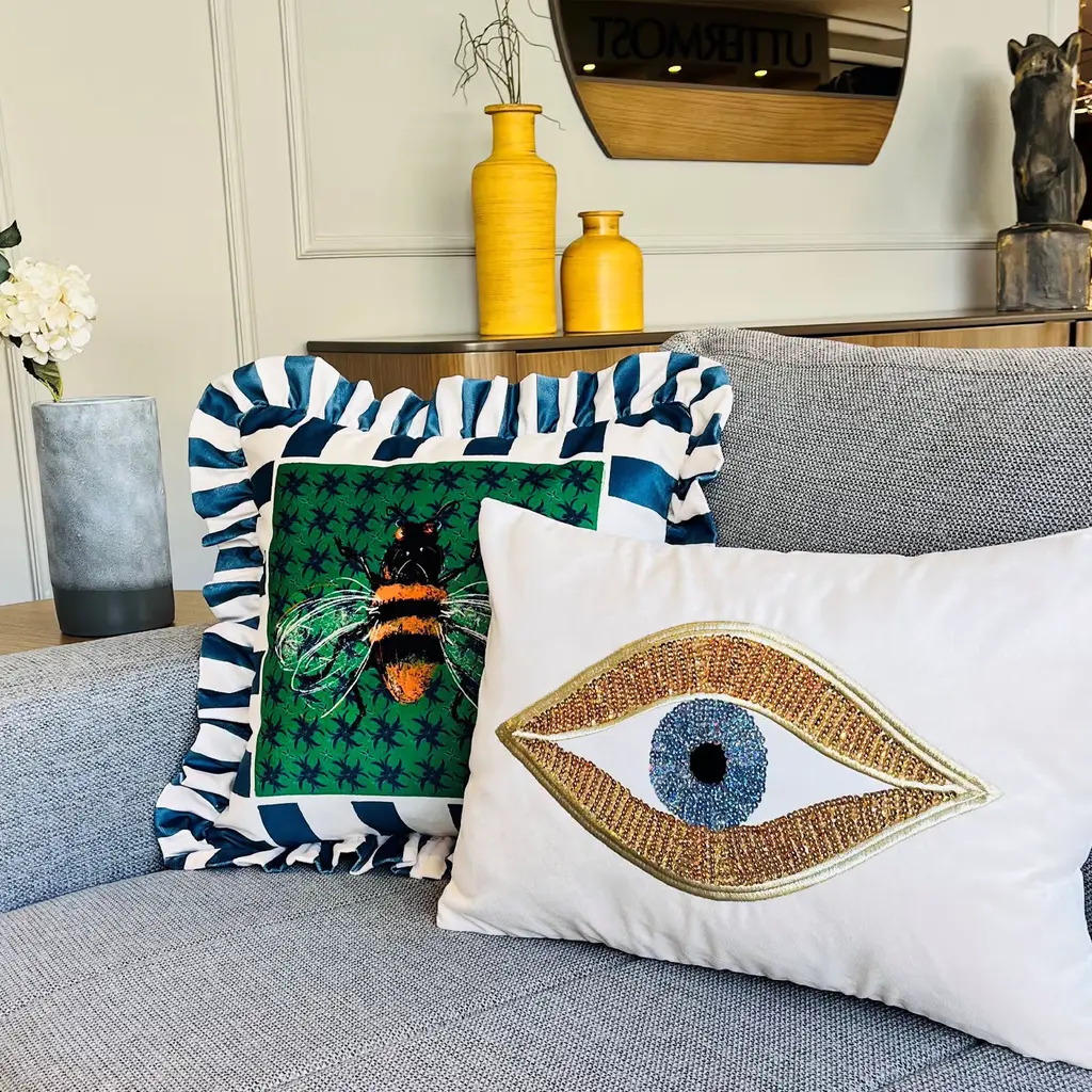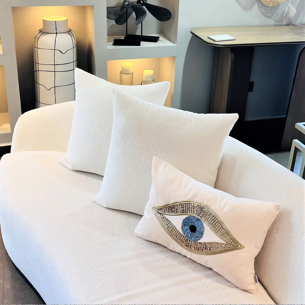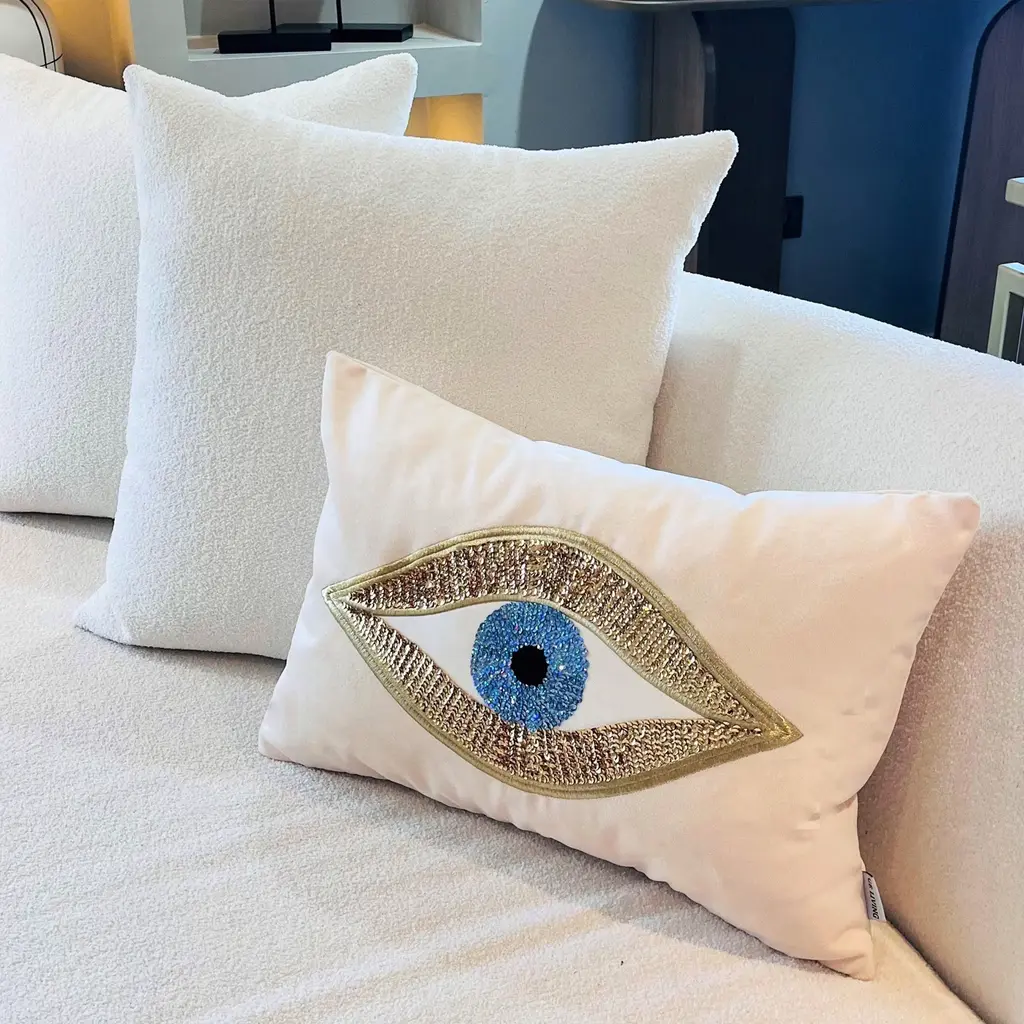 Cream Velvet Evil Eye Pillow Cover – Gold Sequin Accent Cushion