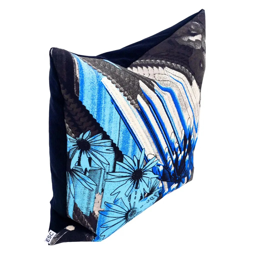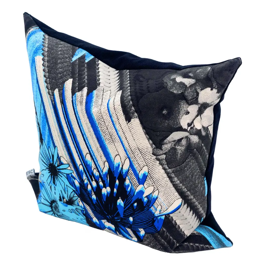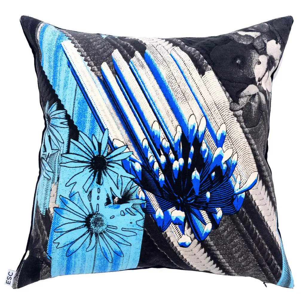 A cushion cover with unique double sides: featuring original artwork on one side by renowned British artist Weirdcore, known for his mesmerizing visuals for the world’s most admired musicians, and the finest cashmere-blend wool fabric from a prestigious Japanese manufacturer on the other. The one-of-a-kind artwork brings a contemporary and stylish accent to any living space.The artwork reimagines flowers as geometric shapes, likened to flying electronic sounds, and is coloured using five tones (printing plates) derived from a glacial colour palette.Multiple layers of silk screen plates, meticulously crafted by plate makers in Kyoto, are brought to life through the expert colour mixing and printing techniques of dyeing artisans in Tokyo, resulting in vivid and richly textured prints.