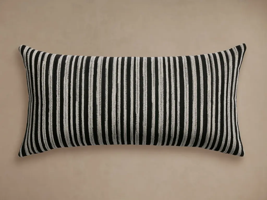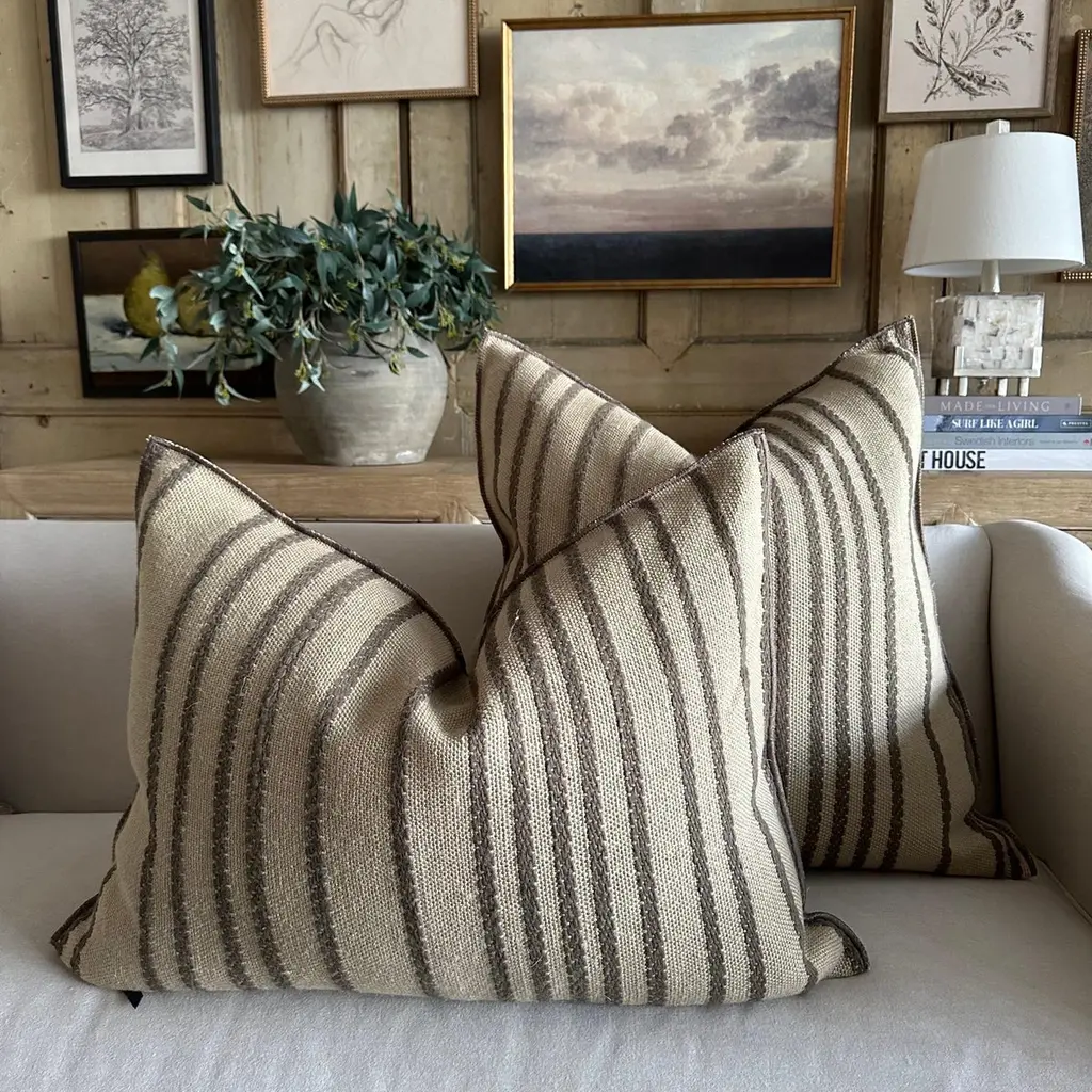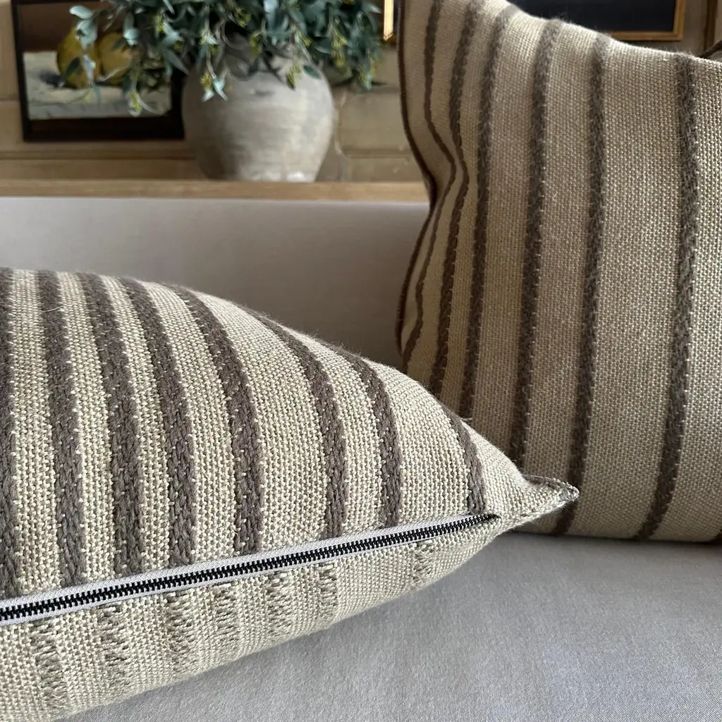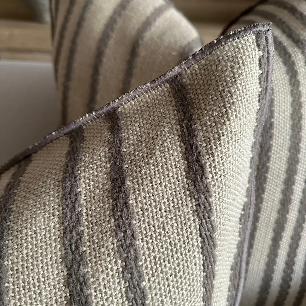 MDV Embroidered Myre Rayure Color: Ecorce (a bronze with gray hues)Size 20x28A beautiful natural flax, heavy weight linen, with a deep dark gray bronze embroidered stripe pattern. These pillows are crafted from a luxurious wool, and linen blend, this standard sham size pillow will bring a natural element of softness and texture to any setting. The binded edge make these so unique by adding that extra detail. Limited quantities available. This item does not include an insert, and any standard size bed pillow will fit this cover.This pillow has a soft nubby texture, a stitched edge, finished edge and brass metal zipper closure.