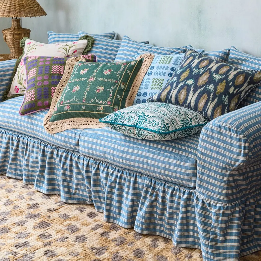 Embroidered and elegant. Needlepoint’s sturdy embroidered stitch lends it longevity. Made in India by a collective of women artisans, this 100% cotton pillow’s crocheted, ruffled edge adds charm.